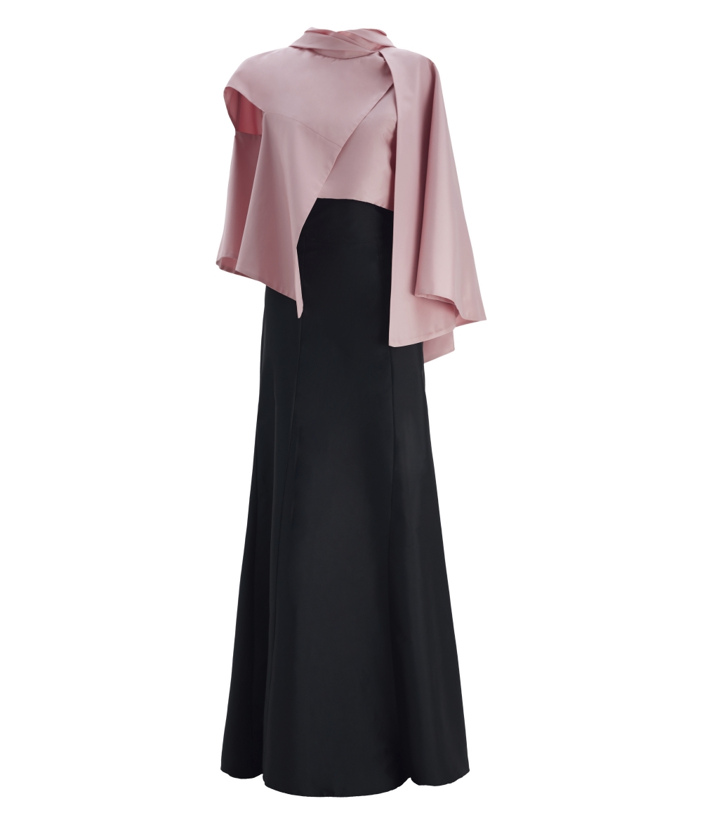 Blusa confeccionada em tafetá rosé, tecido de leve brilho acetinado e estrutura refinada que proporciona volume e caimento sofisticado. O modelo apresenta design assimétrico e construção arquitetônica, com sobreposição de camadas que formam uma elegante capa fluida sobre os ombros e costas. O decote fechado e as linhas diagonais conferem um visual moderno e escultural, equilibrando sofisticação e contemporaneidade.