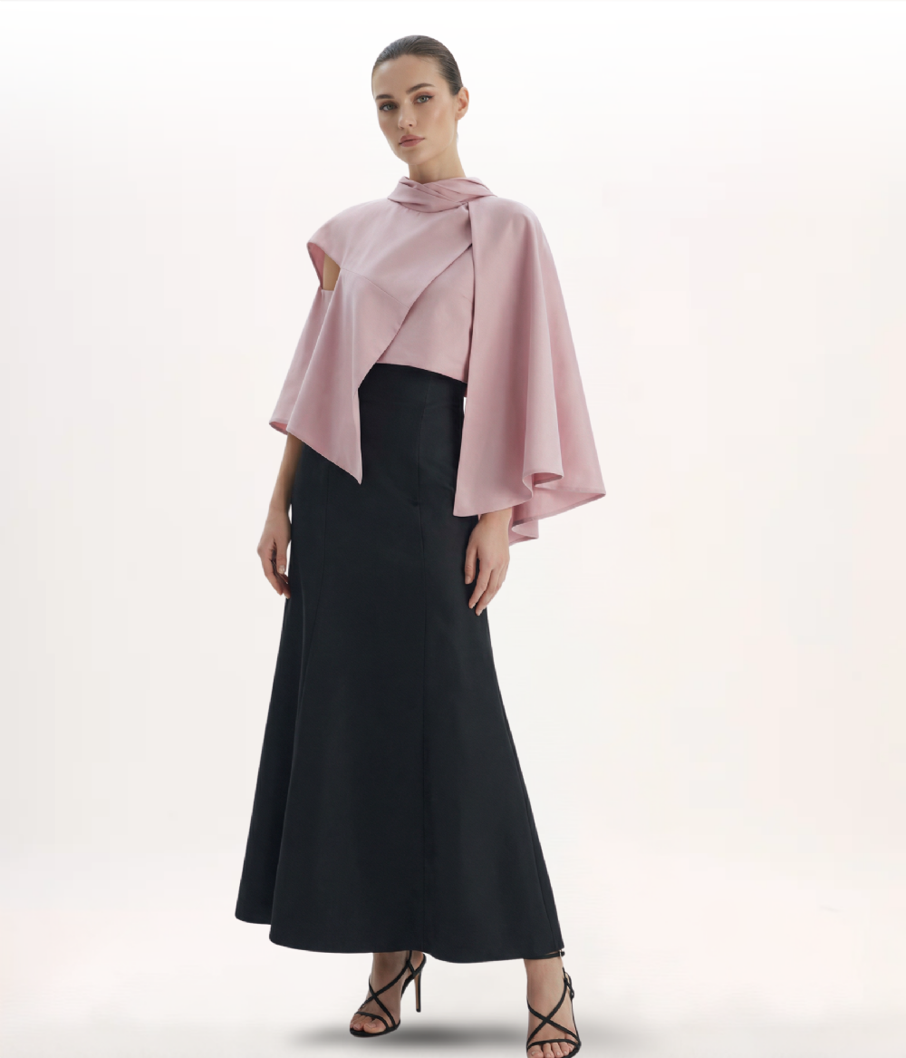 Blusa confeccionada em tafetá rosé, tecido de leve brilho acetinado e estrutura refinada que proporciona volume e caimento sofisticado. O modelo apresenta design assimétrico e construção arquitetônica, com sobreposição de camadas que formam uma elegante capa fluida sobre os ombros e costas. O decote fechado e as linhas diagonais conferem um visual moderno e escultural, equilibrando sofisticação e contemporaneidade.