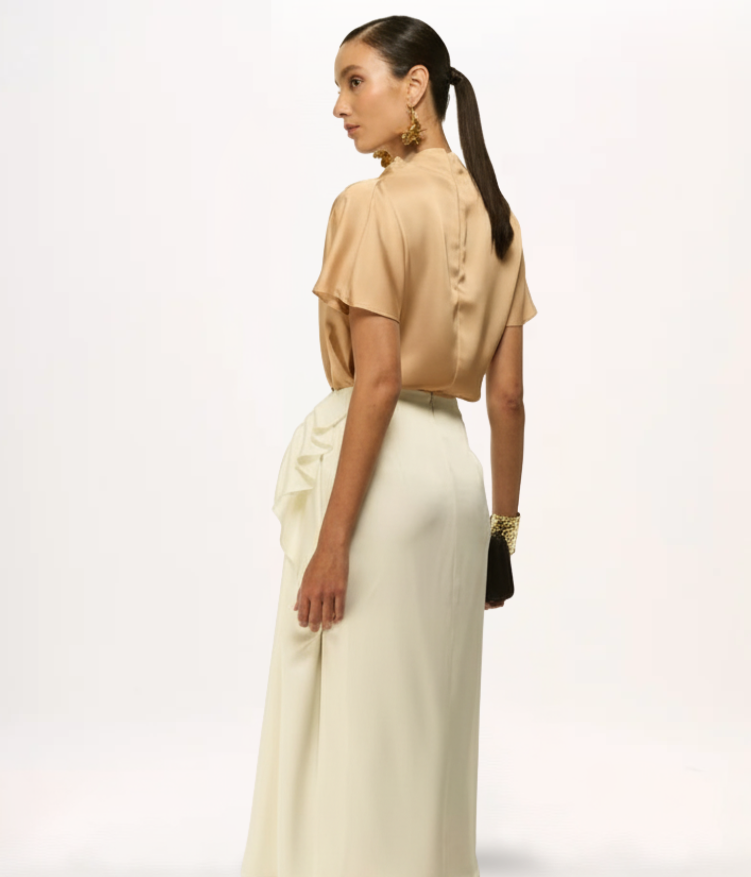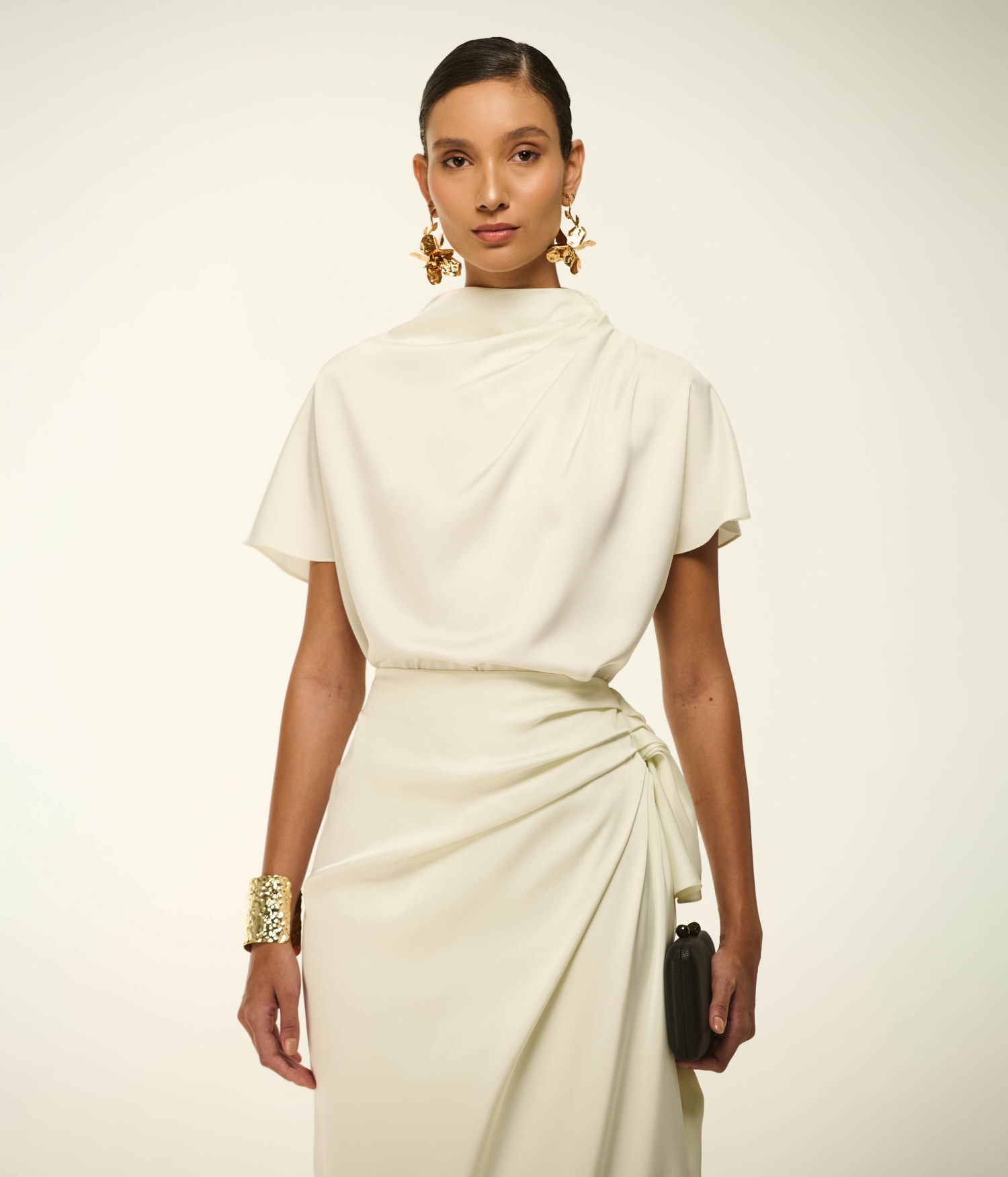 • Apresenta uma gola alta com um drapeado assimétrico e volumoso ao redor do decote e dos ombros, criando um efeito visual sofisticado e único.