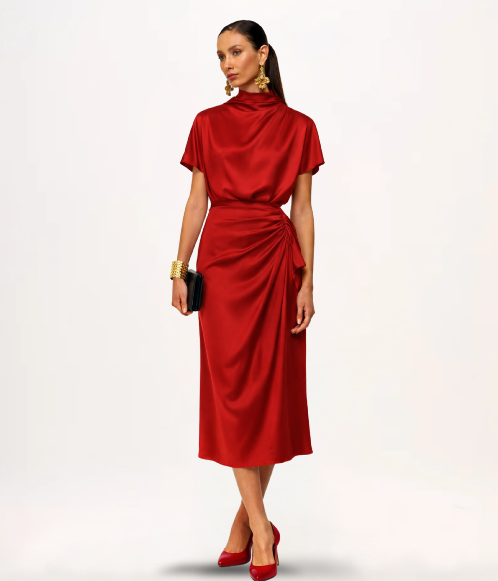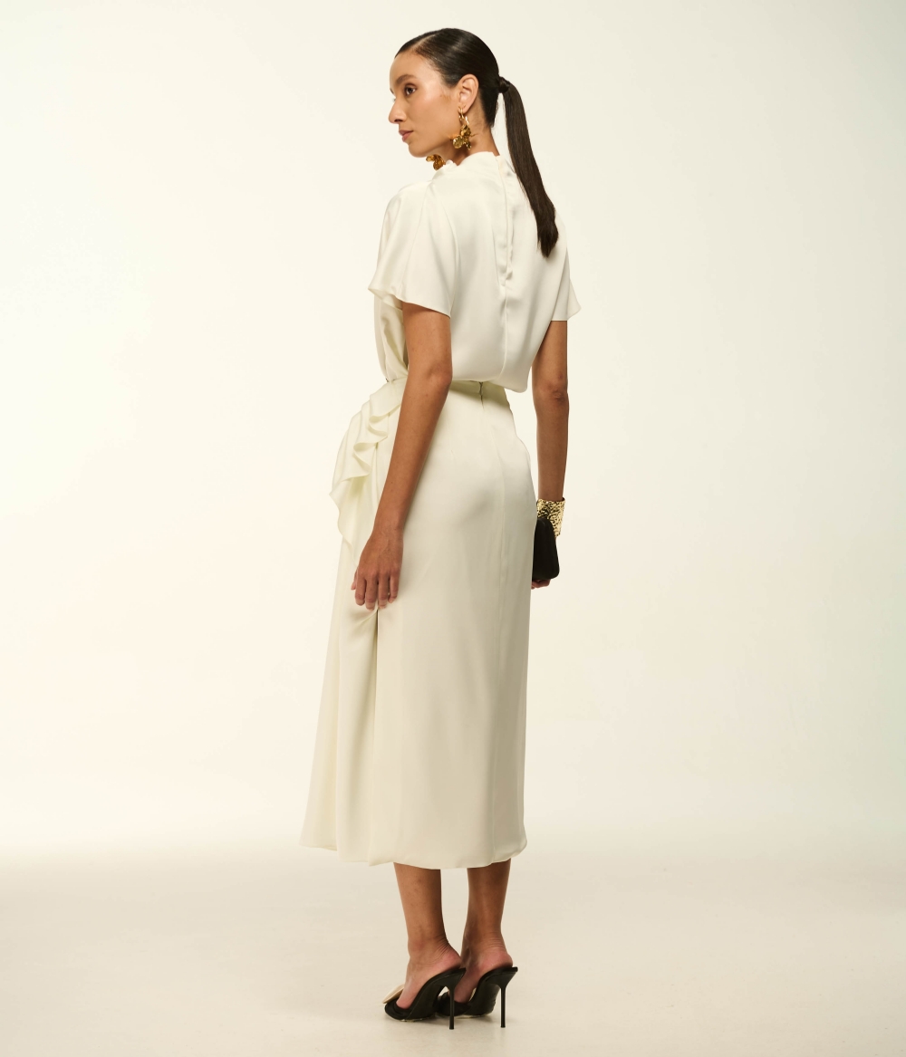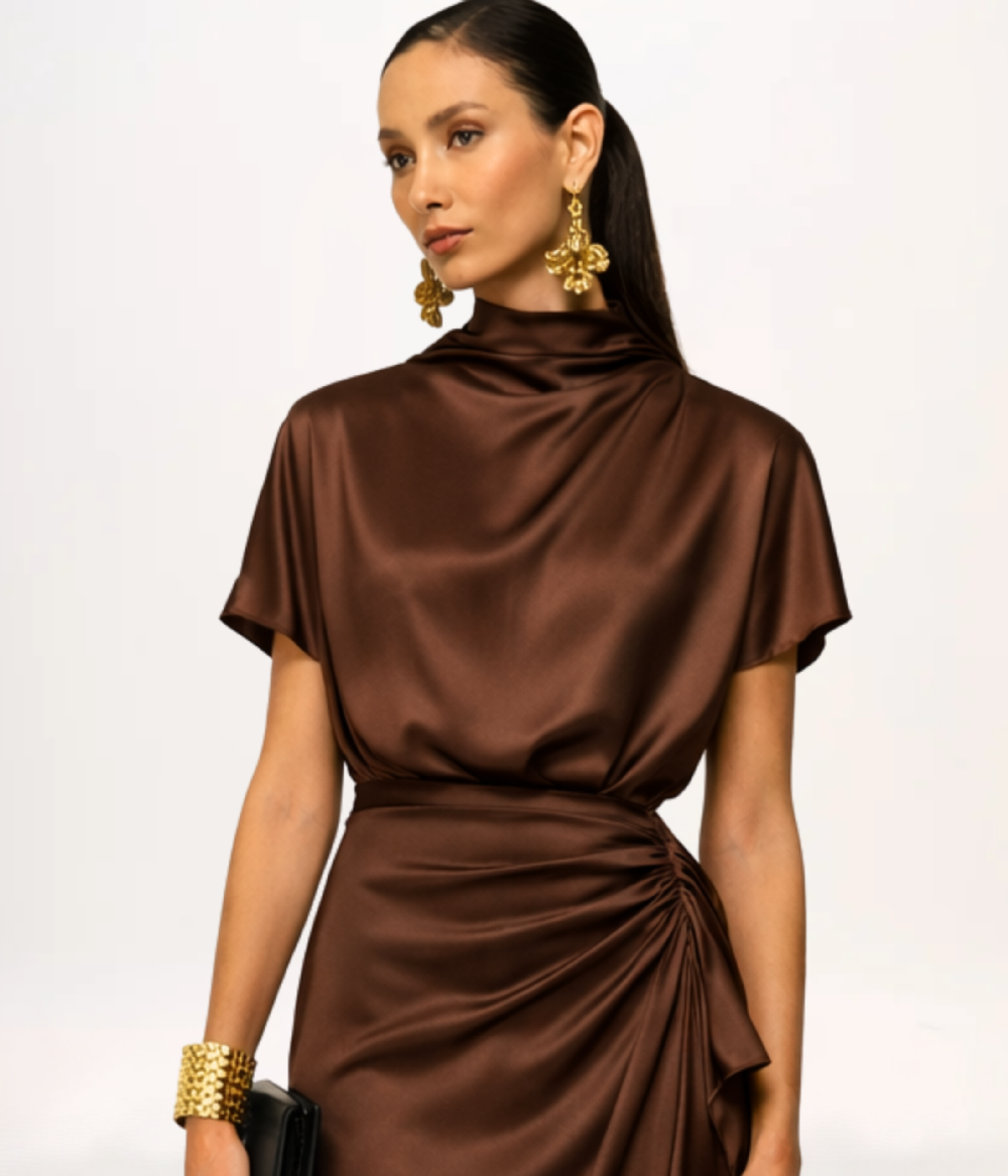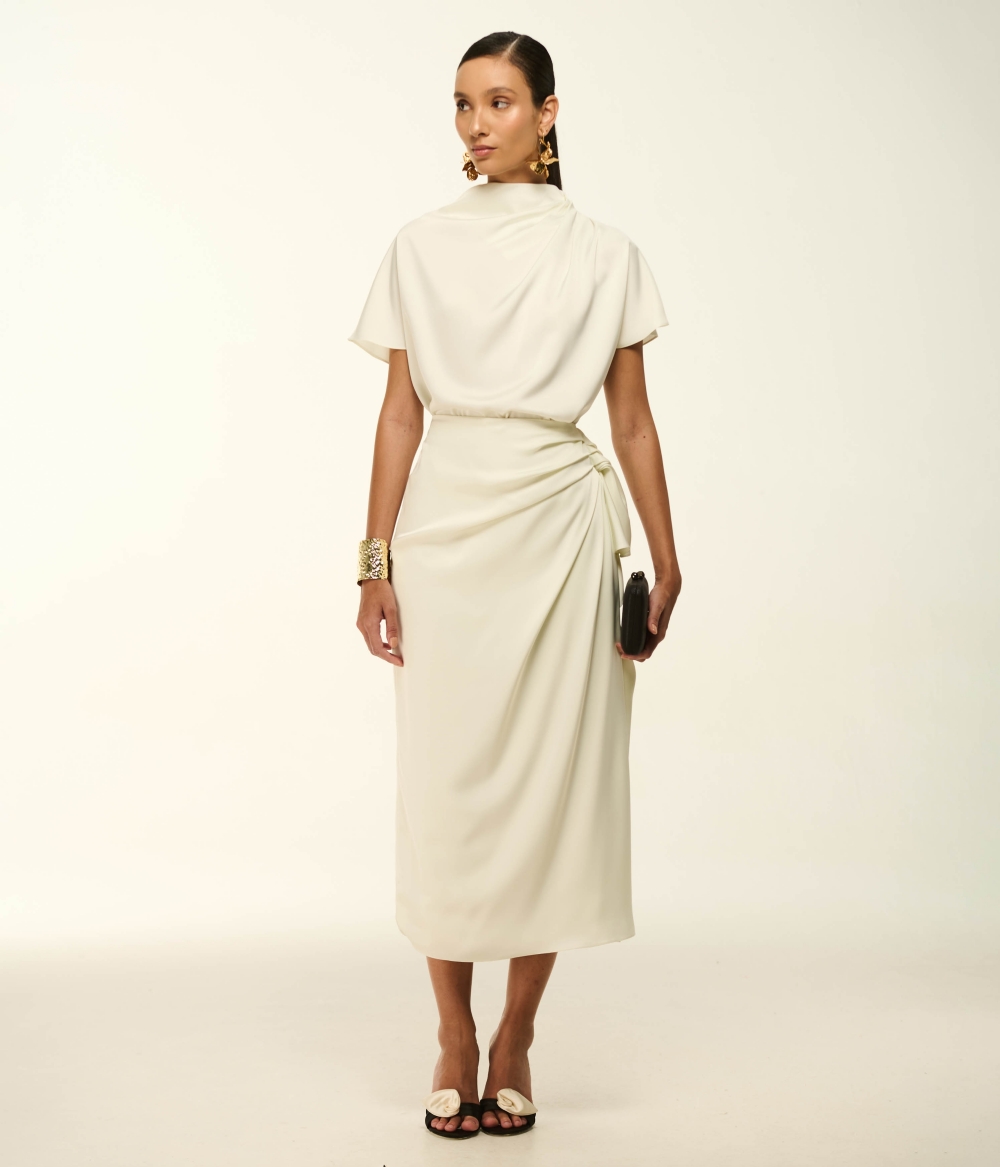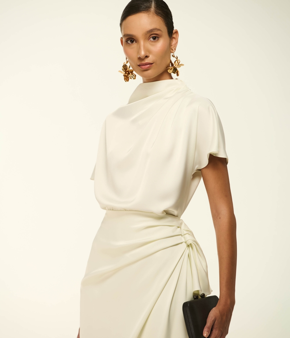 - Detalhes: Gola alta com drapeado assimétrico, mangas curtas, zíper invisível posterior