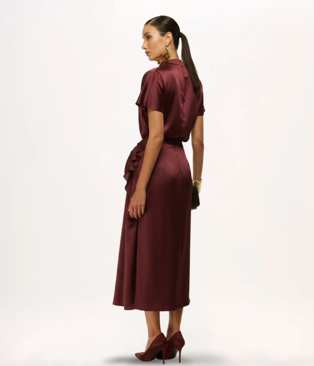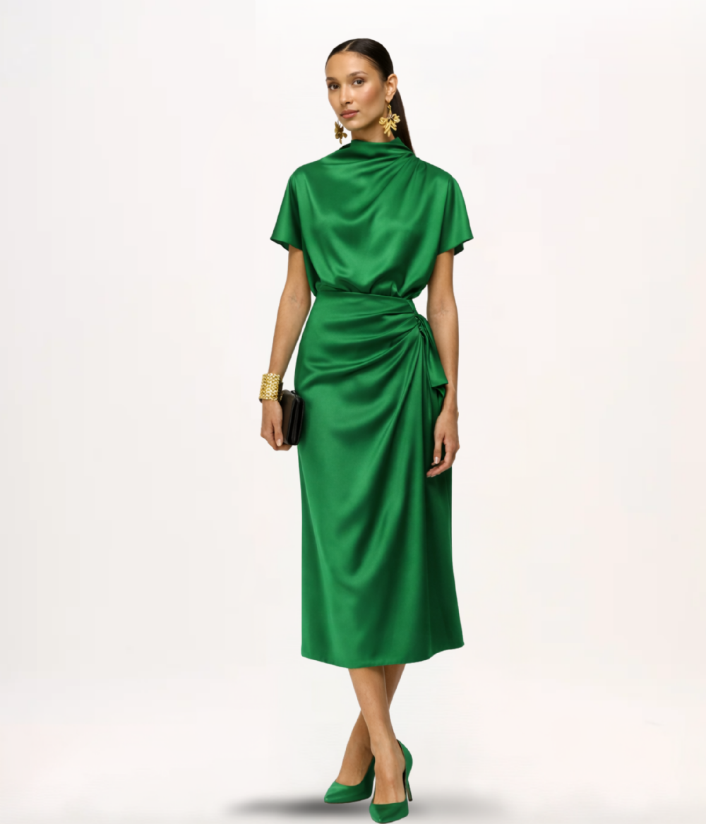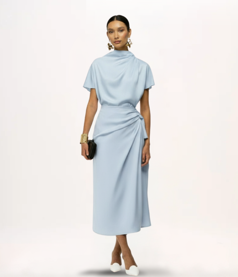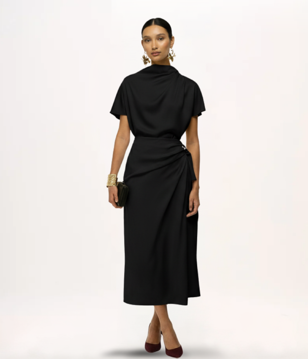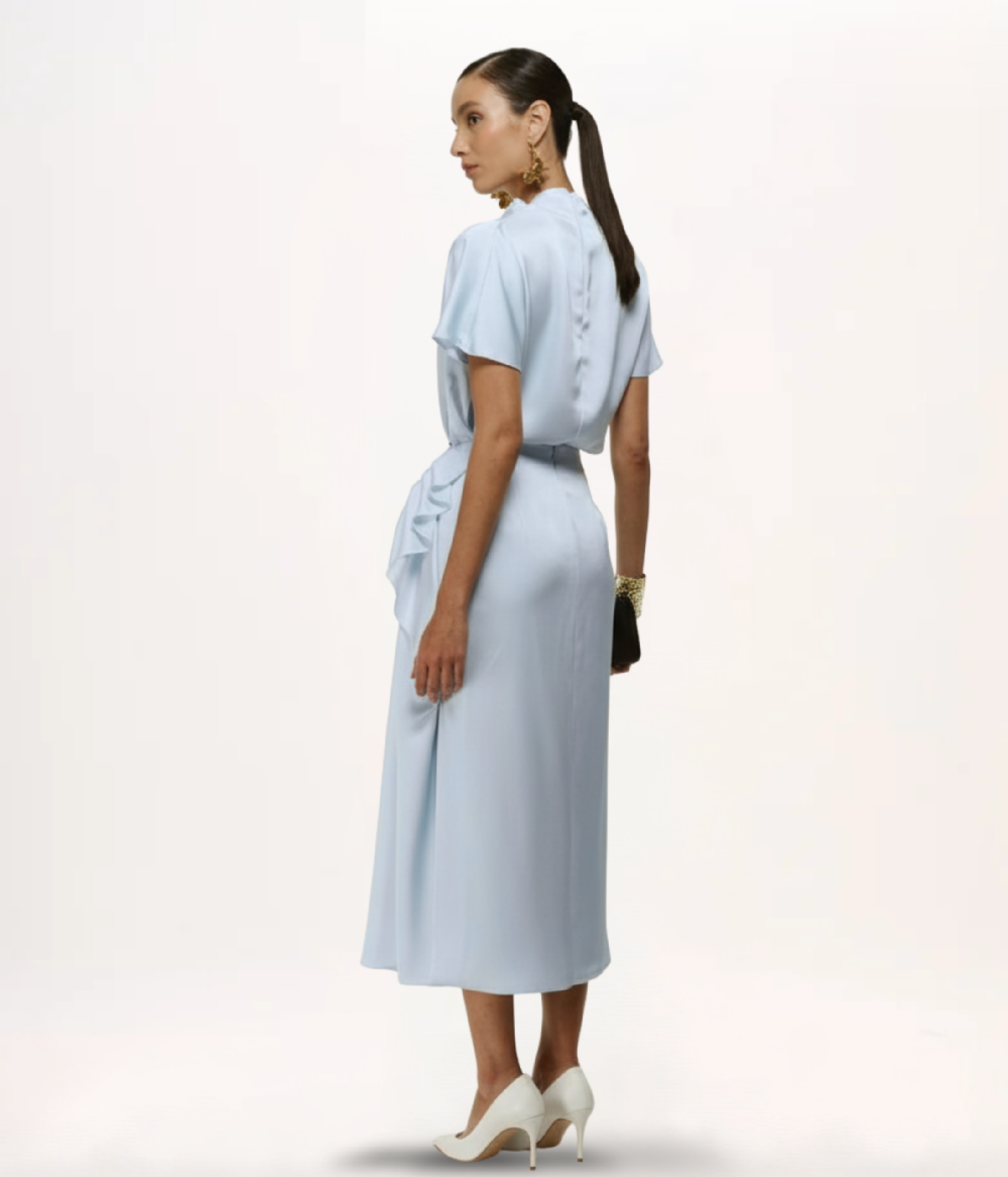 - Detalhes: Gola alta com drapeado assimétrico, mangas curtas, zíper invisível posterior