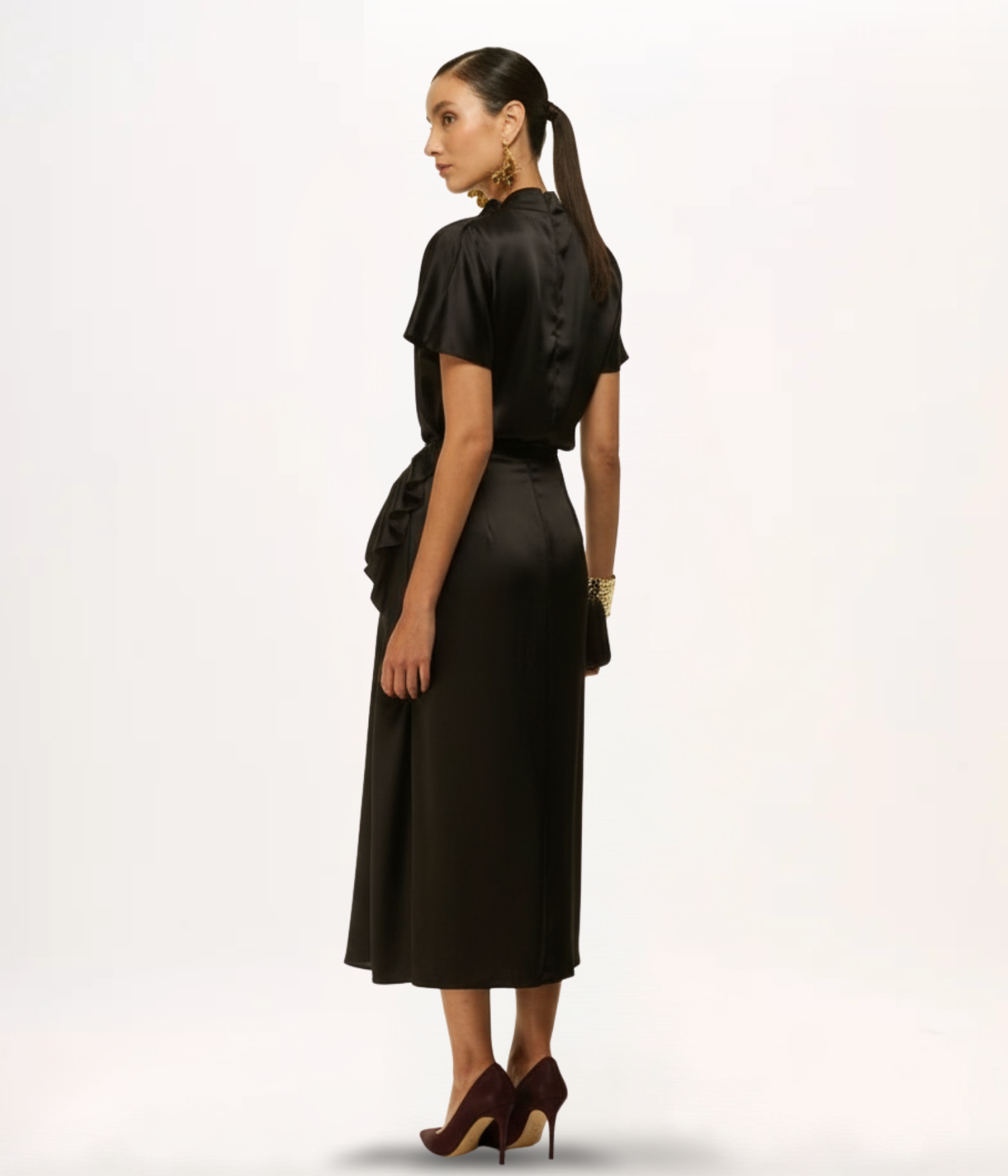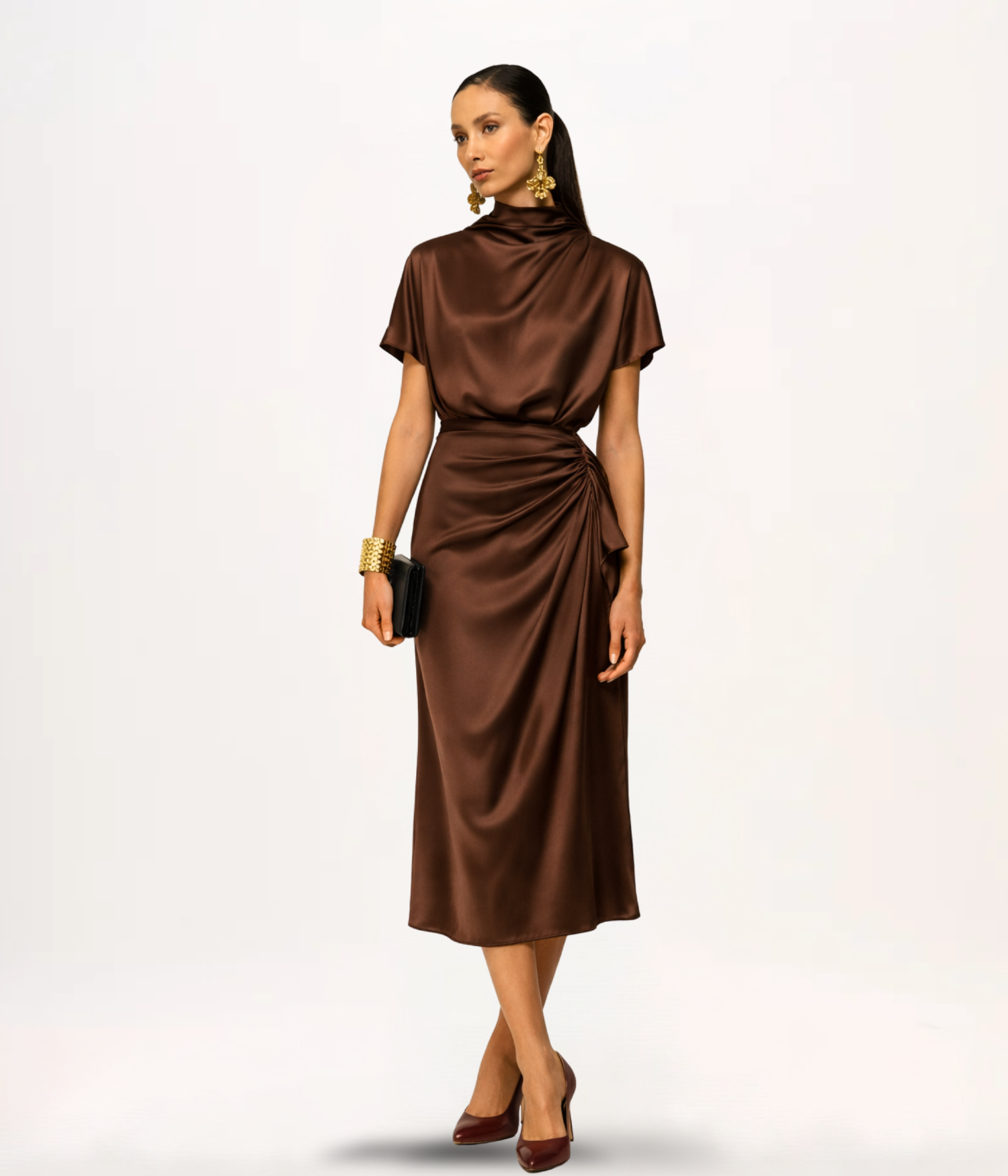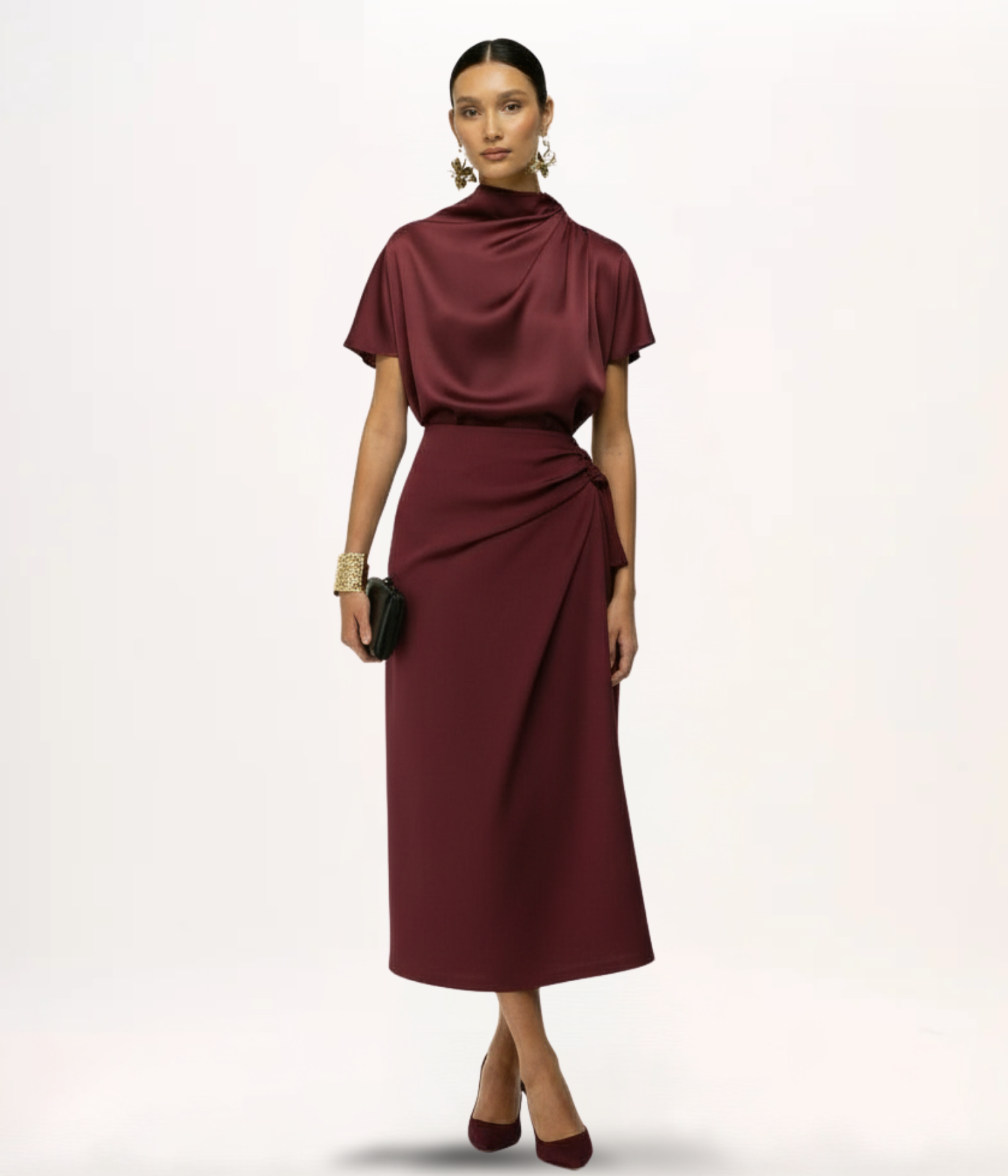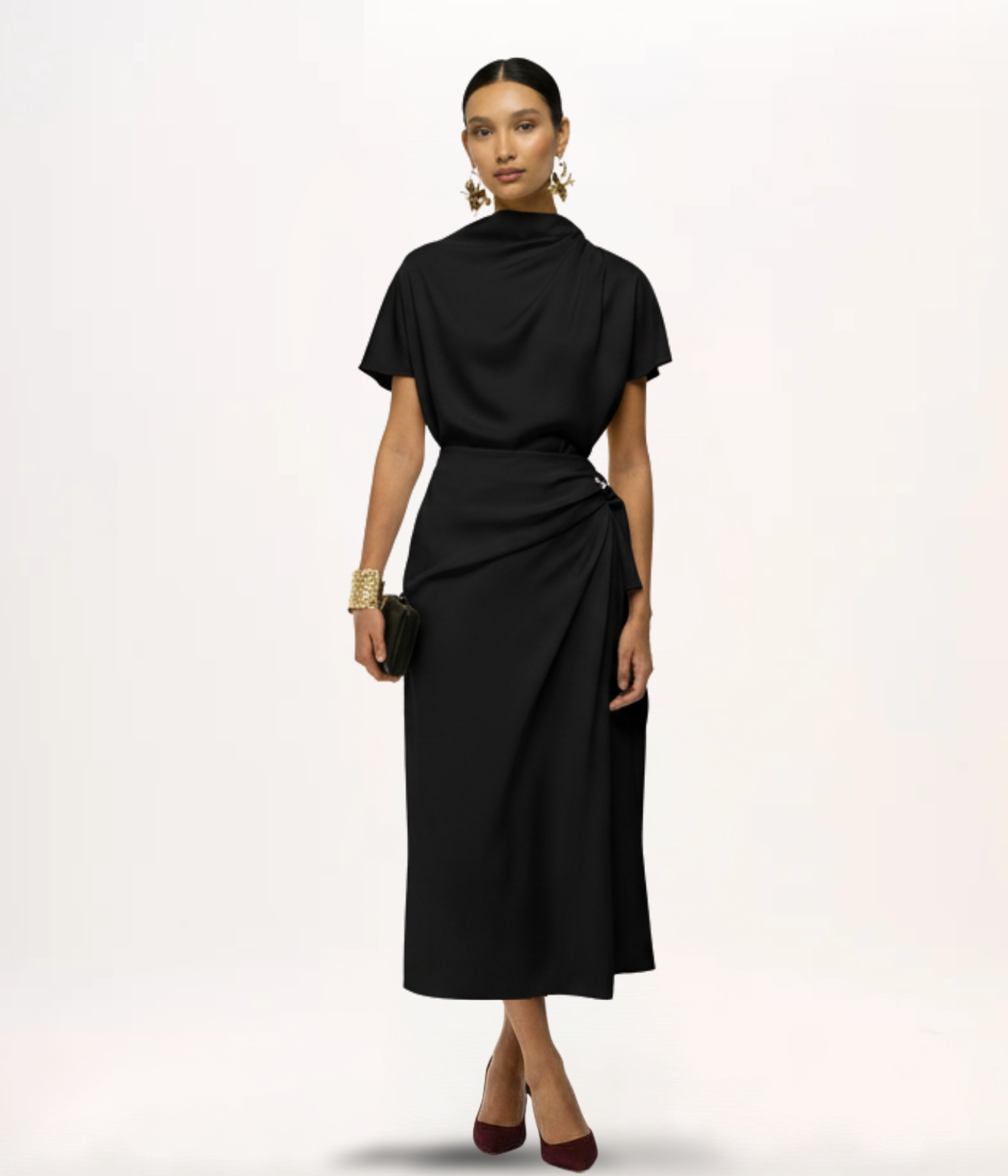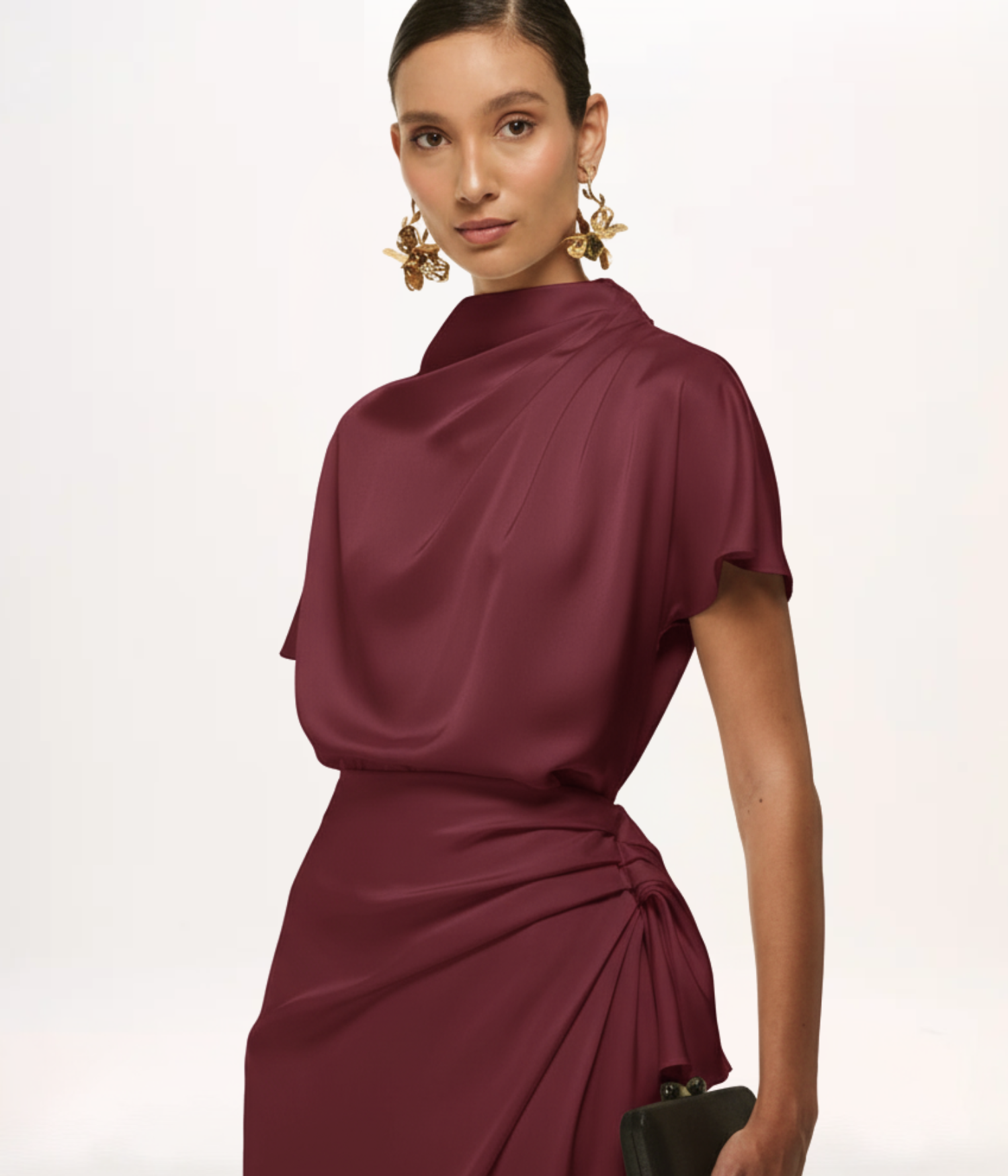 - Detalhes: Gola alta com drapeado assimétrico, mangas curtas, zíper invisível posterior