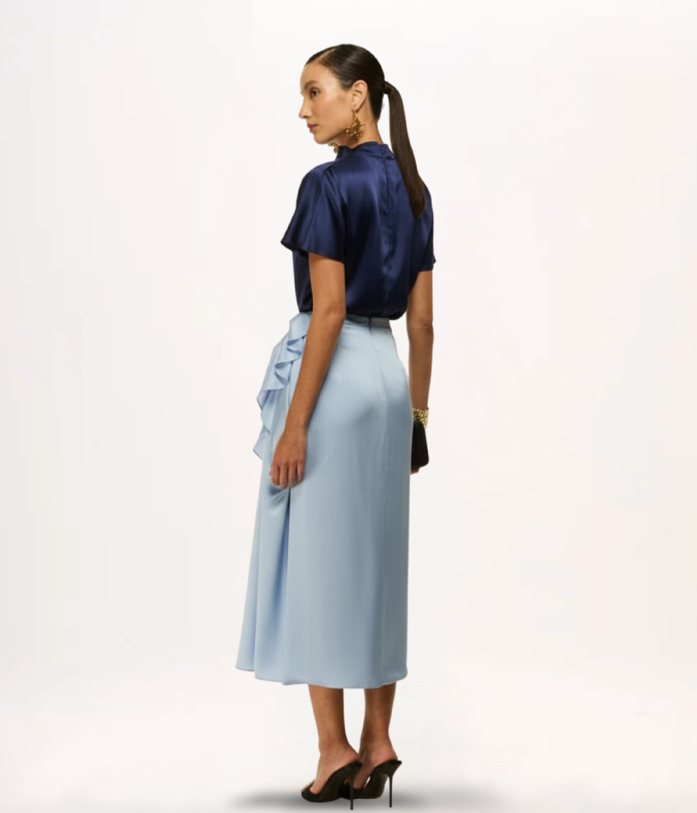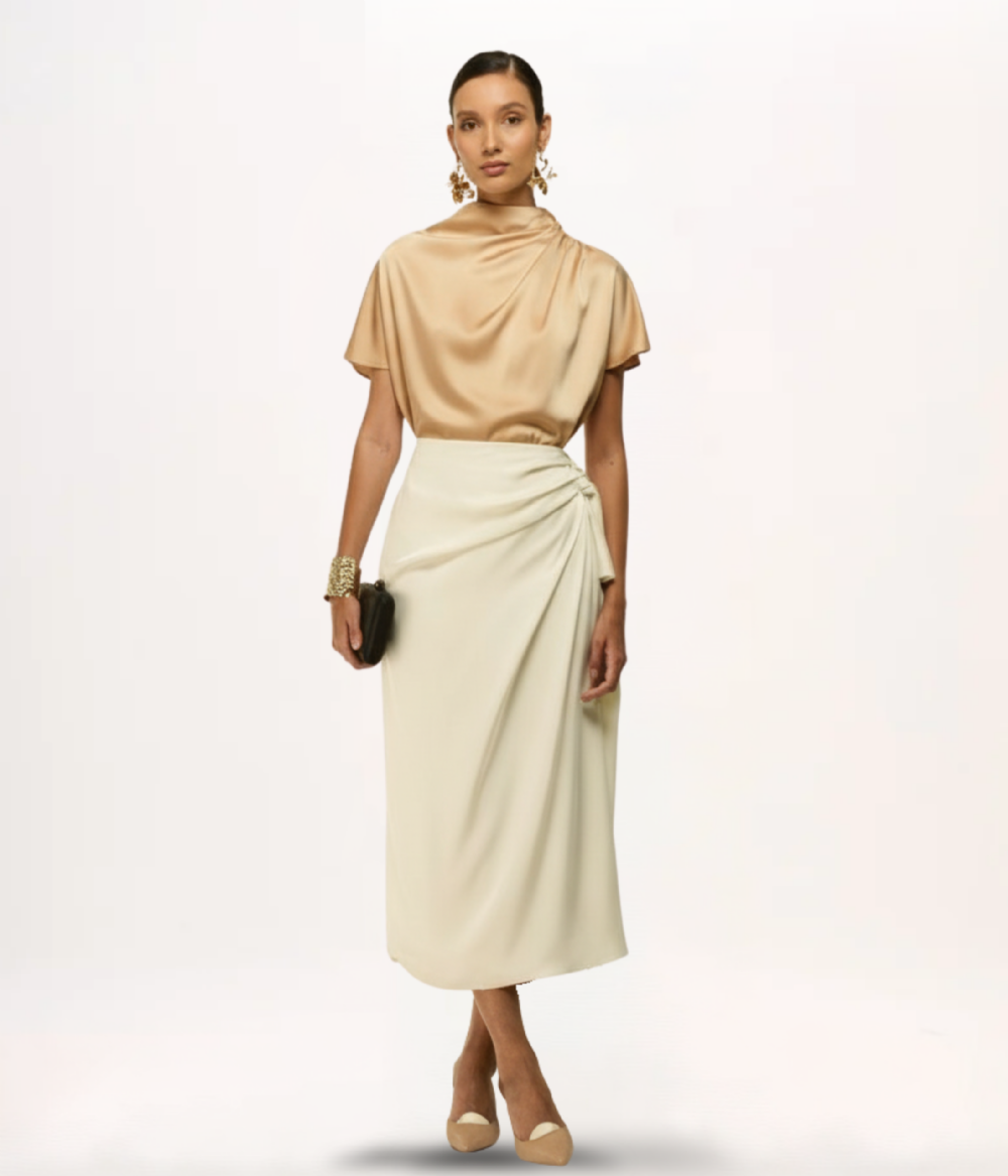 • Confeccionada em cetim, a blusa oferece um caimento leve e um brilho sutil, elevando o visual com elegância.
