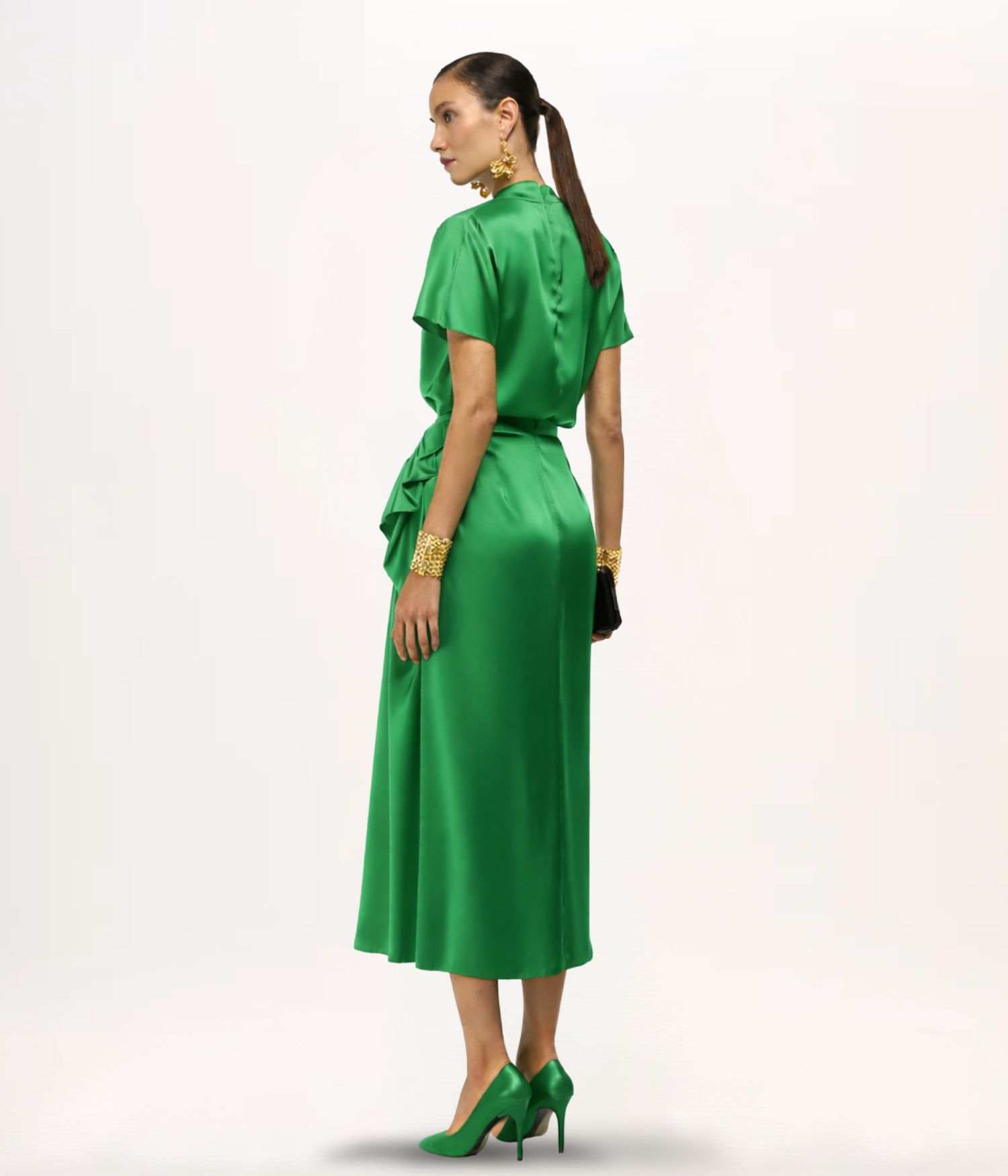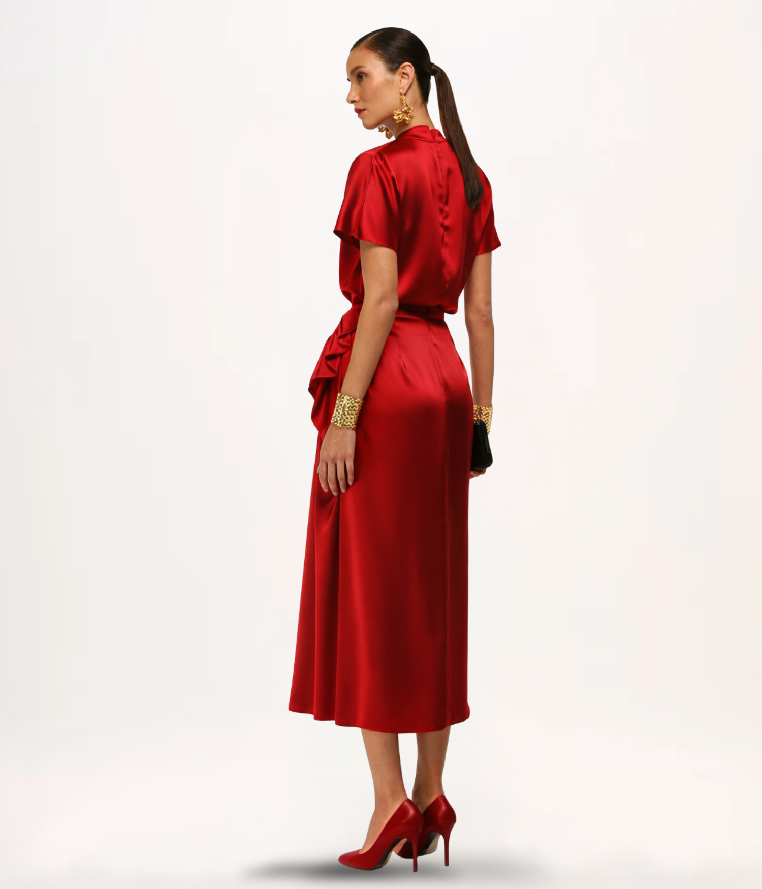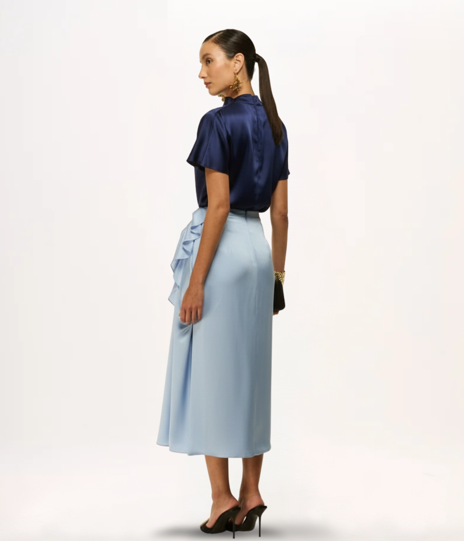 Confeccionada em cetim, um tecido nobre e atemporal, conhecido por sua superfície lisa, brilho intenso e caimento fluido. Sua textura luxuosa e a capacidade de refletir a luz de forma elegante o tornam ideal para peças que exigem sofisticação e um toque agradável à pele.