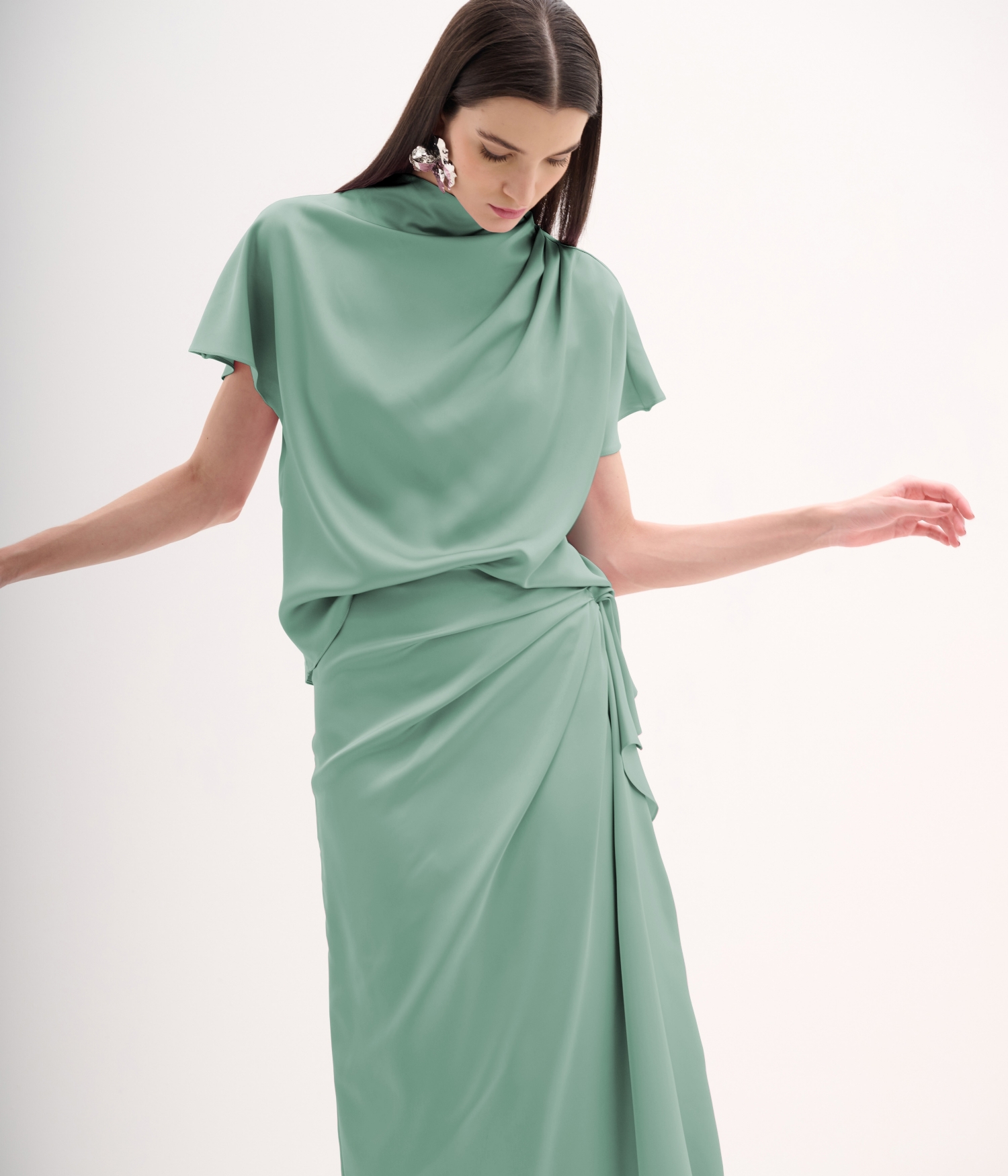 - Detalhes: Gola alta com drapeado assimétrico, mangas curtas, zíper invisível posterior