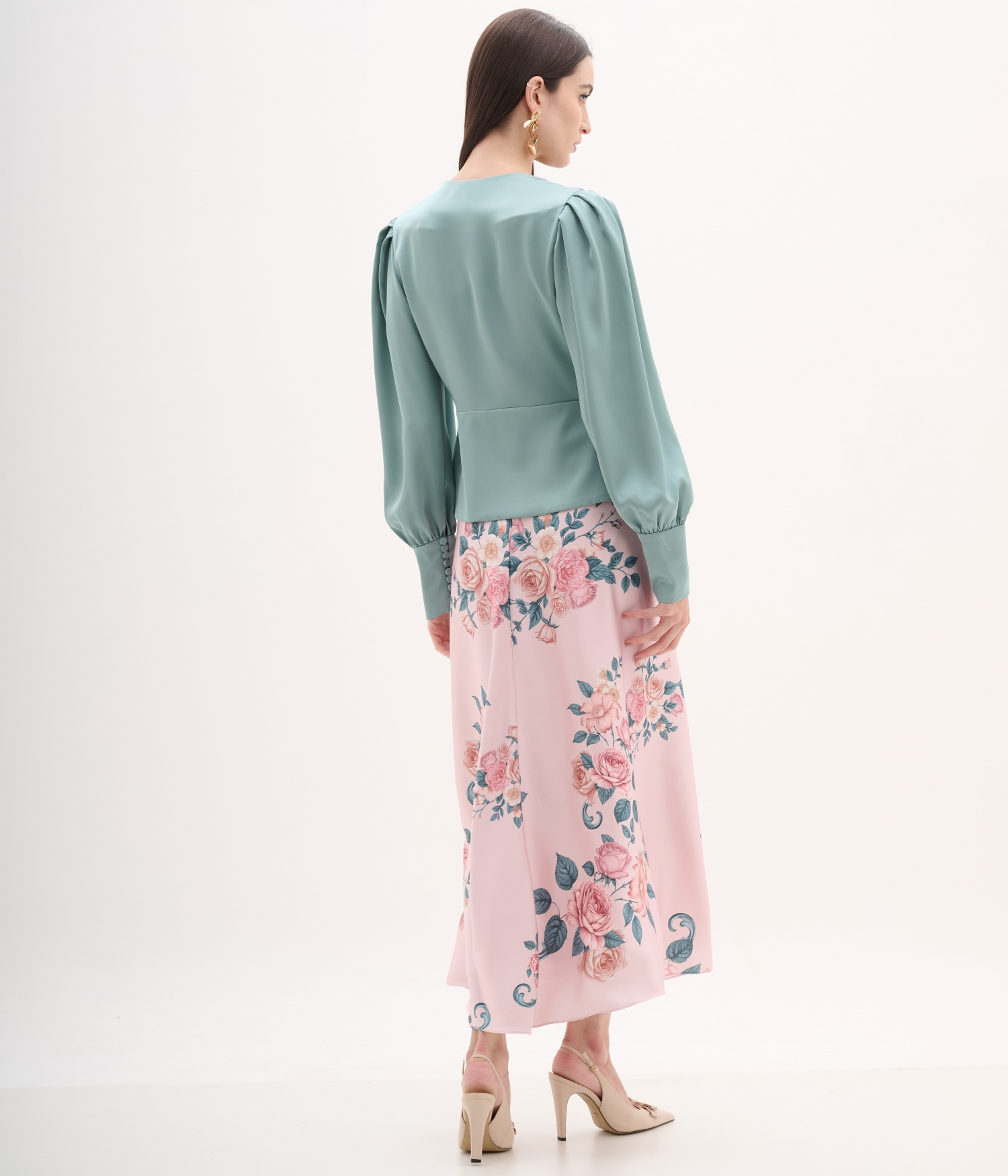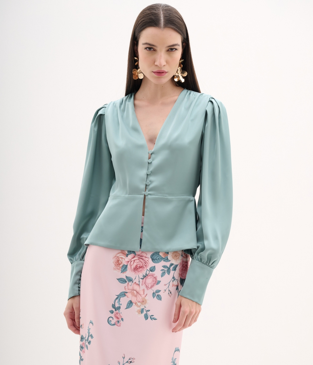 Sua modelagem marcada na cintura forma um leve peplum que afina a silhueta, enquanto o decote em “V” e os botões forrados trazem delicadeza e um toque clássico. As mangas longas com volume discreto e punhos estruturados completam o visual com romantismo e presença.