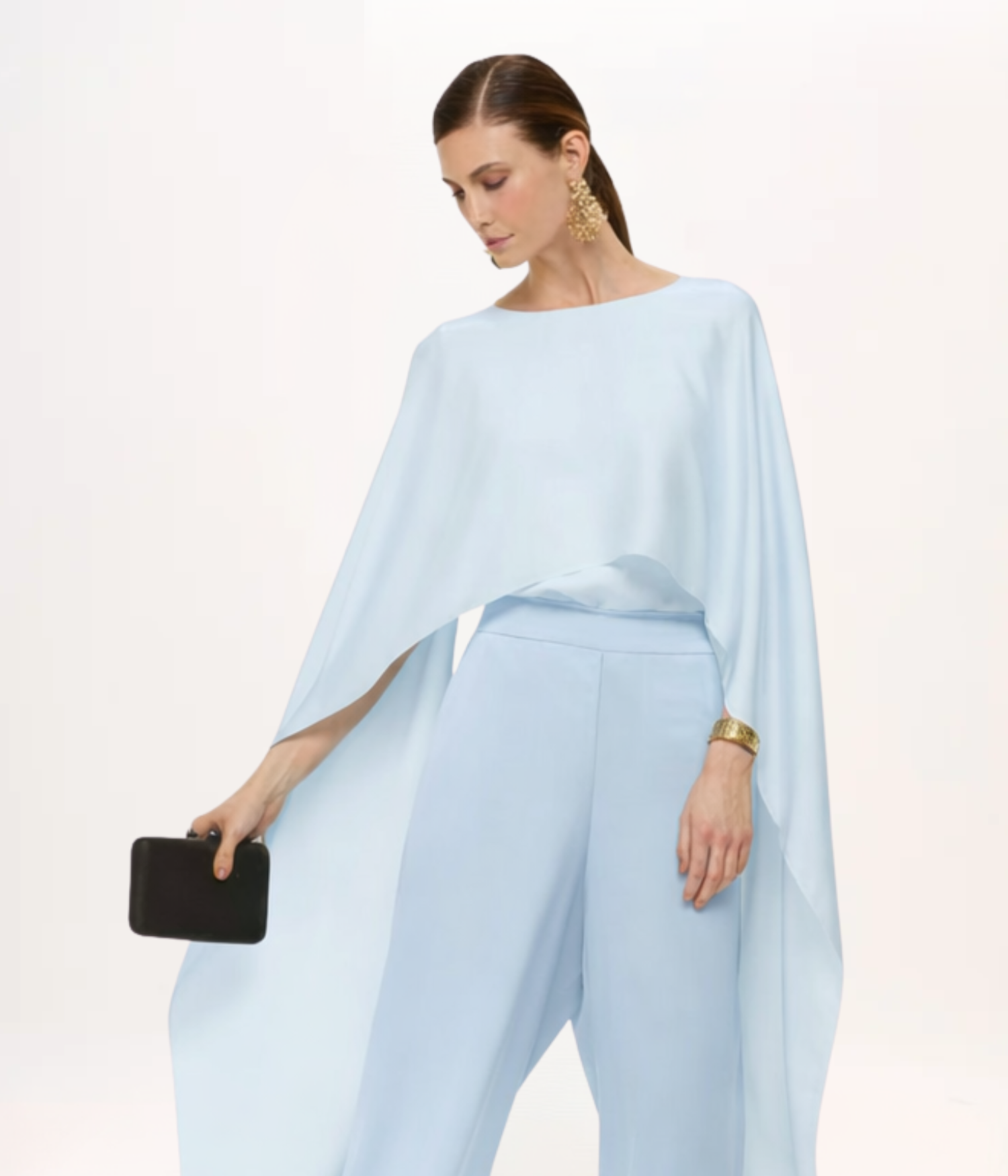 - Detalhes: Decote canoa, mangas amplas esvoaçantes com efeito capa
