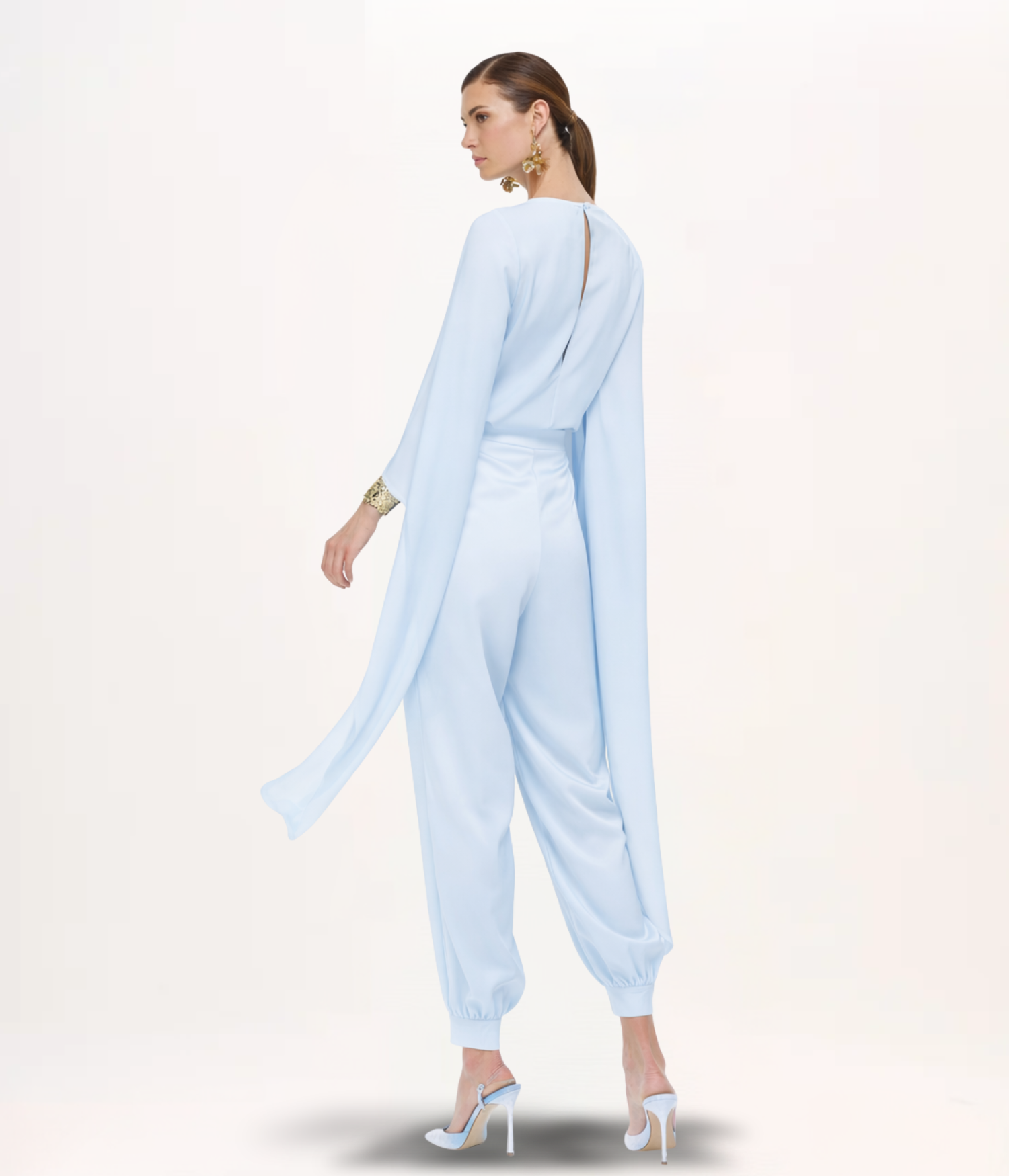 A Blusa BL829 é a tradução perfeita do luxo fluido e do design arquitetônico de vanguarda. Confeccionada em cetim de caimento suntuoso, o modelo apresenta um elegante decote canoa que emoldura os ombros e o colo com extrema sofisticação e sutileza. O espetáculo visual da peça reside em suas mangas em formato de capa: o tecido flui a partir dos ombros criando painéis esvoaçantes que conferem um movimento dramático e poético a cada passo. Essa modelagem ampla e escultural envolve a silhueta com leveza, tornando a blusa uma escolha magistral para produções de alto impacto e refinamento ímpar.