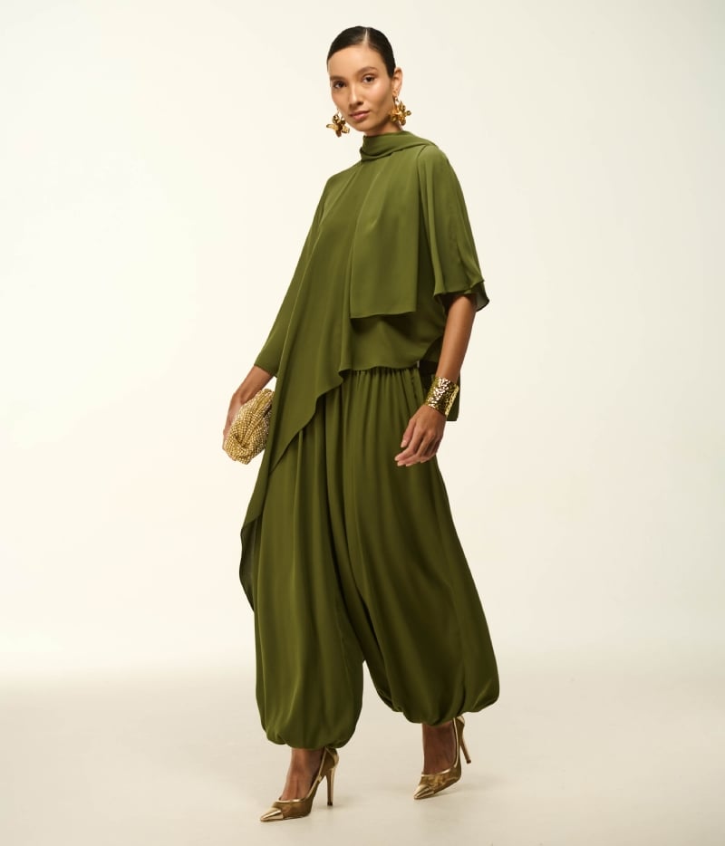 A Blusa BL828 é a expressão máxima de movimento, leveza e sofisticação arquitetônica. Confeccionada em crepe fluido de caimento suntuoso, o modelo destaca-se por um decote alto e suavemente drapeado, que emoldura o rosto e o pescoço com extrema elegância. O grande espetáculo visual reside em suas mangas amplas e esvoaçantes, que criam um efeito de capa dramático e poético, fluindo graciosamente a cada passo. A modelagem contemporânea é finalizada por uma barra assimétrica com sobreposições frontais, entregando uma peça rica em texturas e proporções. O destaque absoluto é a audaciosa cor Picles, um tom de verde oliva iluminado e exótico que garante um visual de luxo inesquecível.