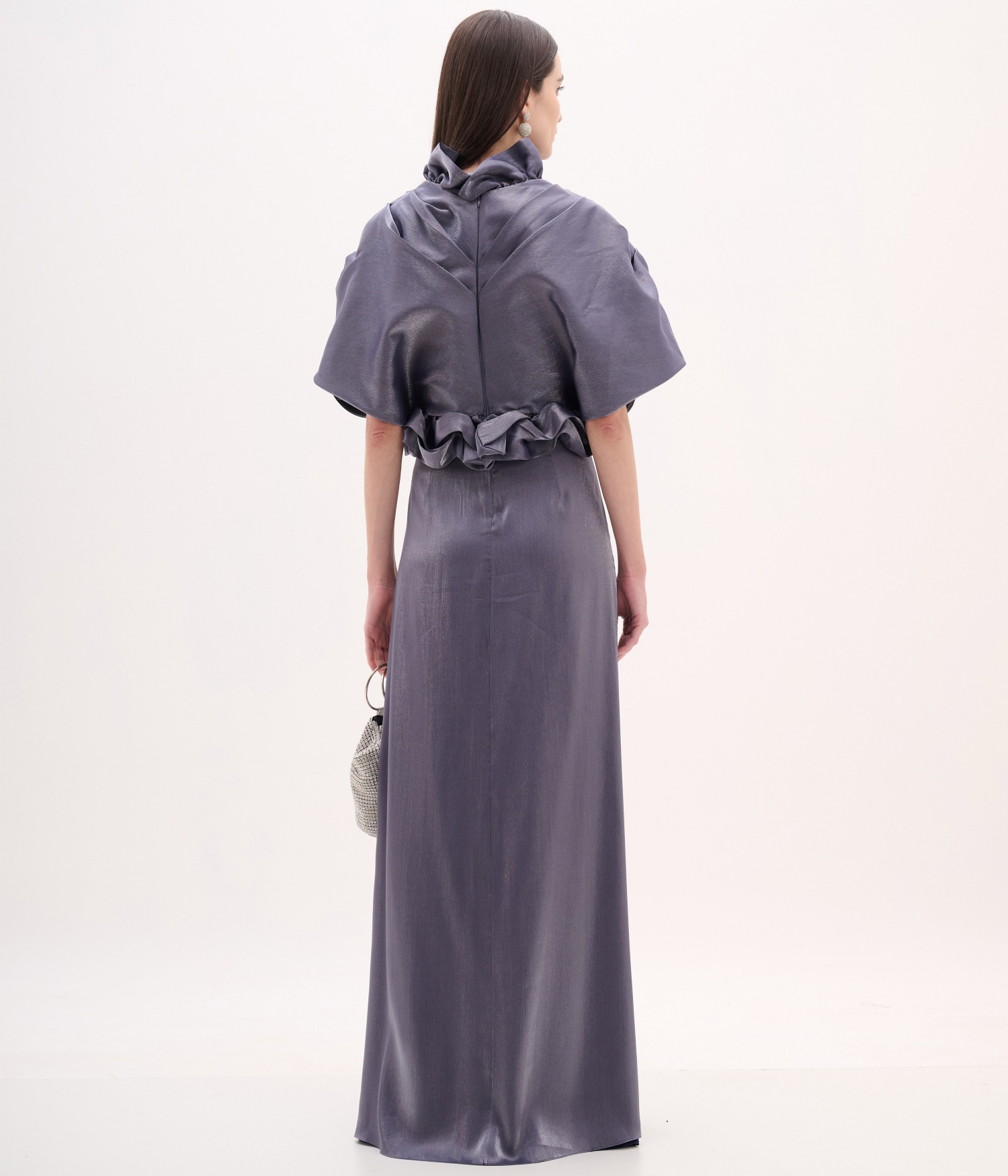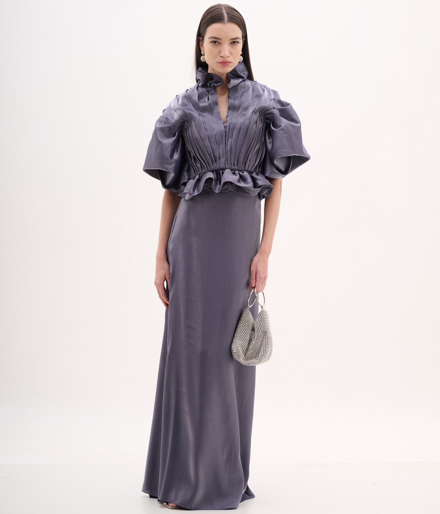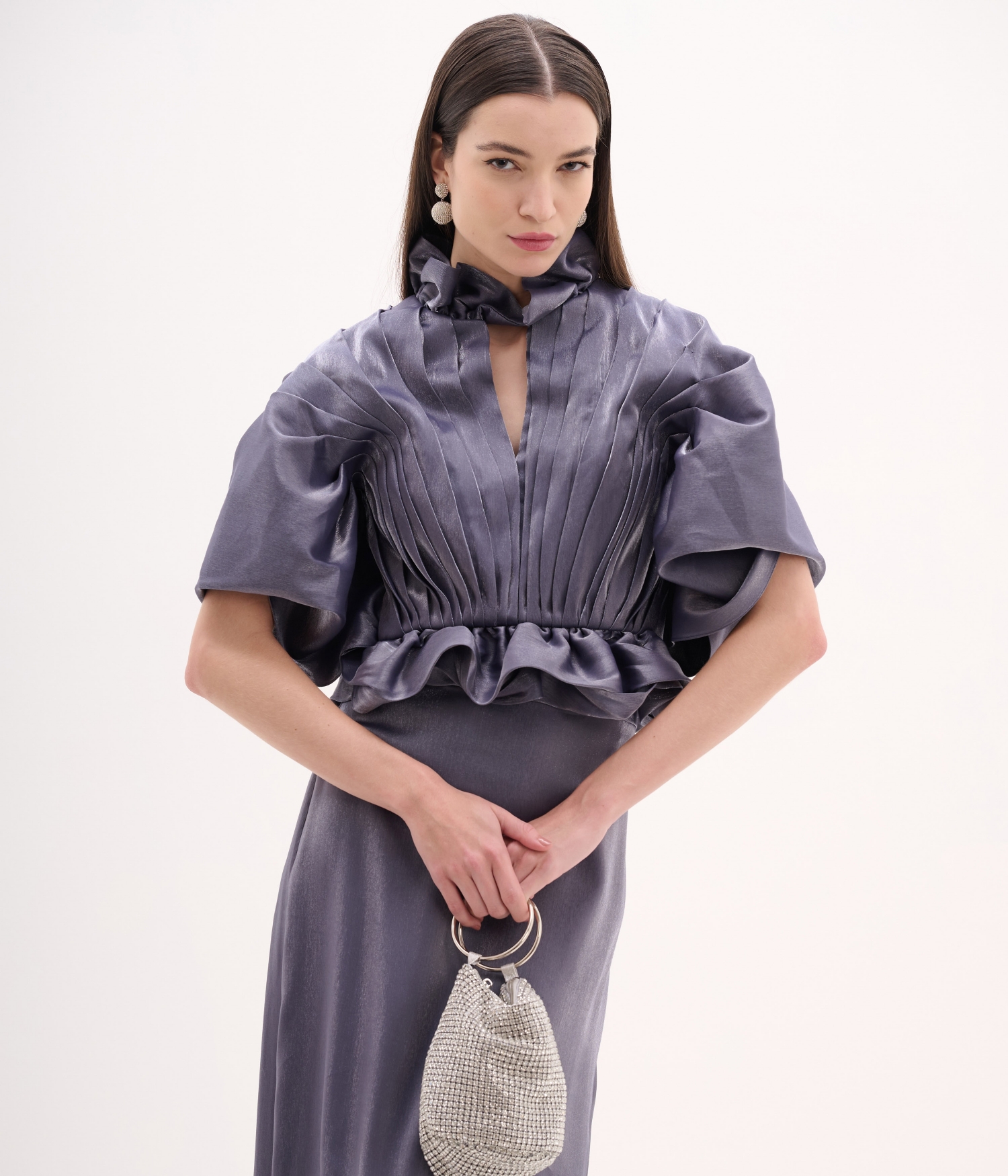 O design se destaca pelo trabalho minucioso de plissados na parte frontal, criando textura, verticalidade e um visual escultural. O decote conta com fenda central delicada e uma gola alta franzida, que traz impacto e modernidade na medida certa.