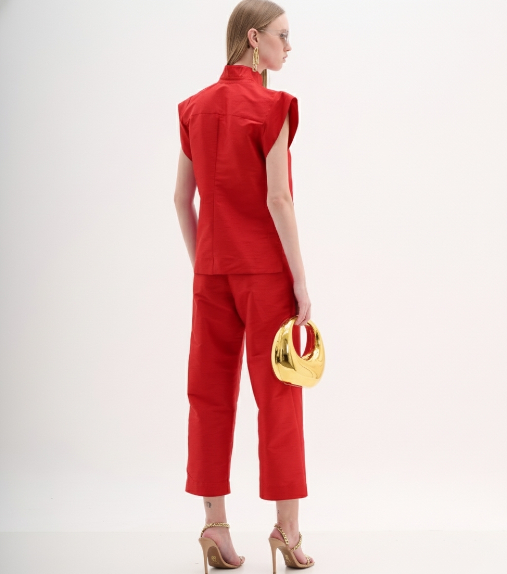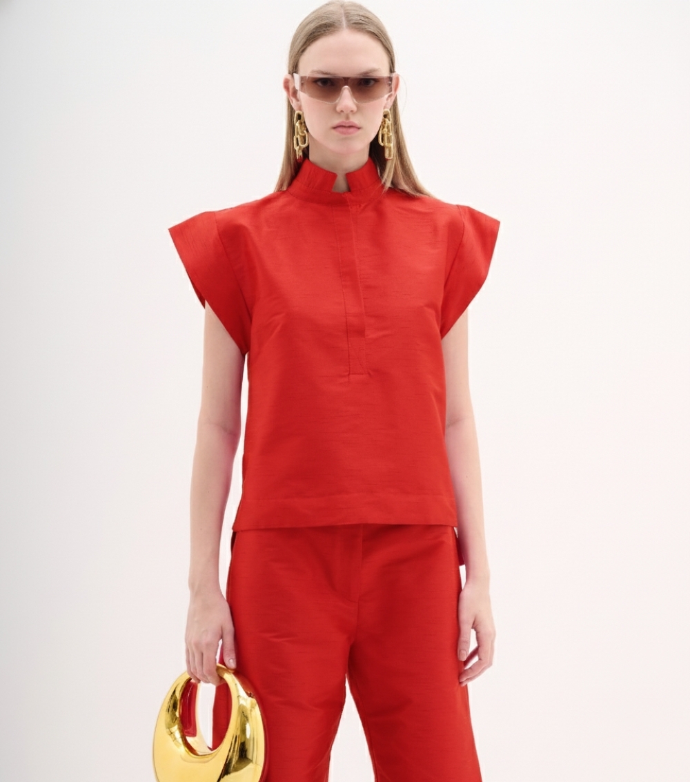 Blusa sofisticada e moderna confeccionada em shantung, um tecido nobre e texturizado conhecido por seu brilho sutil e estrutura que garante um caimento impecável. A cor vermelho vibrante confere à peça um impacto visual forte e elegante.