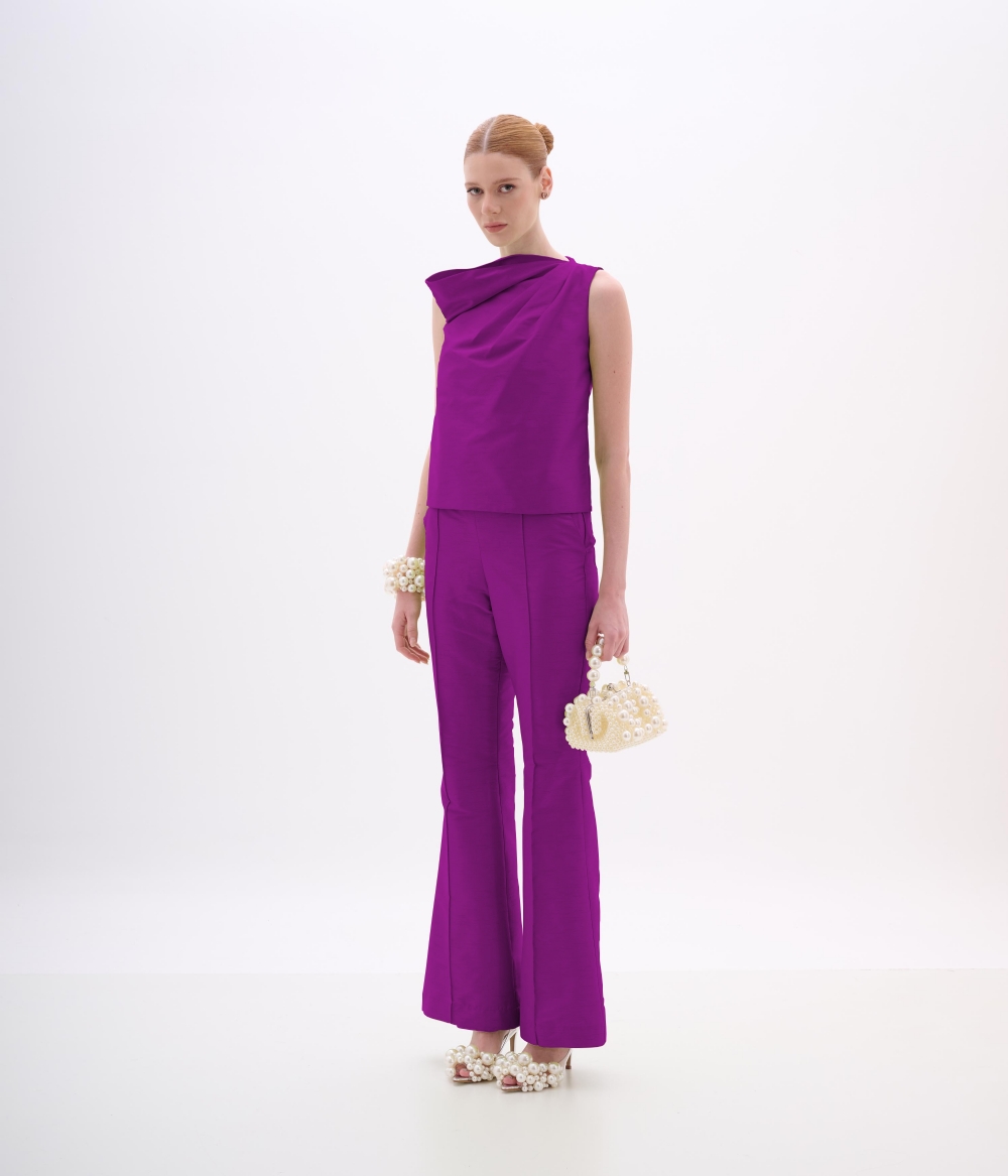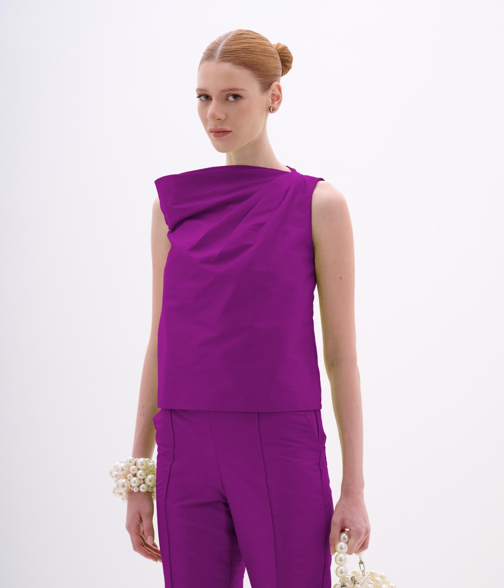 A blusa em shantung uva é sinônimo de sofisticação e modernidade. Seu design minimalista ganha destaque pelo decote drapeado lateral, que adiciona um toque de movimento e elegância à peça. O caimento estruturado do shantung realça a modelagem reta, tornando a blusa versátil e refinada para composições tanto casuais quanto de festa.