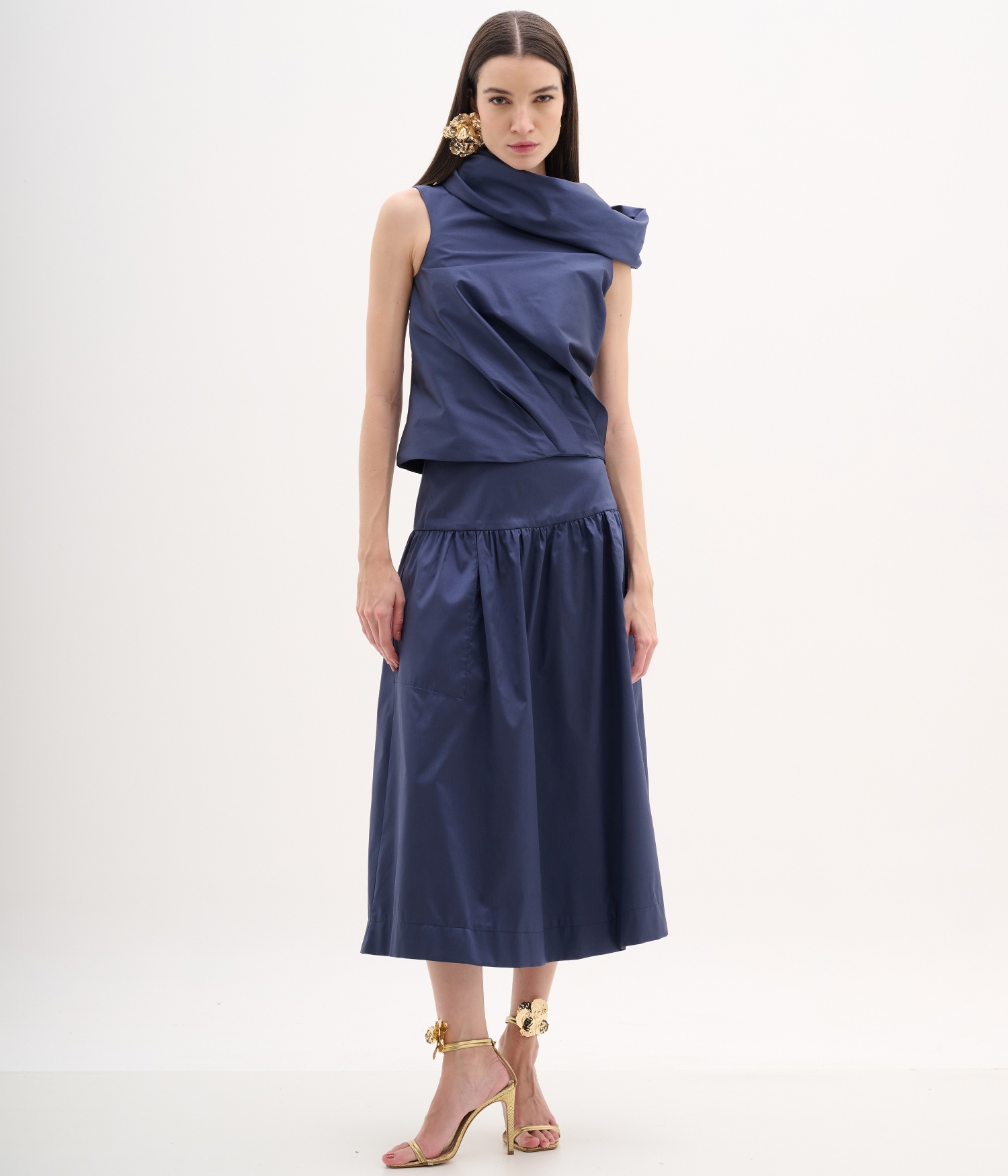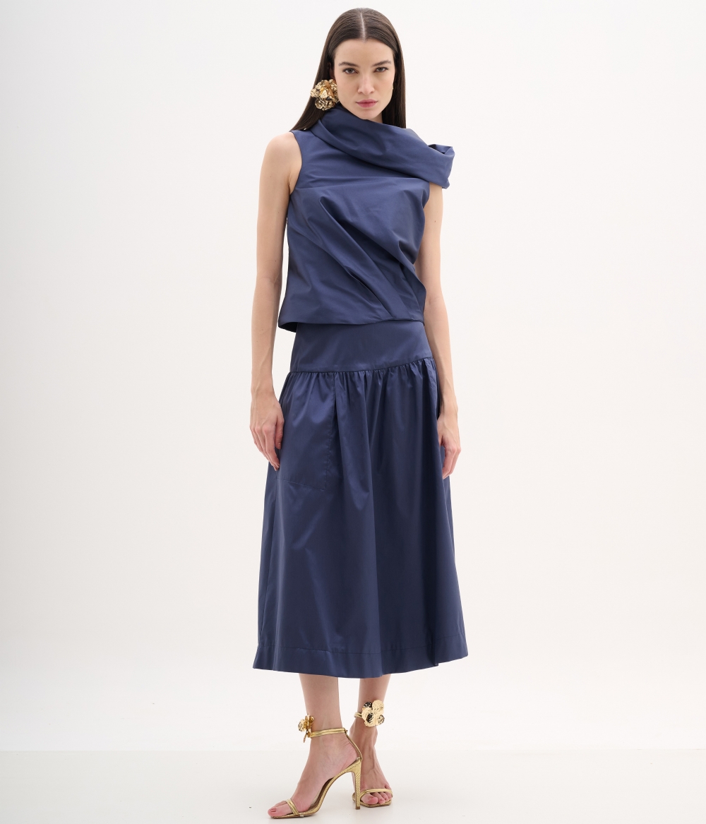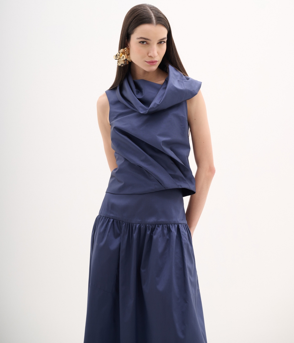 Blusa confeccionada em tafetá estruturado azul marinho, tecido de leve brilho acetinado e caimento firme que valoriza a silhueta com elegância. O modelo apresenta gola ampla drapeada com efeito escultural, criando volume e sofisticação na parte superior. A modelagem reta e levemente ajustada proporciona um caimento impecável, realçando a estrutura do tecido sem perder a fluidez.
