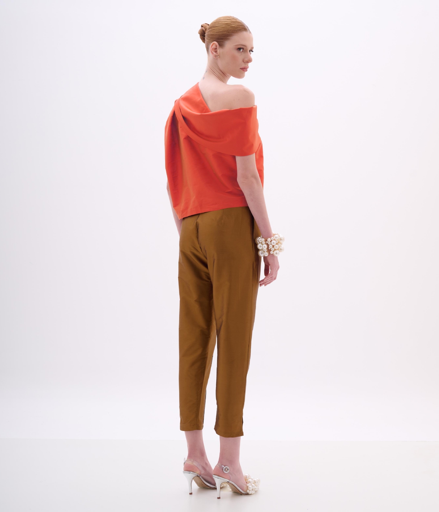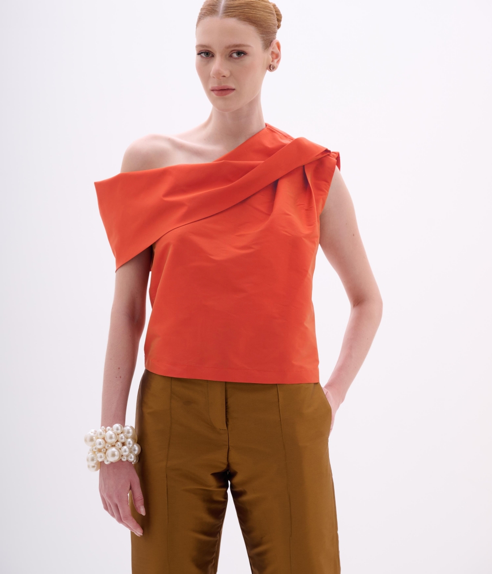 A Blusa em Tafetá destaca a elegância da modelagem com um visual contemporâneo e sofisticado. Com drapeado marcante e design assimétrico que valoriza o colo, a peça cria um efeito escultural e refinado — ideal para composições em que o acabamento e o caimento fazem toda a diferença.