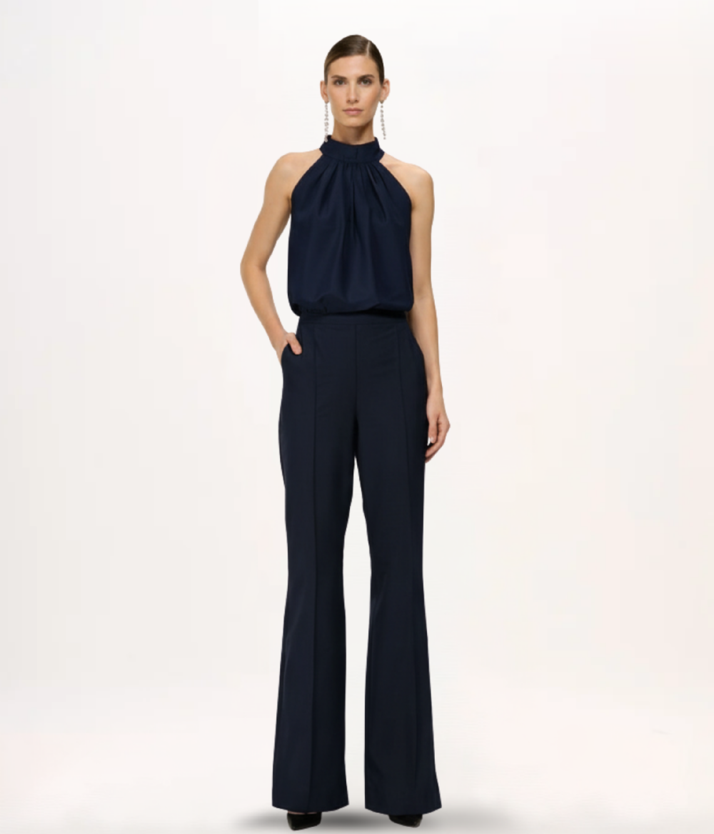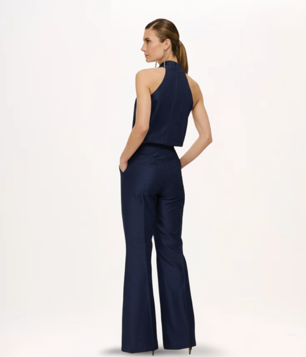 A Blusa BL822 é a expressão máxima de sofisticação e feminilidade em uma peça versátil de alfaiataria. Confeccionada em shantung de toque nobre, o modelo apresenta uma estética limpa e arquitetônica. O destaque absoluto reside no decote frente única com gola alta, enriquecido por um primoroso trabalho de franzidos que irradia a partir do pescoço, criando um volume suave e um caimento fluido sobre o busto. A modelagem sem mangas valoriza os ombros e os braços com muita elegância, enquanto o comprimento levemente encurtado confere um ar contemporâneo, desenhado exatamente para encaixar com fluidez em partes de baixo de cintura alta. O sutil brilho acetinado do tecido eleva a peça, transformando-a em uma opção refinada para composições de festa.
