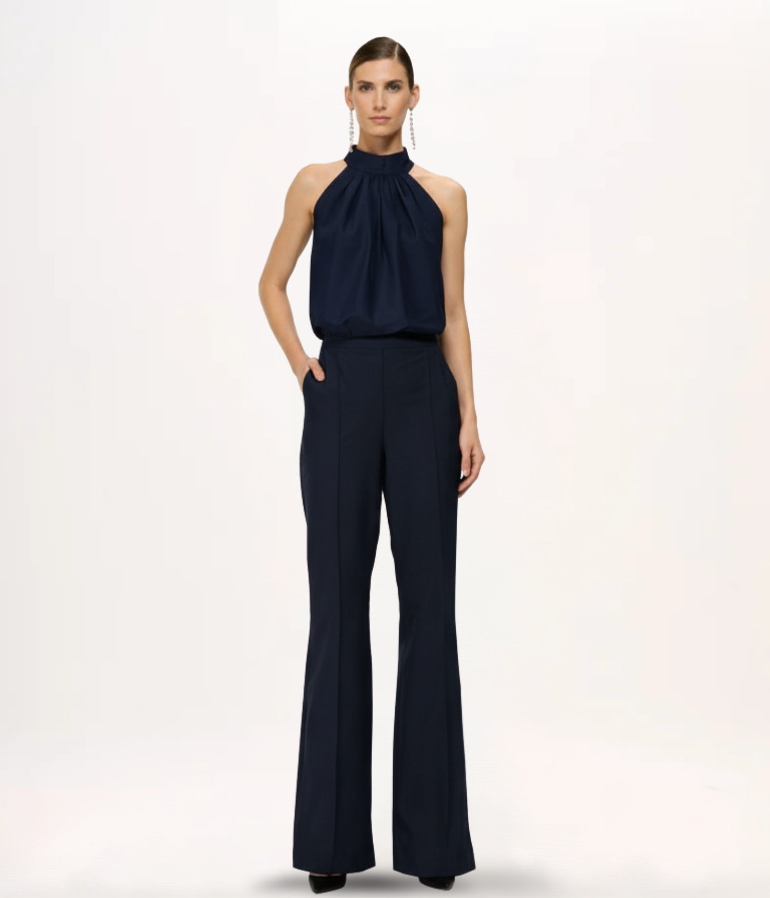 A peça coringa definitiva para compor looks de casamento civil, jantares de ensaio, coquetéis e eventos noturnos. O decote alto pede cabelos totalmente presos, como um coque ou rabo de cavalo polido. Combine com pantalonas de alfaiataria (para uma silhueta alongada e executiva) ou com saias evasê volumosas. O colo coberto permite ousar em maxi brincos estruturados.