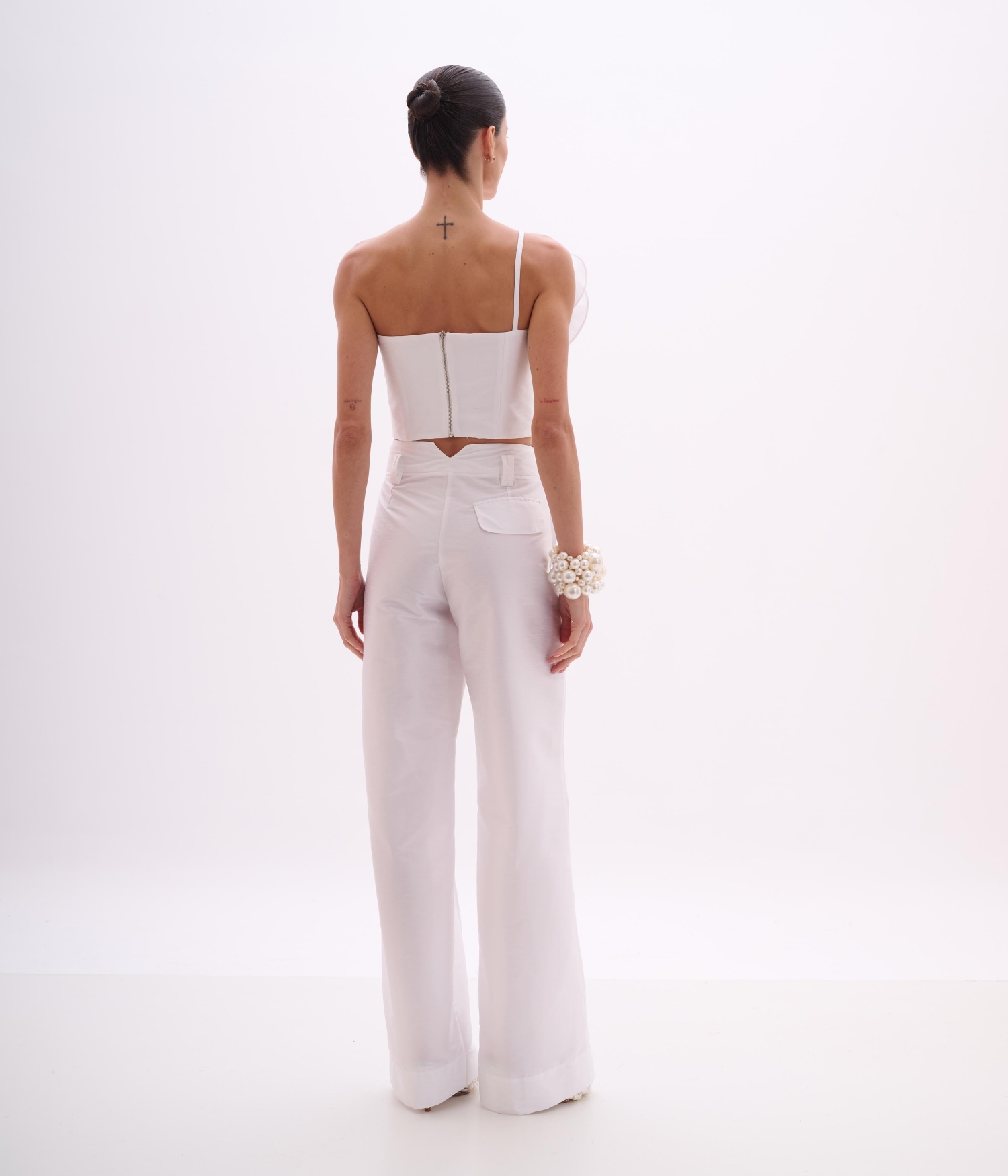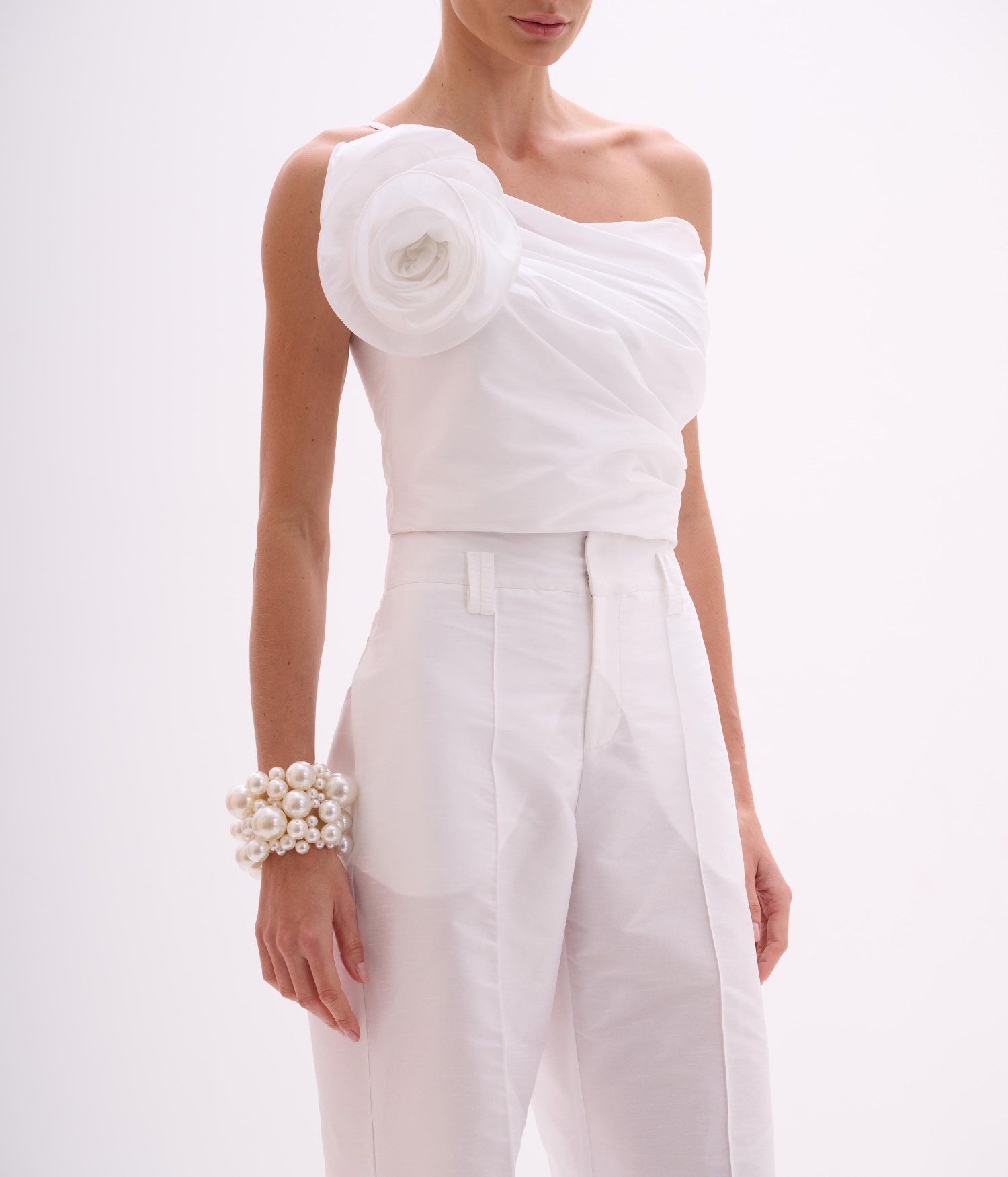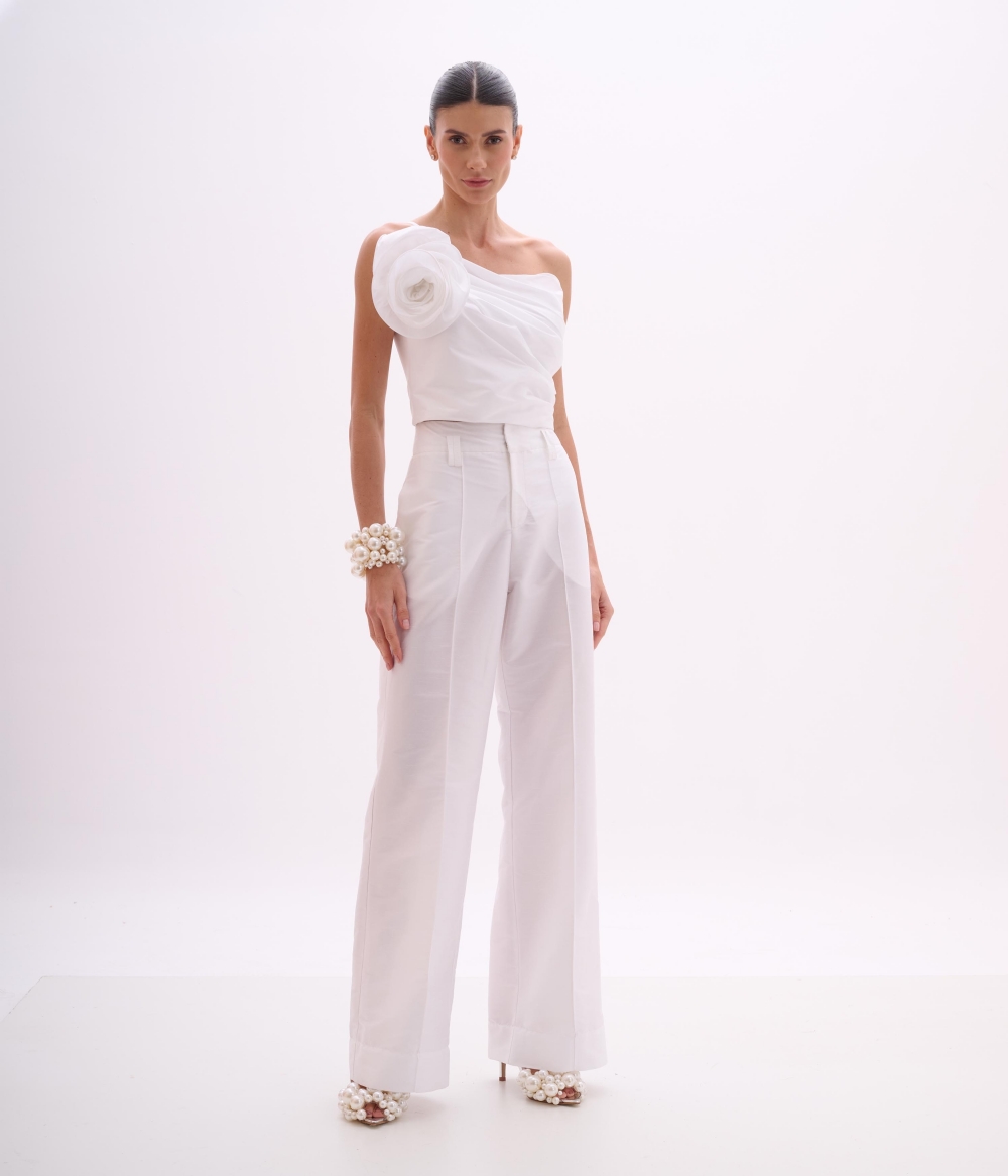 A blusa ombro só em shantung off white é uma peça marcante, que combina feminilidade e design contemporâneo. Com a aplicação de flor no busto e a alça fina de apenas um lado, o modelo valoriza os ombros e cria um visual sensual e moderno.