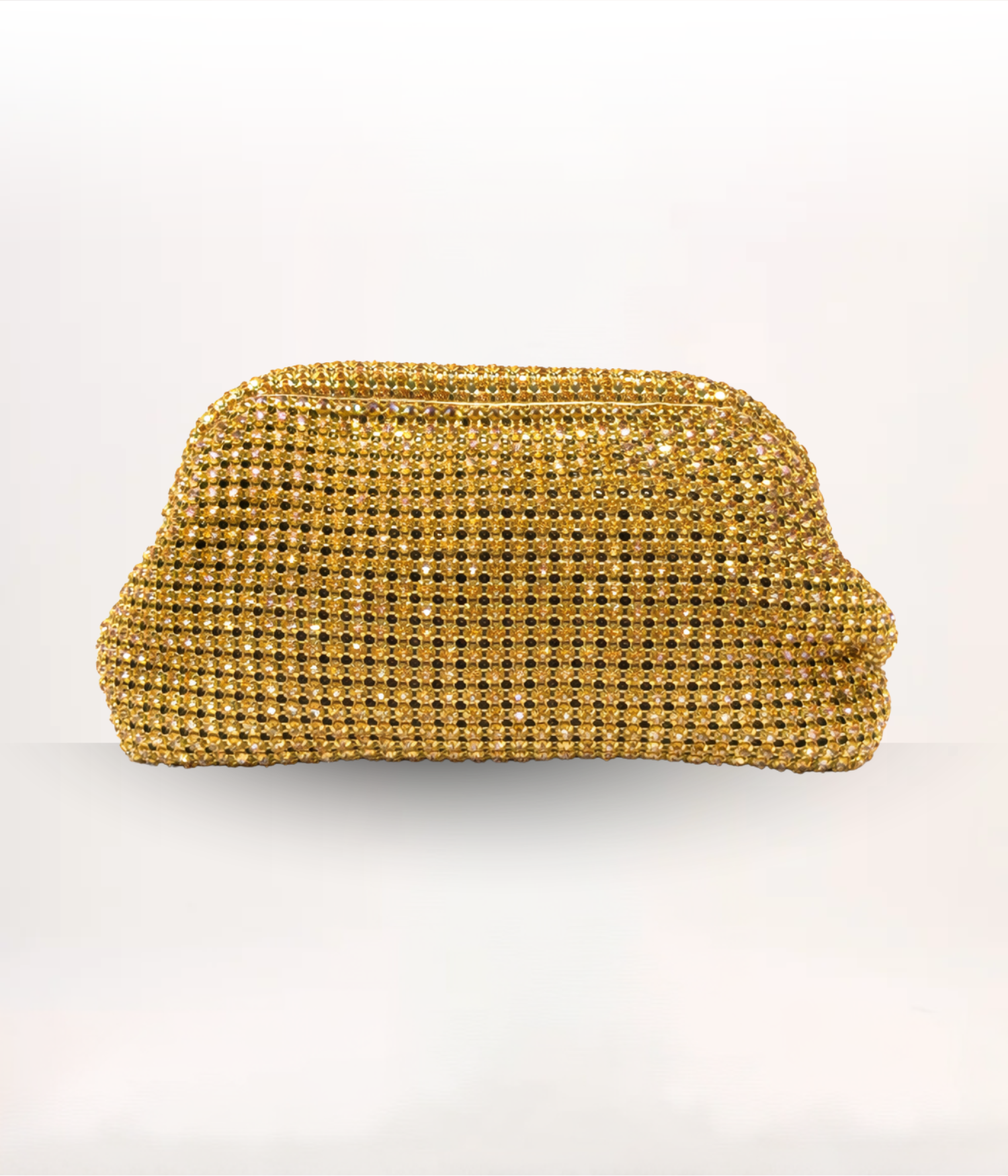 Clutch revestida por pedrarias em tom dourado, refletindo a luz de forma sofisticada e transformando qualquer look em uma composição marcante.