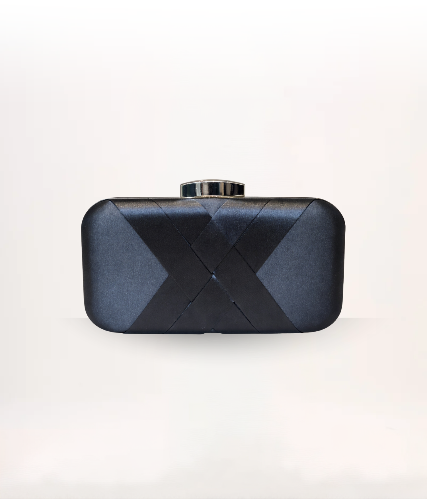 Clutch estruturada em preto com acabamento acetinado e padronagem geométrica em faixas diagonais que se cruzam no centro, criando um desenho sofisticado e arquitetônico.