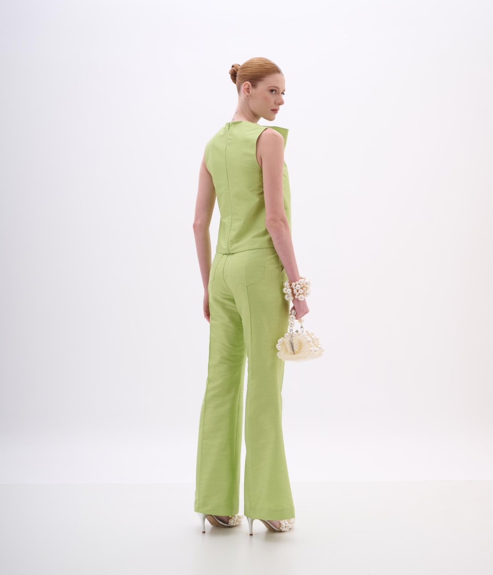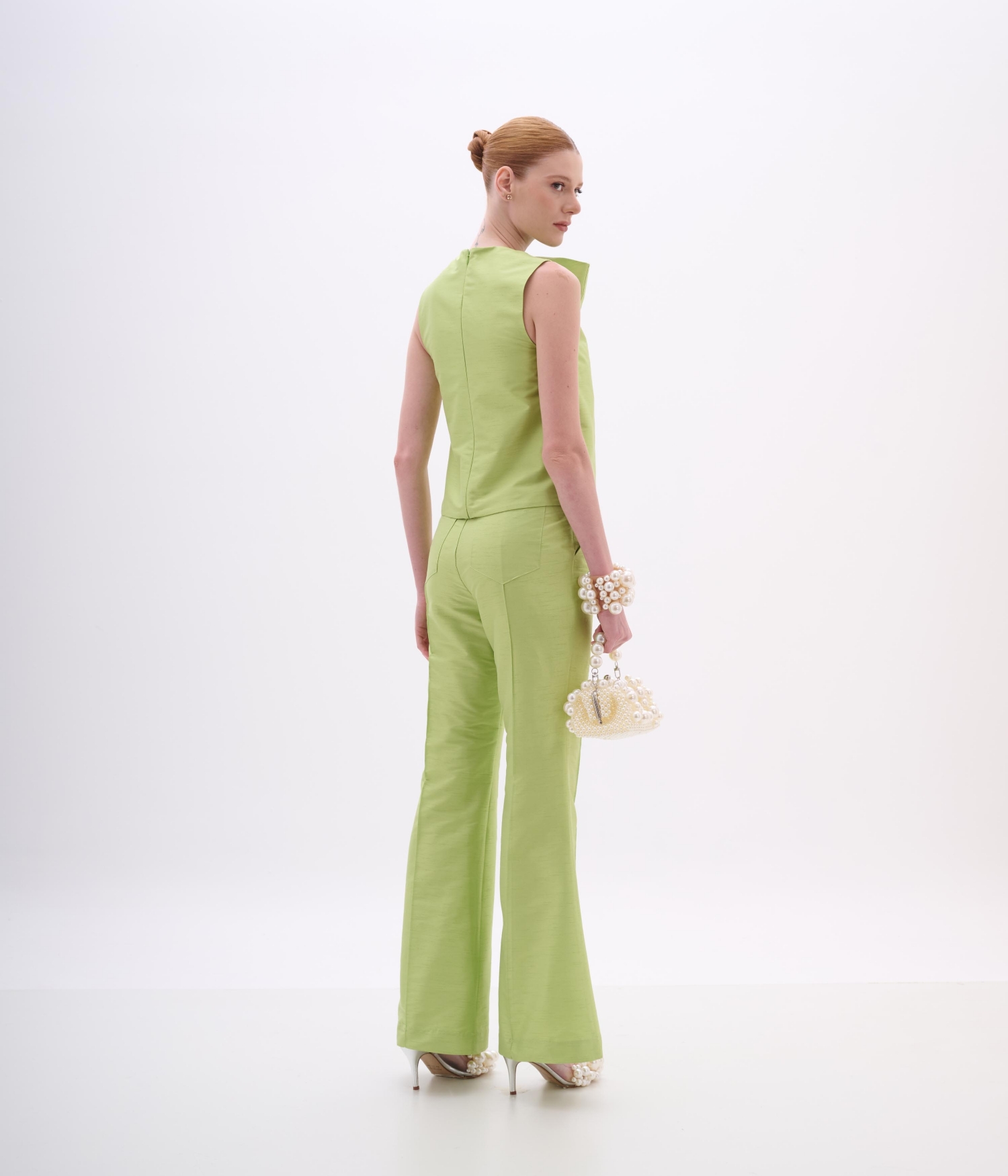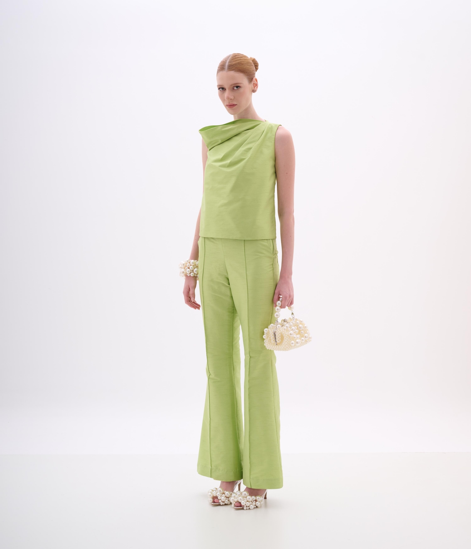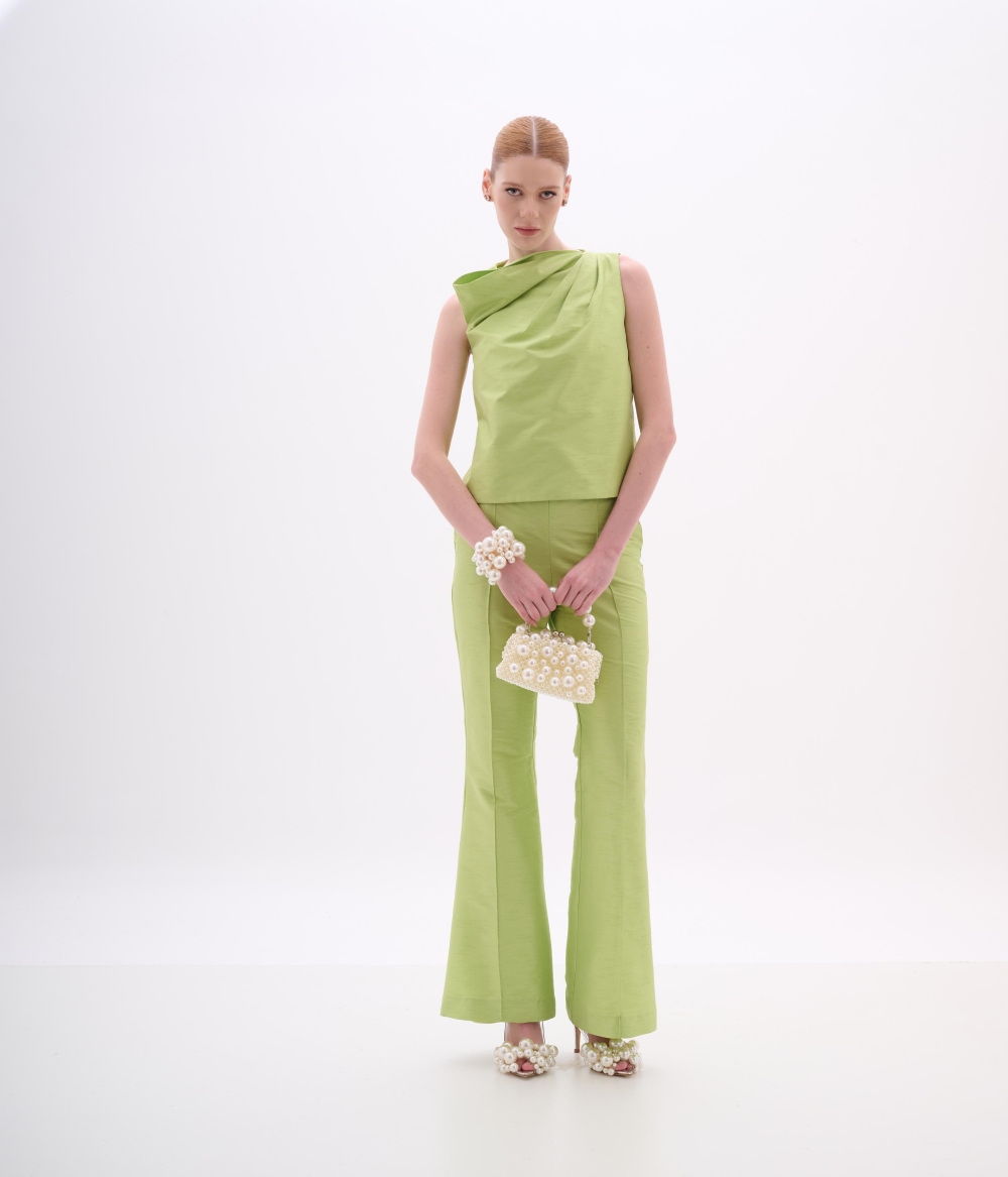 Calça de festa confeccionada em shantung, com acabamento refinado e modelagem flare que valoriza a silhueta. A peça une sofisticação e modernidade na medida certa, ideal para ocasiões especiais que pedem um look impactante e elegante.