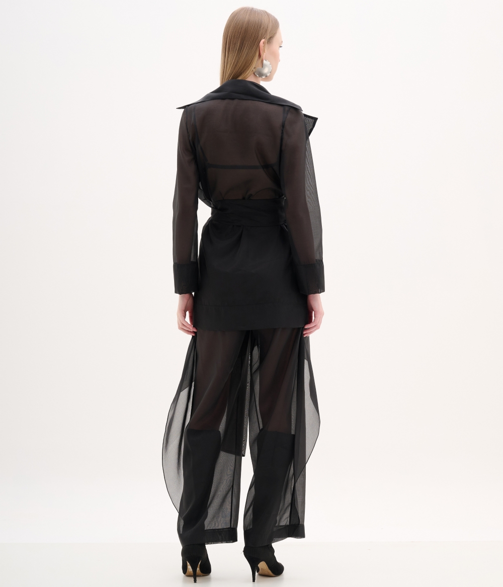 Calça preta com design moderno e sofisticado, perfeita para compor looks impactantes e cheios de personalidade. O destaque da peça está na sobreposição de tecido transparente com caimento fluido, que cria movimento e leveza ao andar.