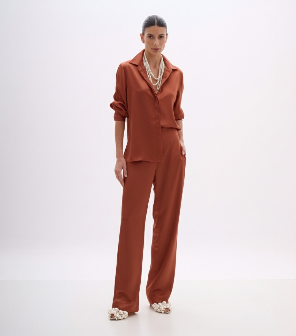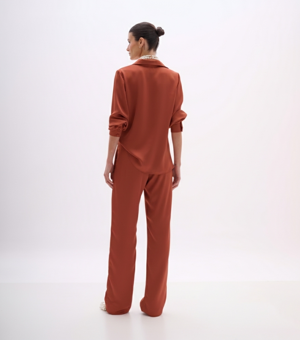 A calça em cetim fluido na cor terracota combina sofisticação e conforto em uma modelagem moderna, ideal para compor produções elegantes com leveza. Seu caimento reto alonga a silhueta, enquanto o brilho delicado do cetim garante um visual refinado e contemporâneo.