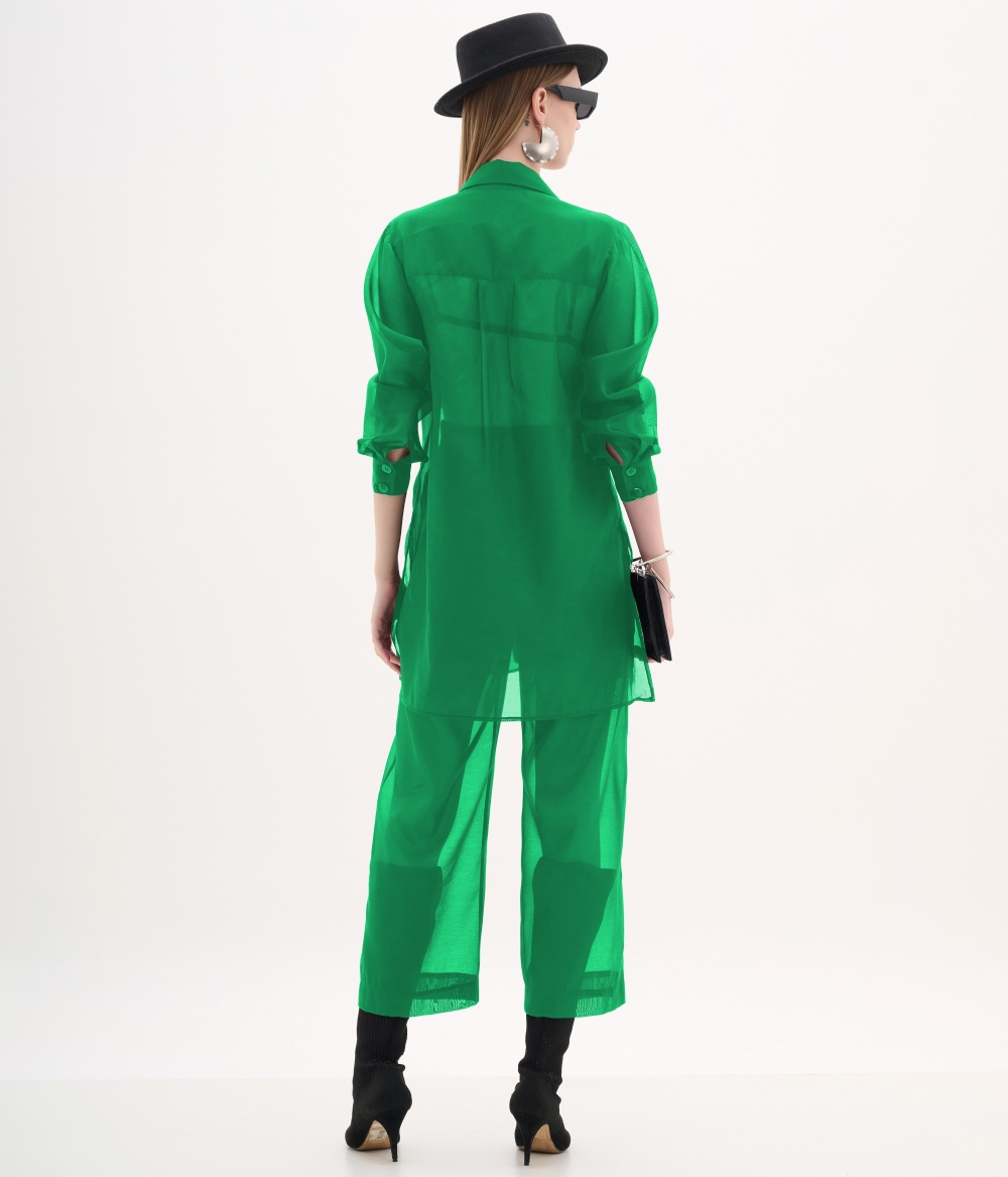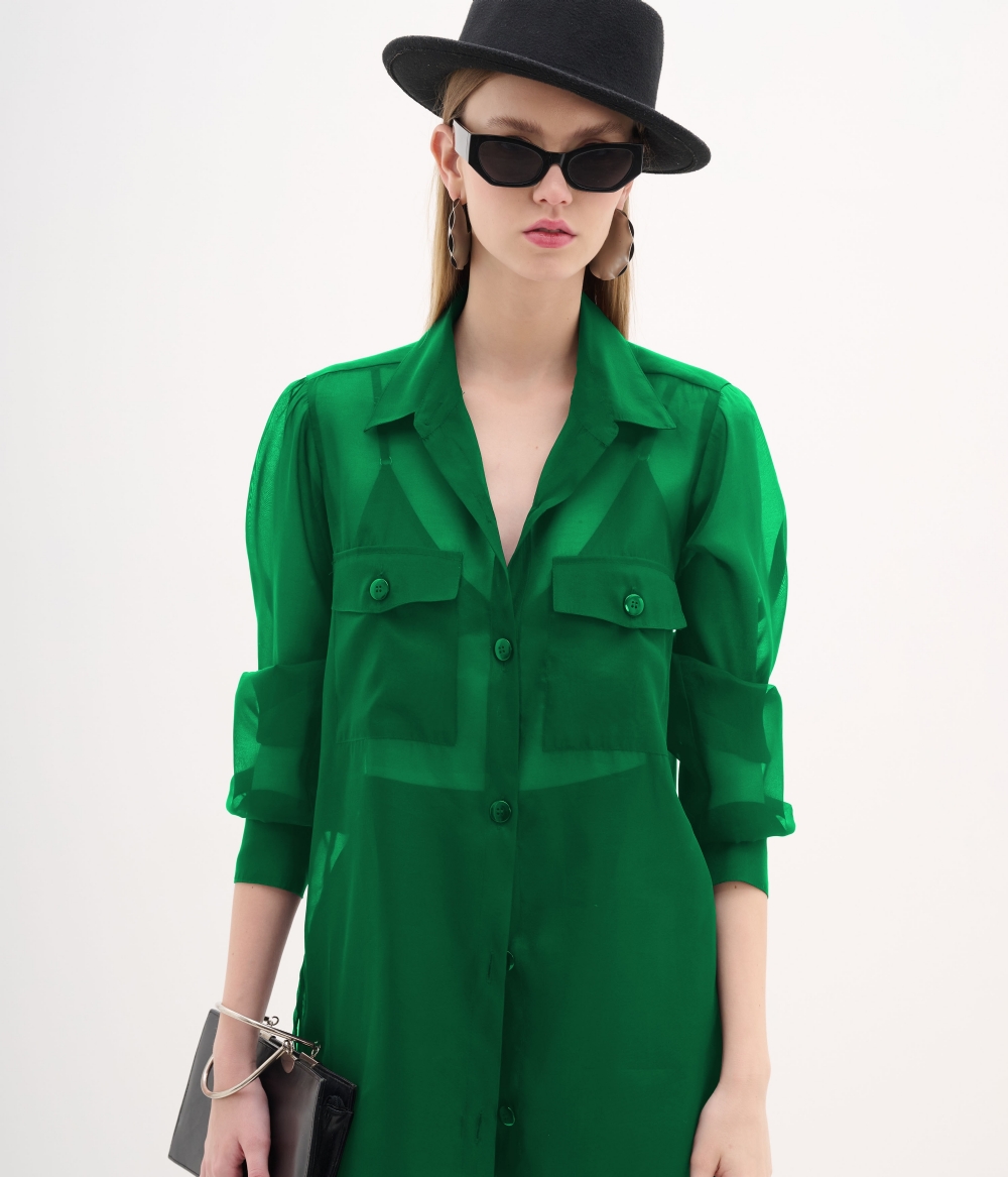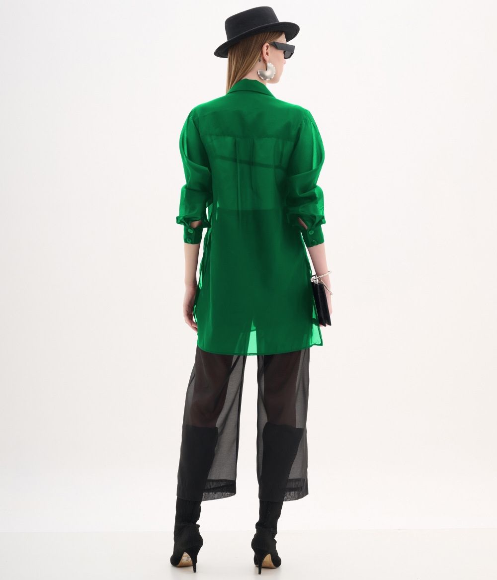 Camisa confeccionada em organza. Camisa mangas longas, fechamento em botões, tecido com transparência.