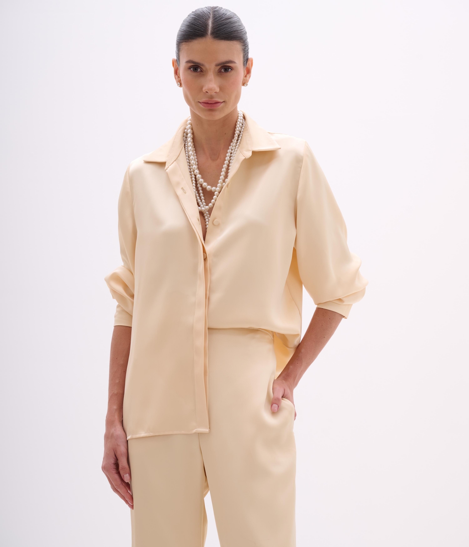 Camisa de modelagem clássica com toque sofisticado, confeccionada em cetim de caimento fluido e acabamento acetinado. A peça une elegância e conforto, ideal tanto para ocasiões formais quanto para composições mais modernas com um toque fashionista.