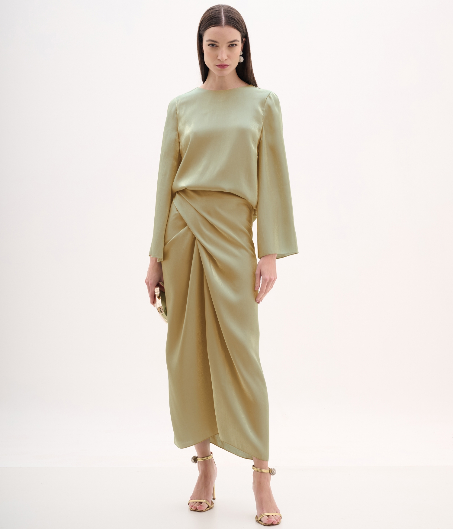 Conjunto de festa elegante composto por blusa de manga longa e saia midi envelope, confeccionado em viscose acetinada no tom areia, com leve brilho dourado. Com caimento leve e visual minimalista, é uma opção refinada e moderna para ocasiões especiais.