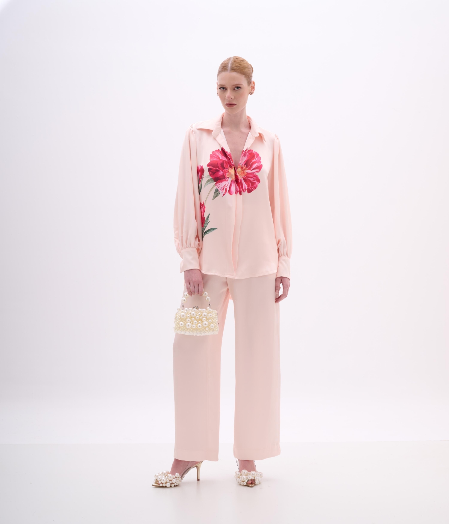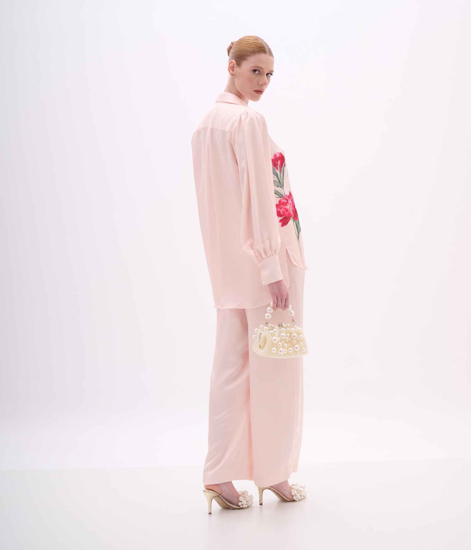 O Conjunto em Cetim Estampado Rosé traz a sofisticação do visual "easy chic" com uma proposta de alfaiataria fluida e contemporânea. Composto por uma chemise de mangas longas e uma calça pantalona (wide leg), o modelo une o conforto do corte amplo à elegância do cetim. A estampa floral exclusiva, com peônias em tons de rosa e vermelho sobre um fundo rosé suave, adiciona romantismo e personalidade à produção. A chemise possui gola clássica e punhos franzidos, enquanto a calça de cintura alta alonga a silhueta com seu caimento líquido e movimento gracioso.