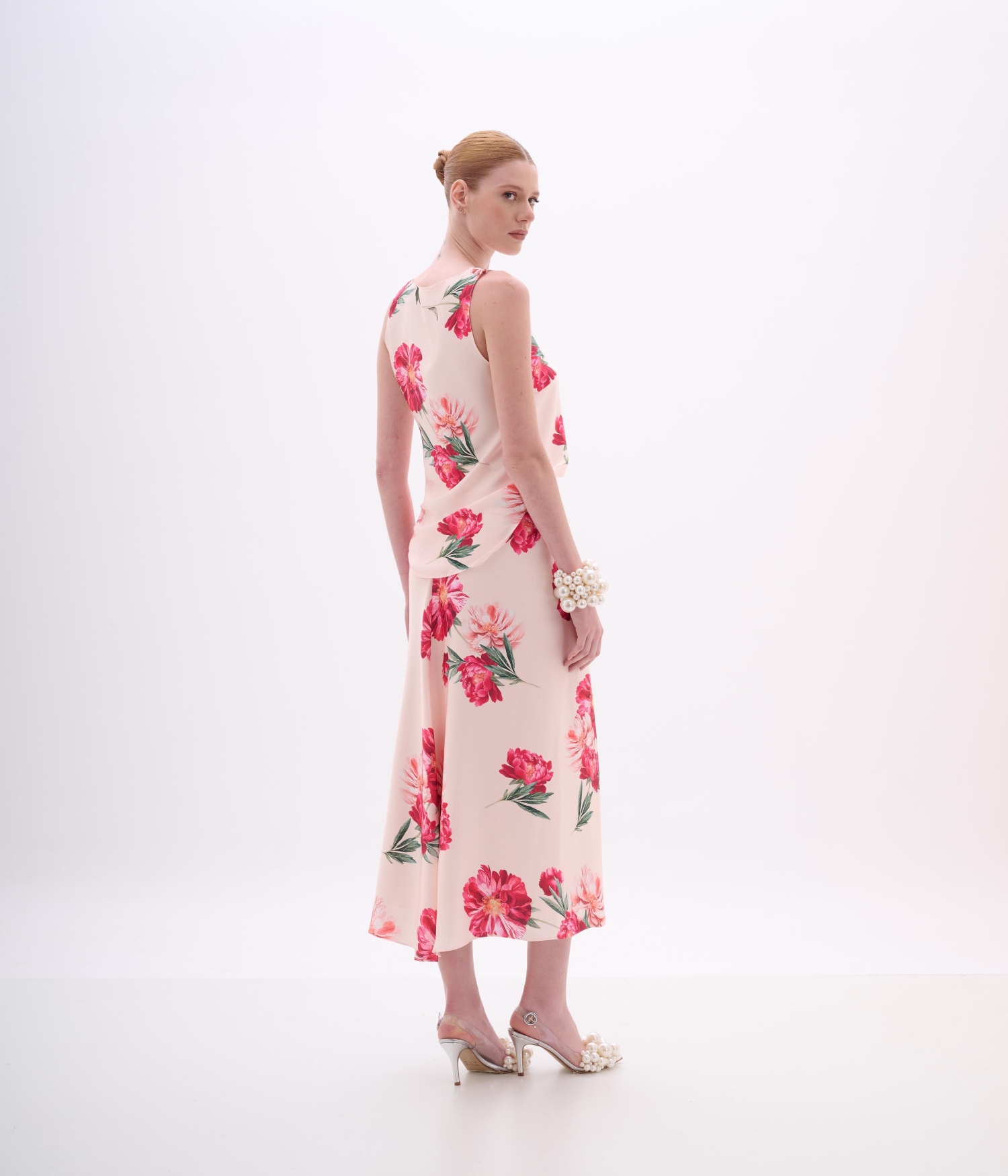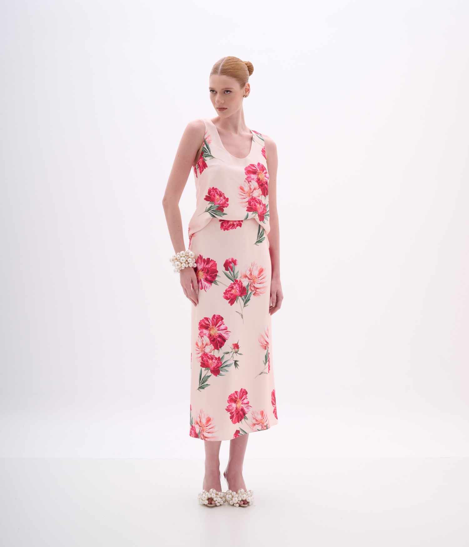 - Detalhes: Estampa floral exclusiva, blusa sem mangas com decote redondo e camadas, saia longa reta, blusa blusada para dentro da saia
