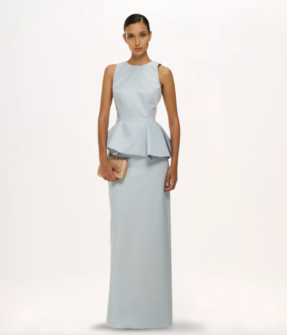 O zibeline é a alma desta criação. Sua textura firme e encorpada é o que permite a construção geométrica e armada do peplum sem que ele perca a sua forma ao longo das horas. Além da excelente sustentação arquitetônica, o zibeline possui um brilho acetinado incrivelmente nobre que reflete a luz de maneira sutil, enriquecendo a claridade das cores e mantendo a produção livre de amassados.