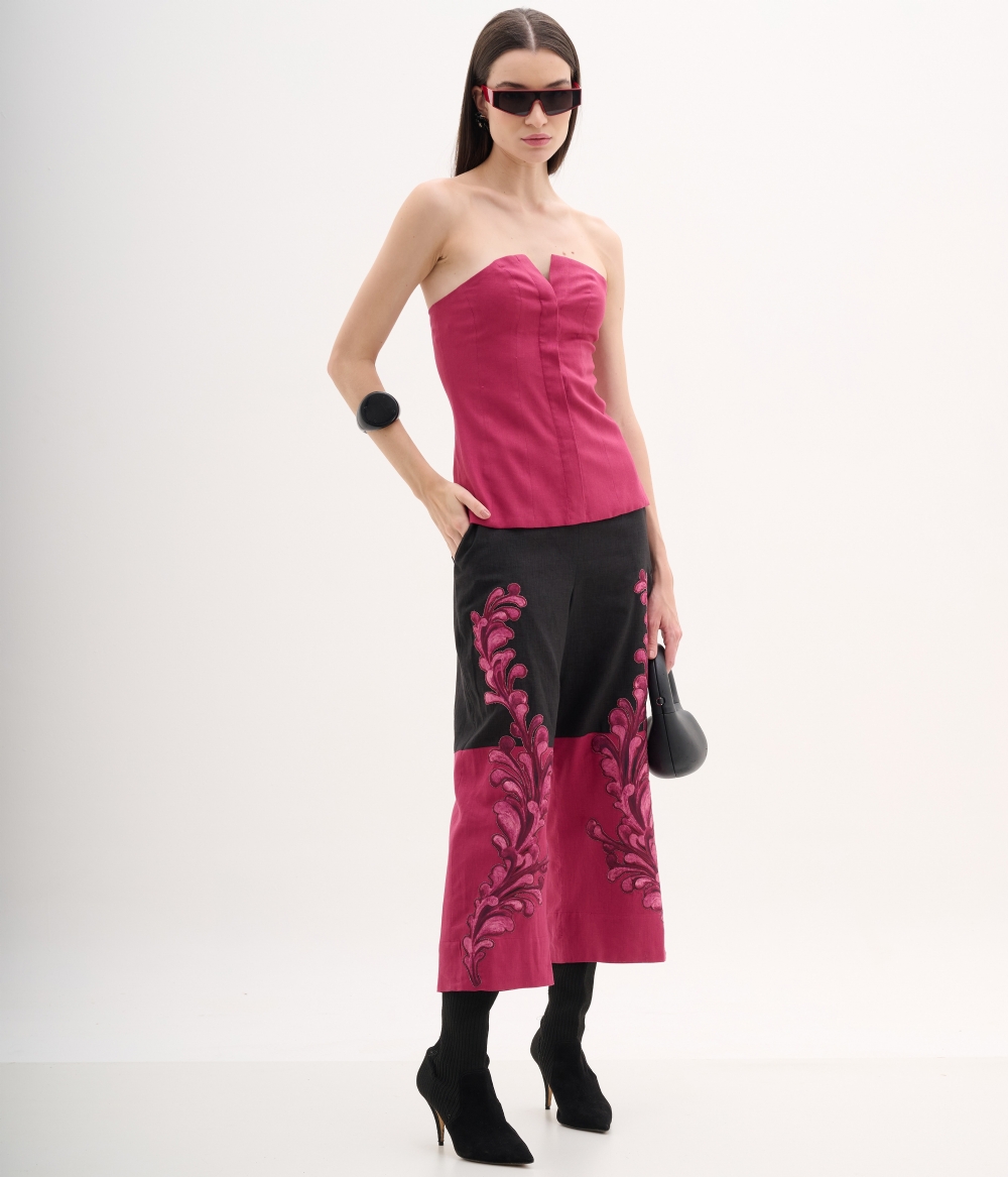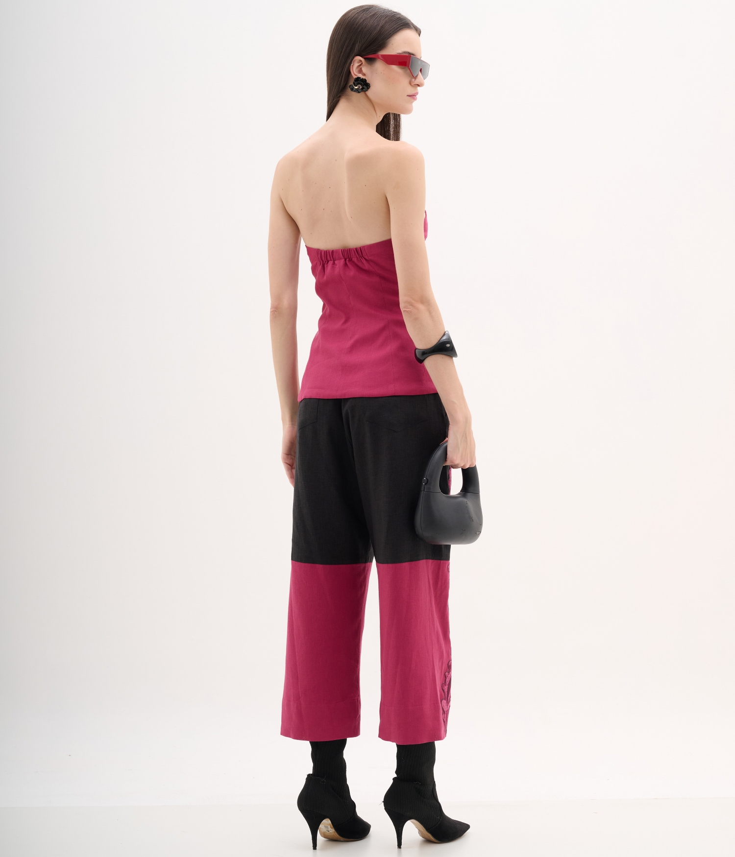 Conjunto sofisticado confeccionado em viscolinho encorpado, tecido leve, respirável e com caimento elegante. O top tomara-que-caia possui recorte central sutil e modelagem estruturada que valoriza o busto com modernidade.