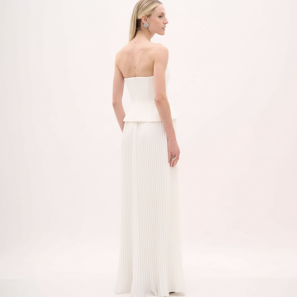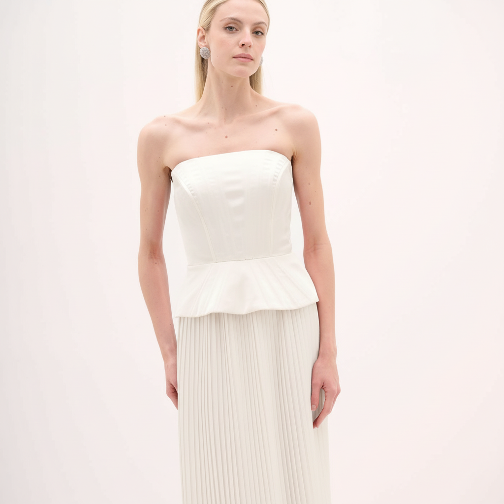 O Conjunto CJ1133 Branco é uma proposta elegante e contemporânea, que combina estrutura e fluidez em um visual sofisticado. O top peplum apresenta construção de alfaiataria, com busto tomara que caia e barbatanas que sustentam e definem a silhueta com firmeza e conforto. O recorte peplum na cintura cria um desenho escultural e valoriza o corpo com elegância. Para equilibrar, a saia longa plissada traz leveza e movimento, criando textura refinada e uma presença marcante. Um conjunto versátil para ocasiões especiais, com acabamento premium.