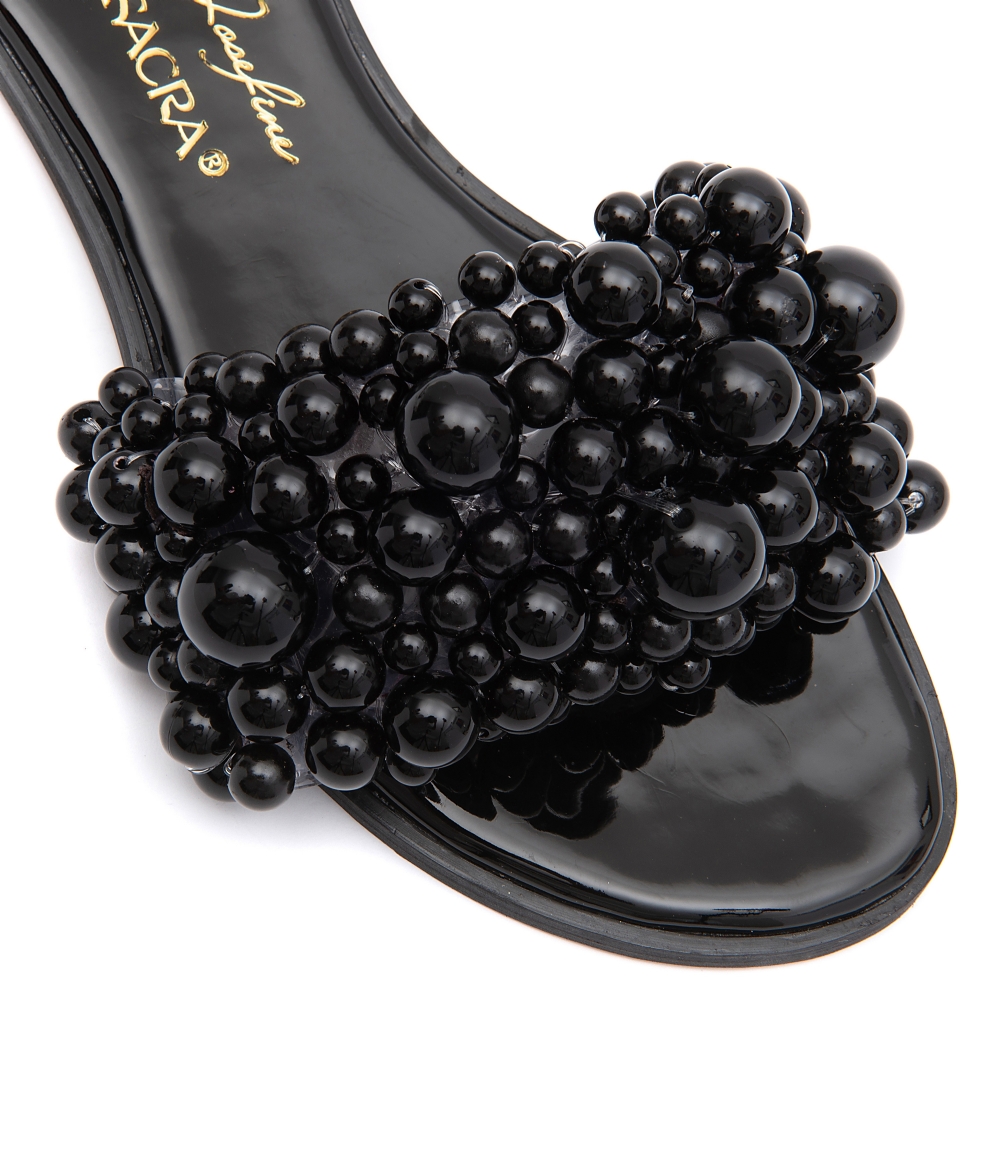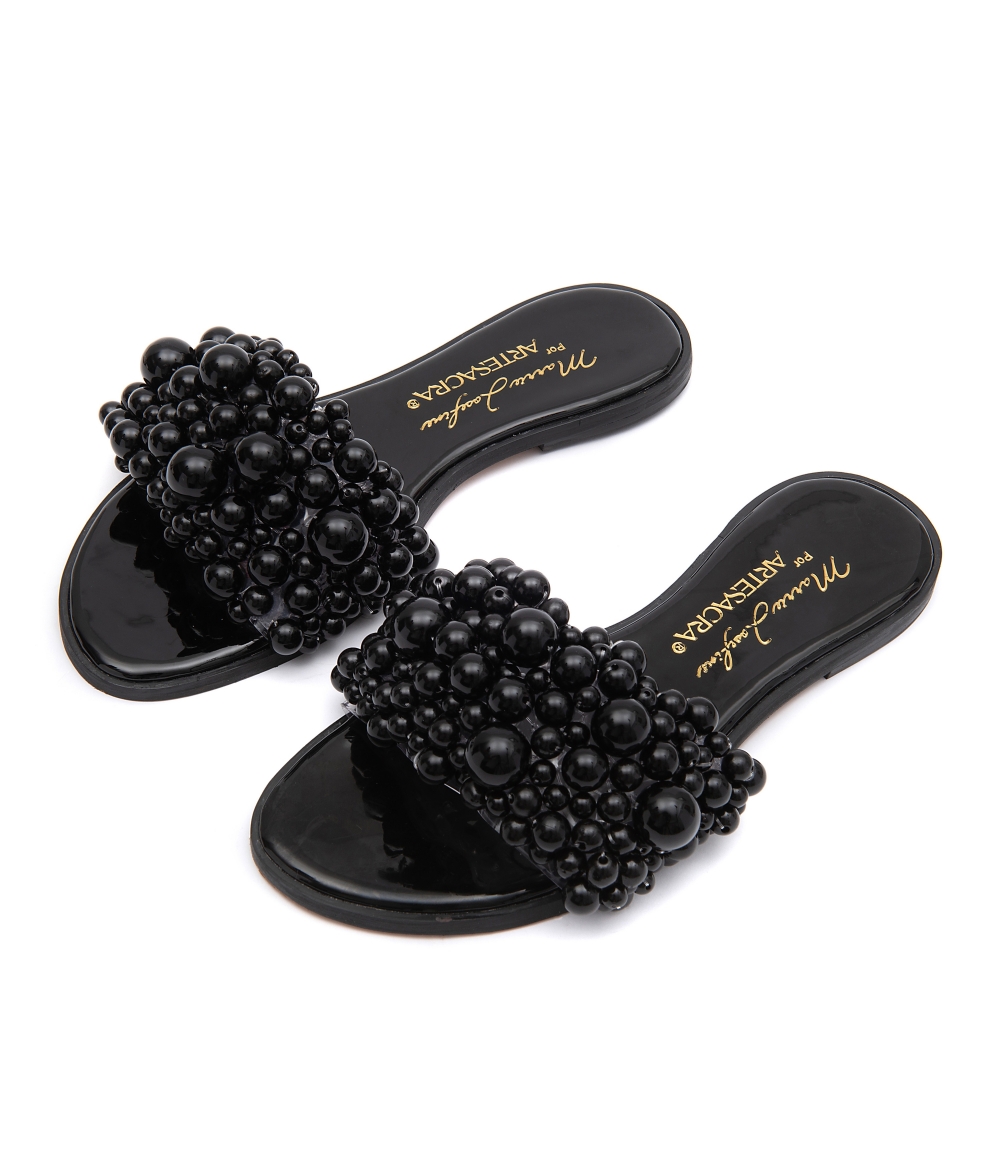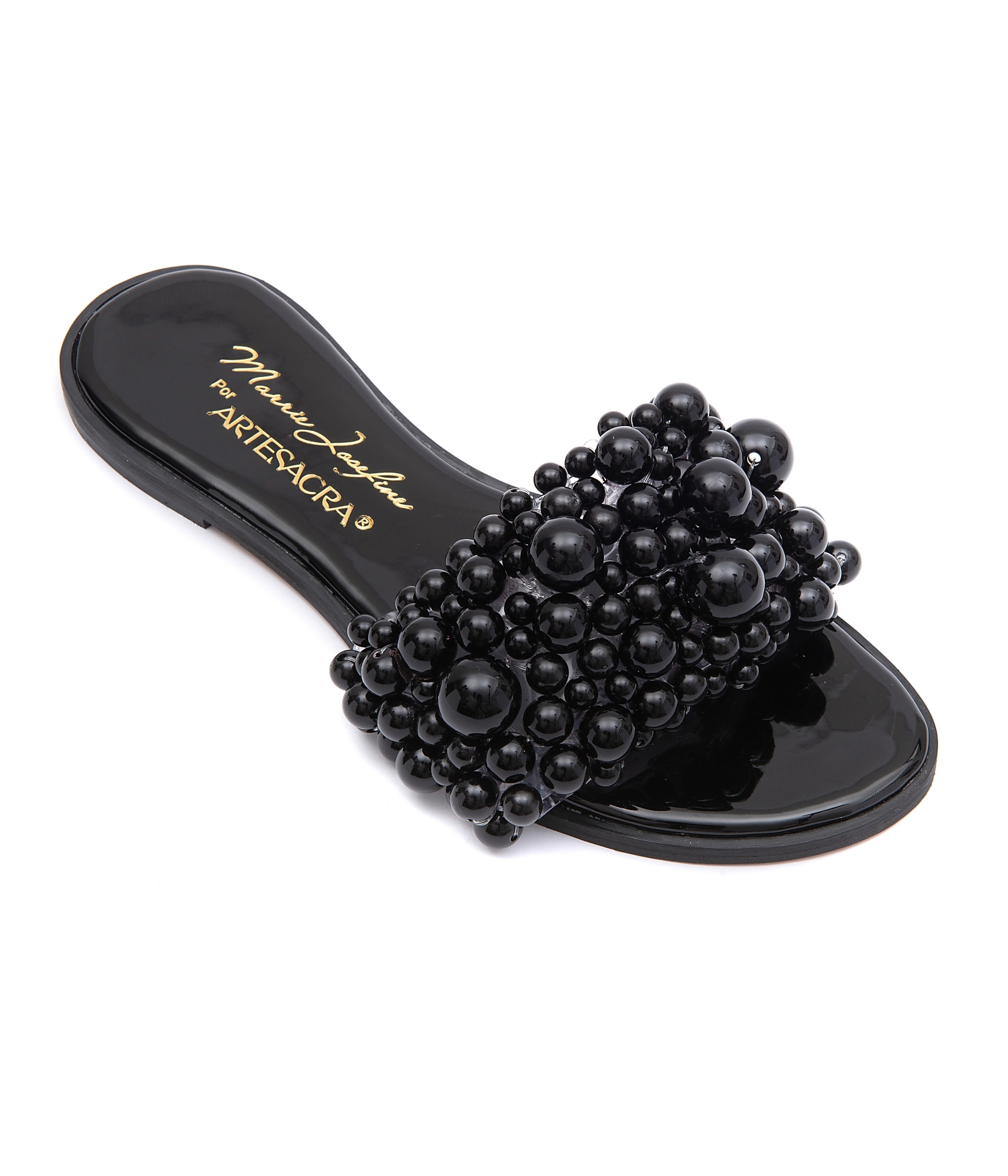 Rasteira em silicone, verniz preto. Bordado em pérolas pretas. Ref 5458P