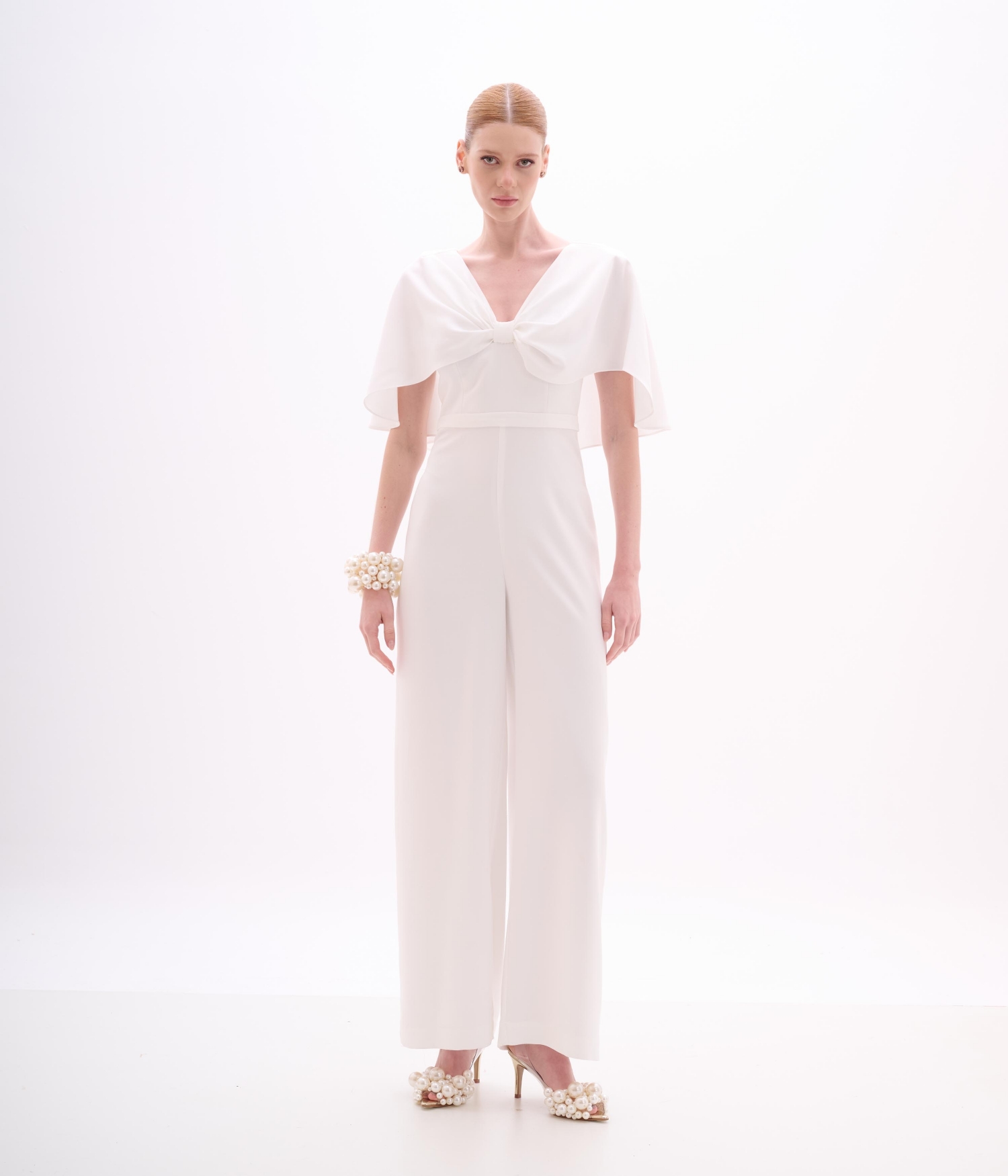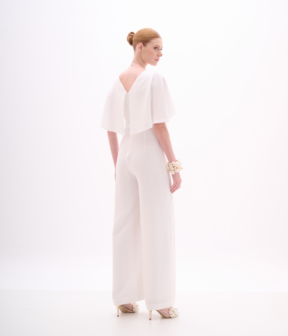 Macacão em Crepe Acetinado Branco com Mangas Capa