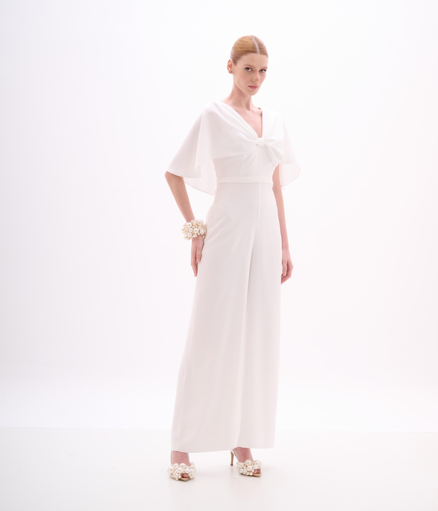 O Macacão em Crepe Acetinado Branco é uma obra-prima de alfaiataria moderna, unindo a imponência de um vestido de festa com a contemporaneidade do macacão. O destaque absoluto são as mangas capa (cape sleeves), que cobrem delicadamente os ombros e trazem um movimento régio e sofisticado. O decote em V é valorizado por um laço estruturado no busto, criando um ponto focal feminino e elegante. A cintura é marcada, definindo a silhueta antes de se abrir em uma calça pantalona (wide leg) fluida e alongada. Na cor branca, é a escolha perfeita para noivas modernas (casamento civil, noivado), Réveillon ou eventos de alto luxo.