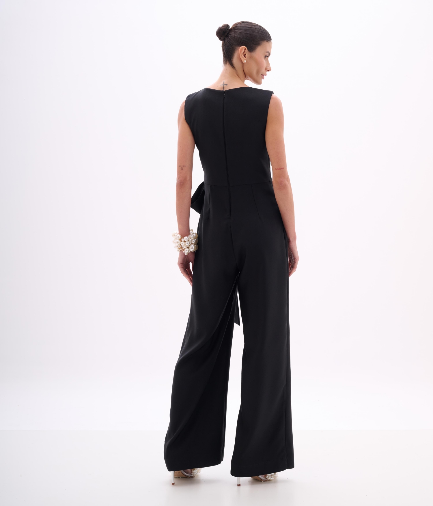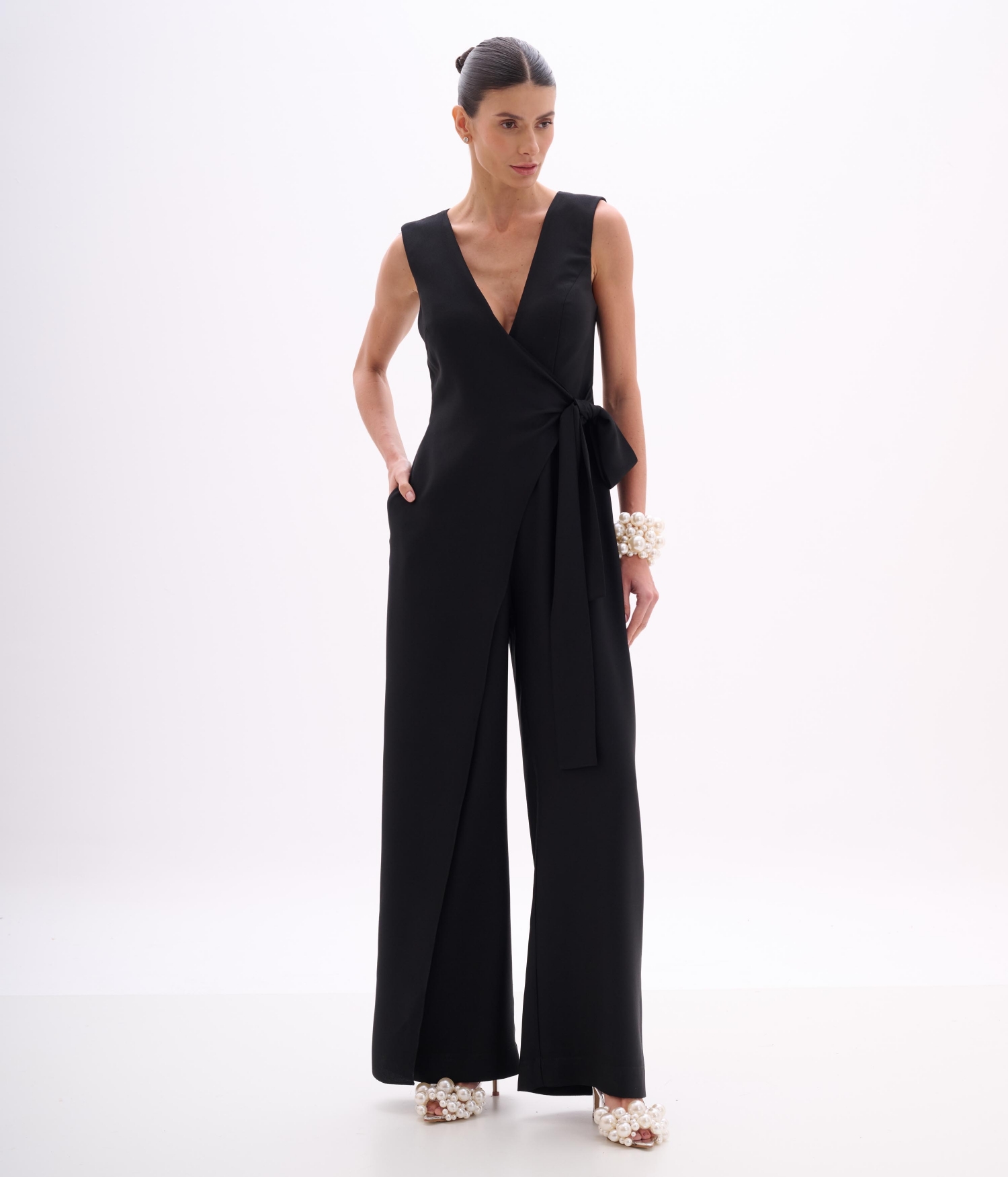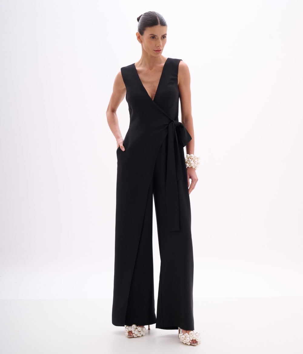 - Detalhes: Decote V transpassado, amarração na cintura, pernas wide leg, sem mangas