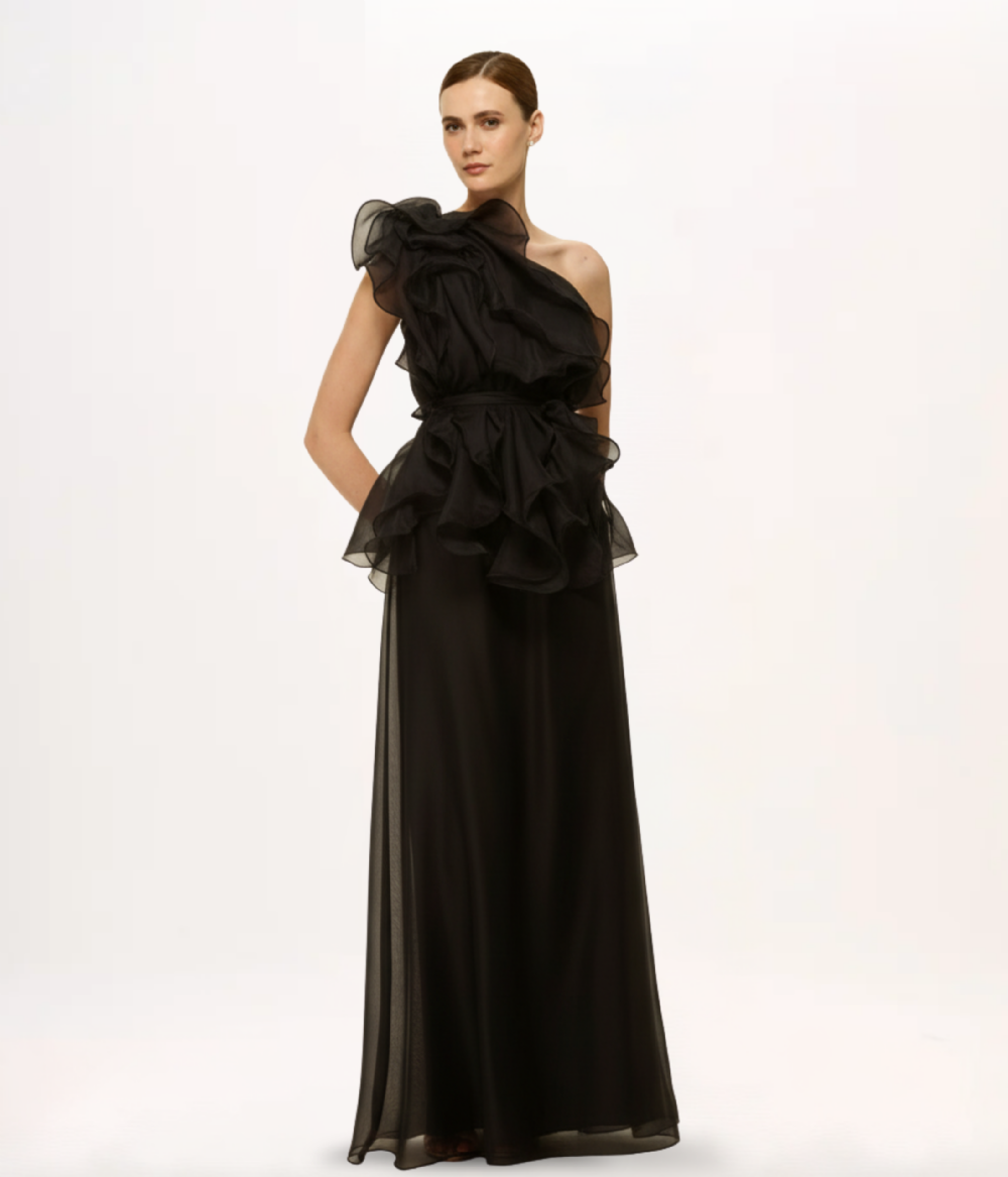 • Transparência sutil em organza: adiciona profundidade, textura e uma aura de mistério riquíssima ao visual.