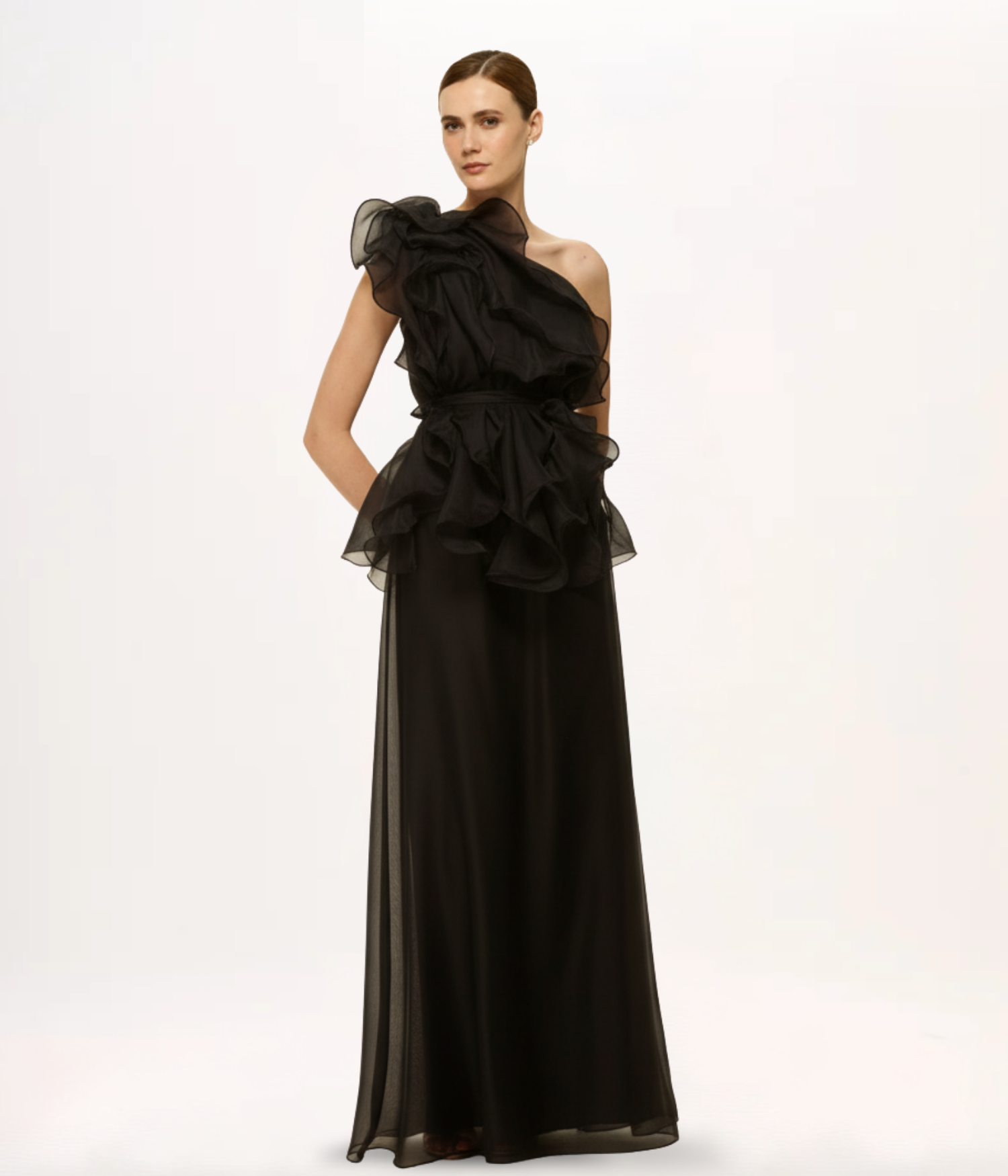 A organza é um tecido nobre celebrado por sua fina espessura e aspecto levemente translúcido. Nesta peça, ela entrega uma estrutura sutil que não pesa no corpo, mantendo o volume da saia sempre arejado e com um aspecto liso requintado. A composição estruturada garante excelente durabilidade e resistência para suportar longas noites de evento com visual impecável.