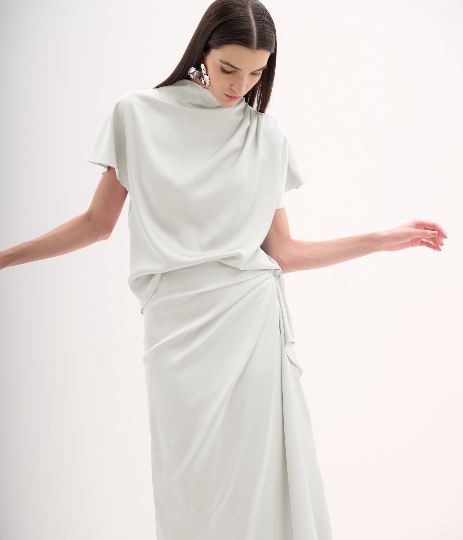 Confeccionada em cetim, um tecido nobre e atemporal, conhecido por sua superfície lisa, brilho intenso e caimento fluido. Sua textura luxuosa e a capacidade de refletir a luz de forma elegante o tornam ideal para peças que exigem sofisticação e um toque agradável à pele.