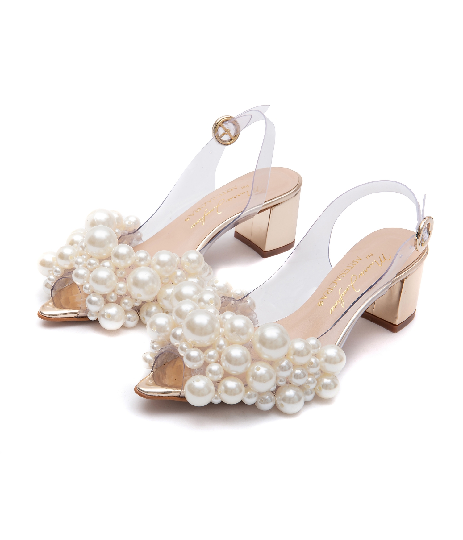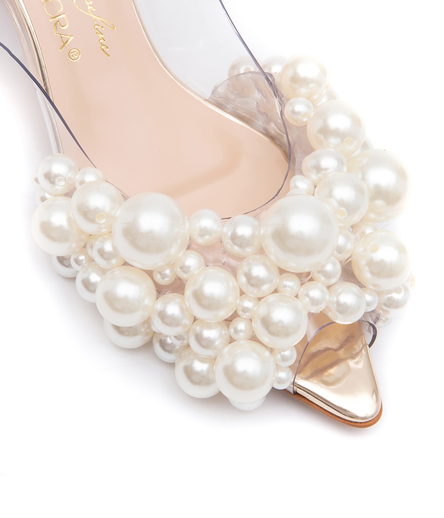 Salto bloco 4.5 cm, Silicone transparente, spechio ouro ligth bordados em pérolas . Ref 315