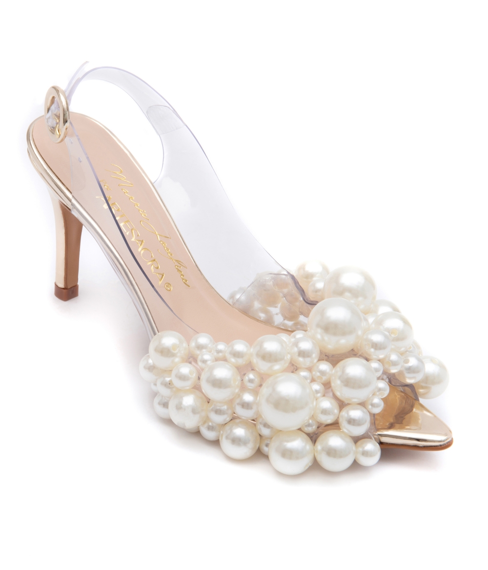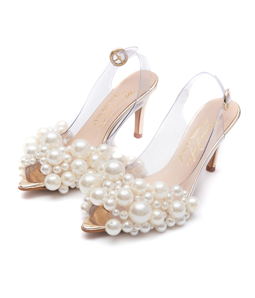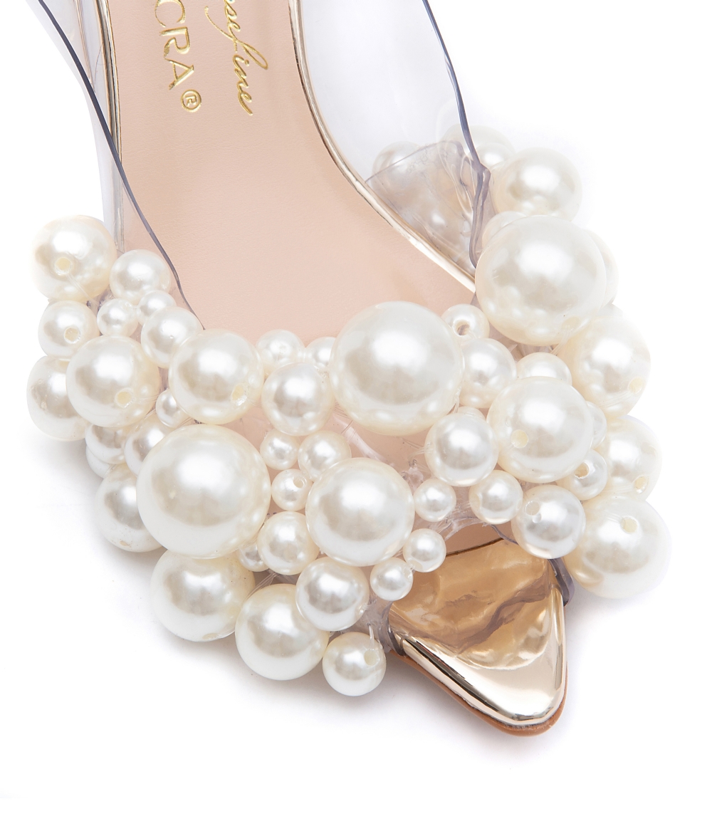 Salto Médio fino 8cm em silicone transparente, spechio ouro ligth e bordados em pérolas. Ref 3106