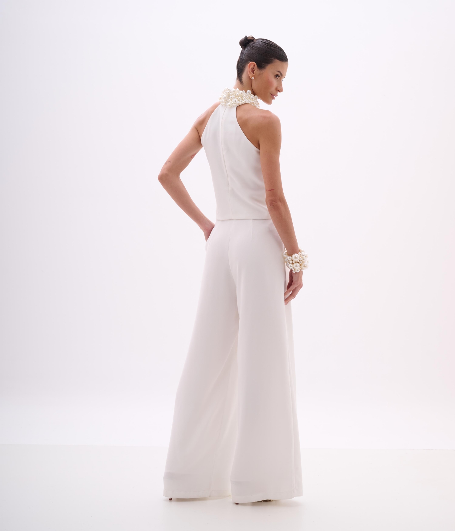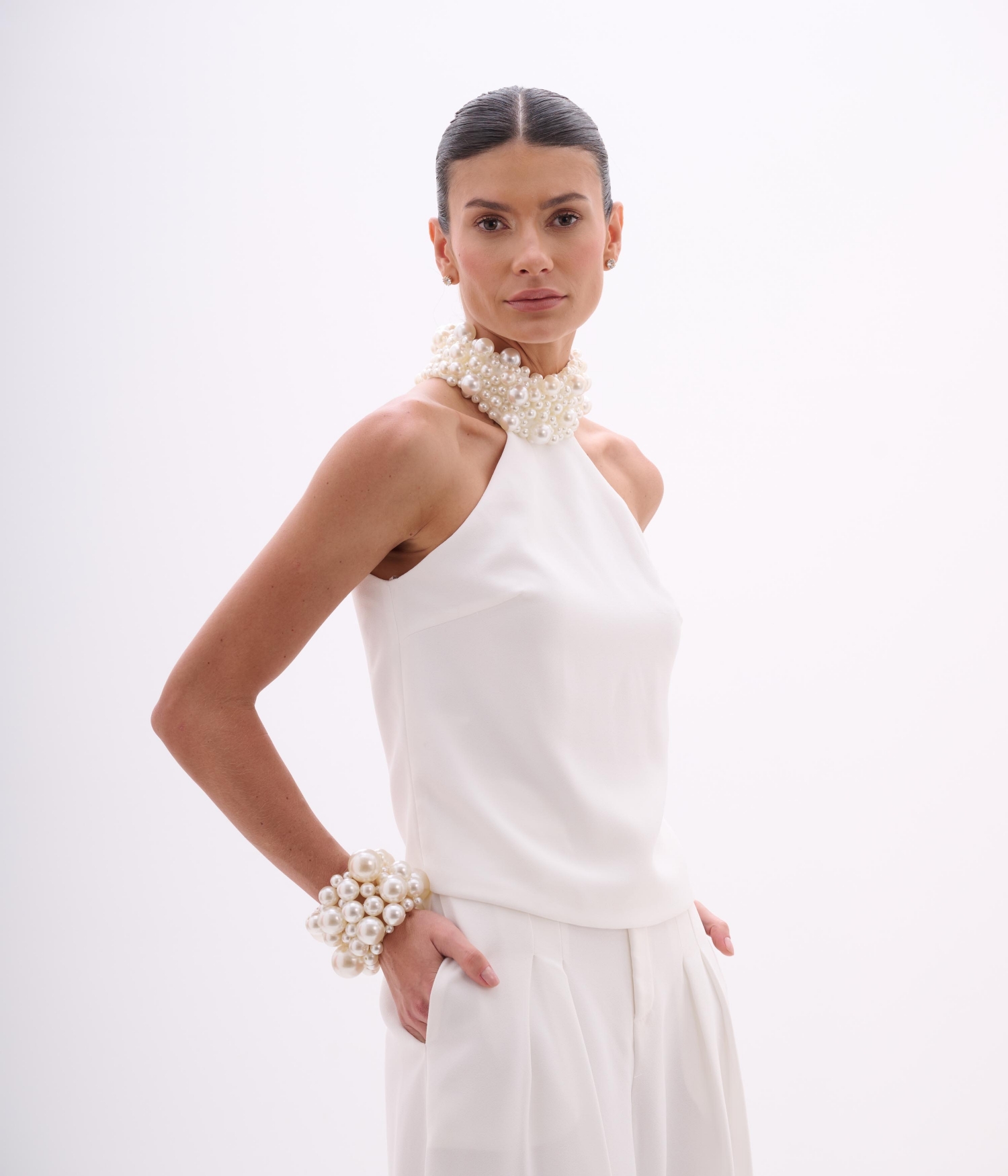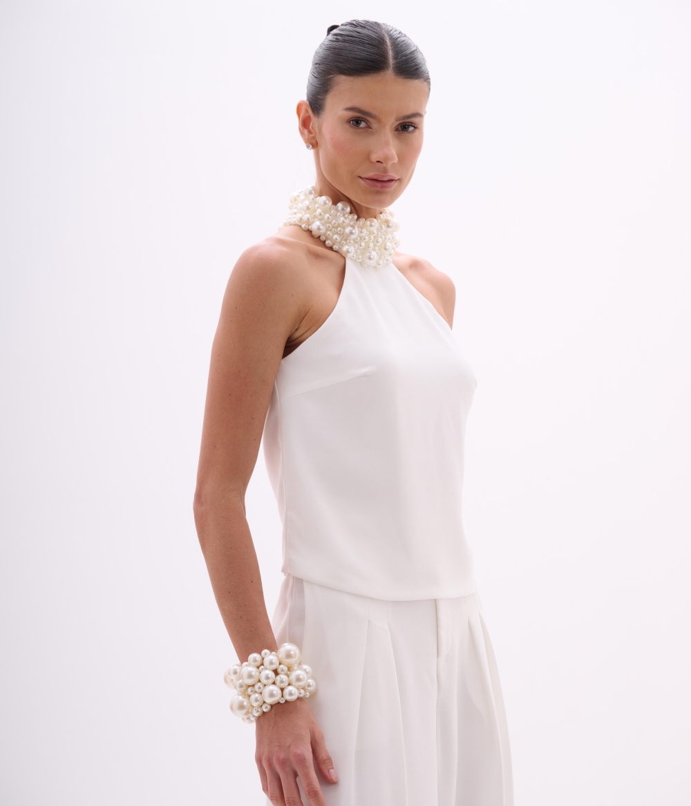 Top Frente Única em Crepe Acetinado Off-white com Bordado de Pérolas