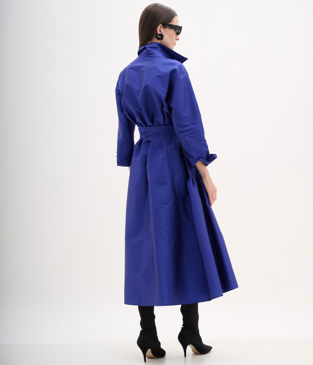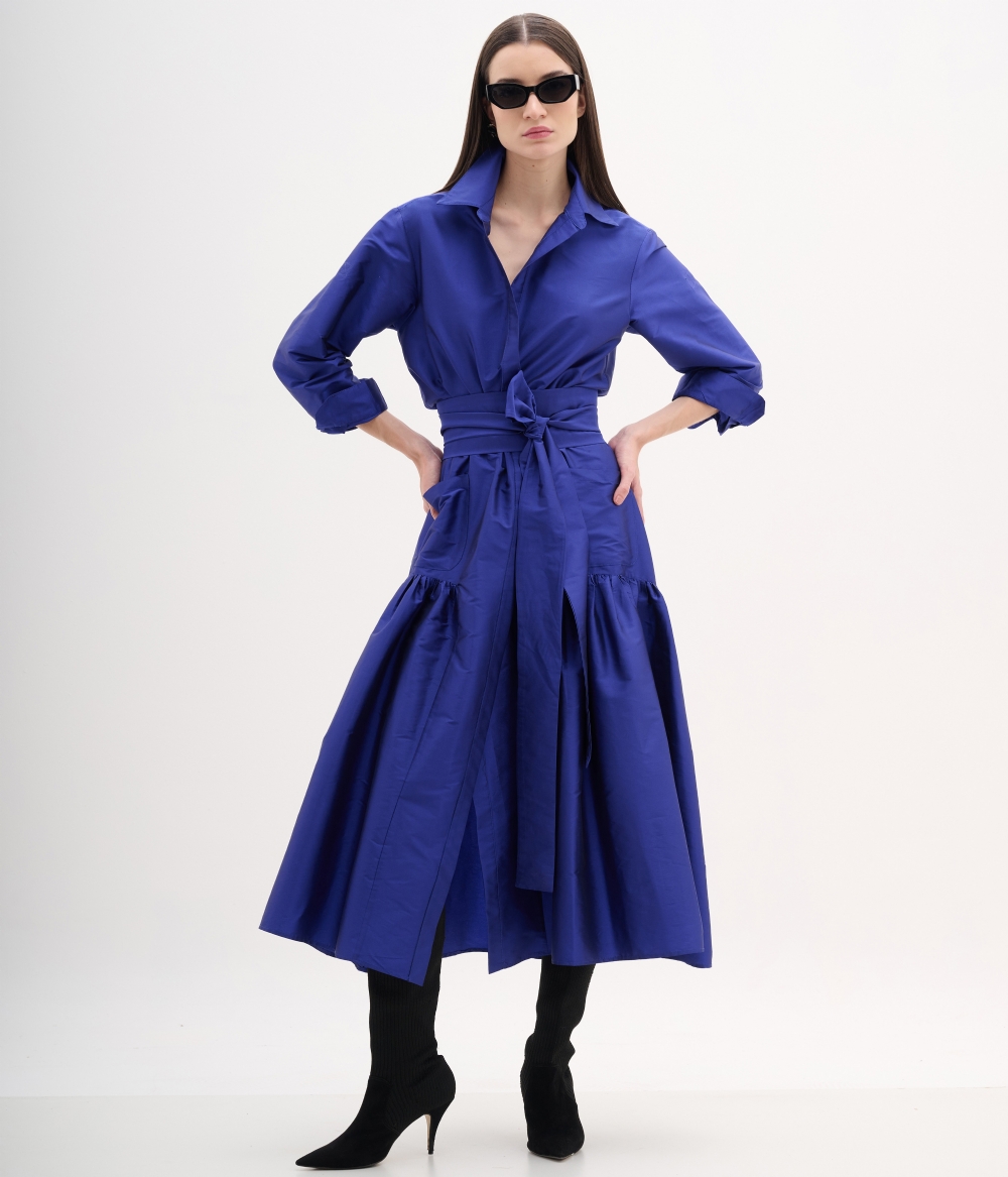 O vestido alfaitaria confeccionada em tafeta. A peça apresenta modelagem solta, decote v e abotoamento frontal e bolsos frontais, proporcionando um visual romântico e elegante. Possui comprimento longo, mangas longas com punhos, faixa para acinturar.