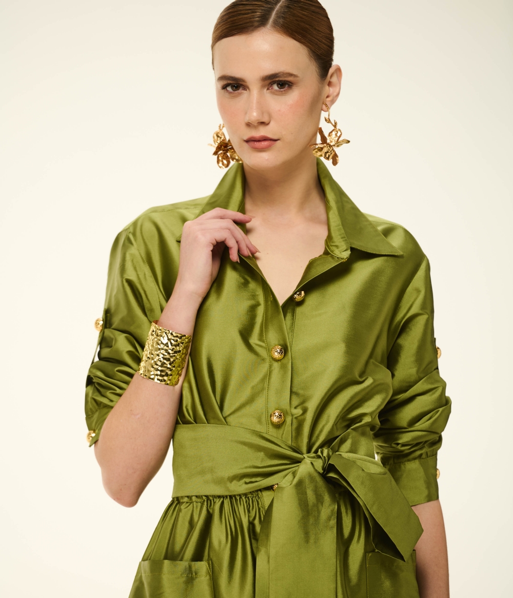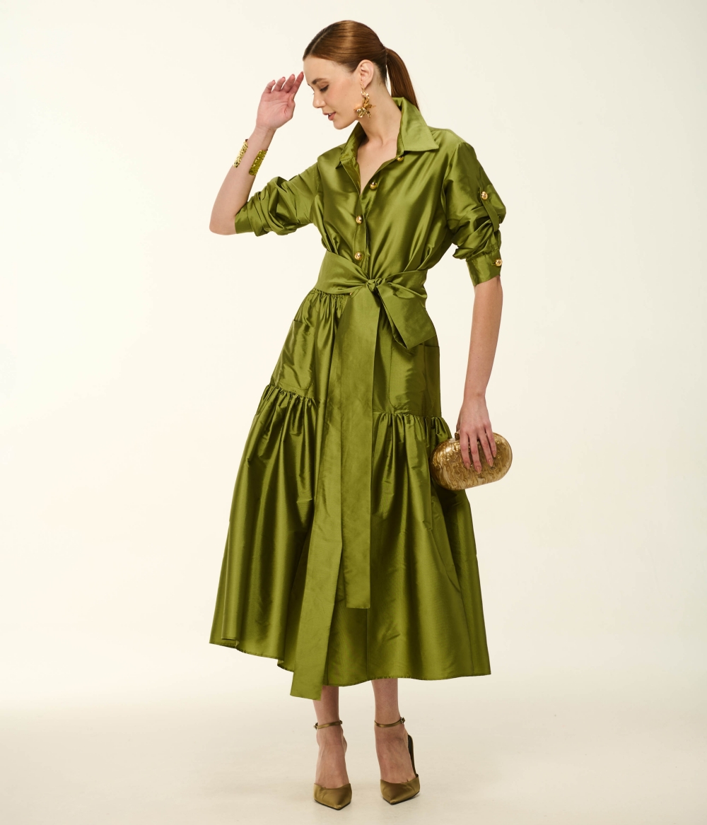 O Vestido VL966 eleva o conceito de chemise a um patamar de alta costura e glamour absoluto. Confeccionado em tafetá de brilho suntuoso e caimento estruturado, o modelo apresenta uma parte superior com gola clássica e abotoamento frontal, transmitindo uma elegância atemporal. As mangas longas ganham um toque de sofisticação com o acabamento de botões dourados e punhos que podem ser sutilmente repuxados. A cintura é perfeitamente marcada por um cinto faixa do mesmo tecido, que se desdobra em uma saia espetacular com bolsos invisíveis e um trabalho assimétrico de babados em camadas. O resultado é um movimento fluido, rico em texturas e de proporções impecáveis. O destaque vibrante fica por conta da cor Picles, um tom de verde oliva luminoso e audacioso que exala personalidade e frescor.