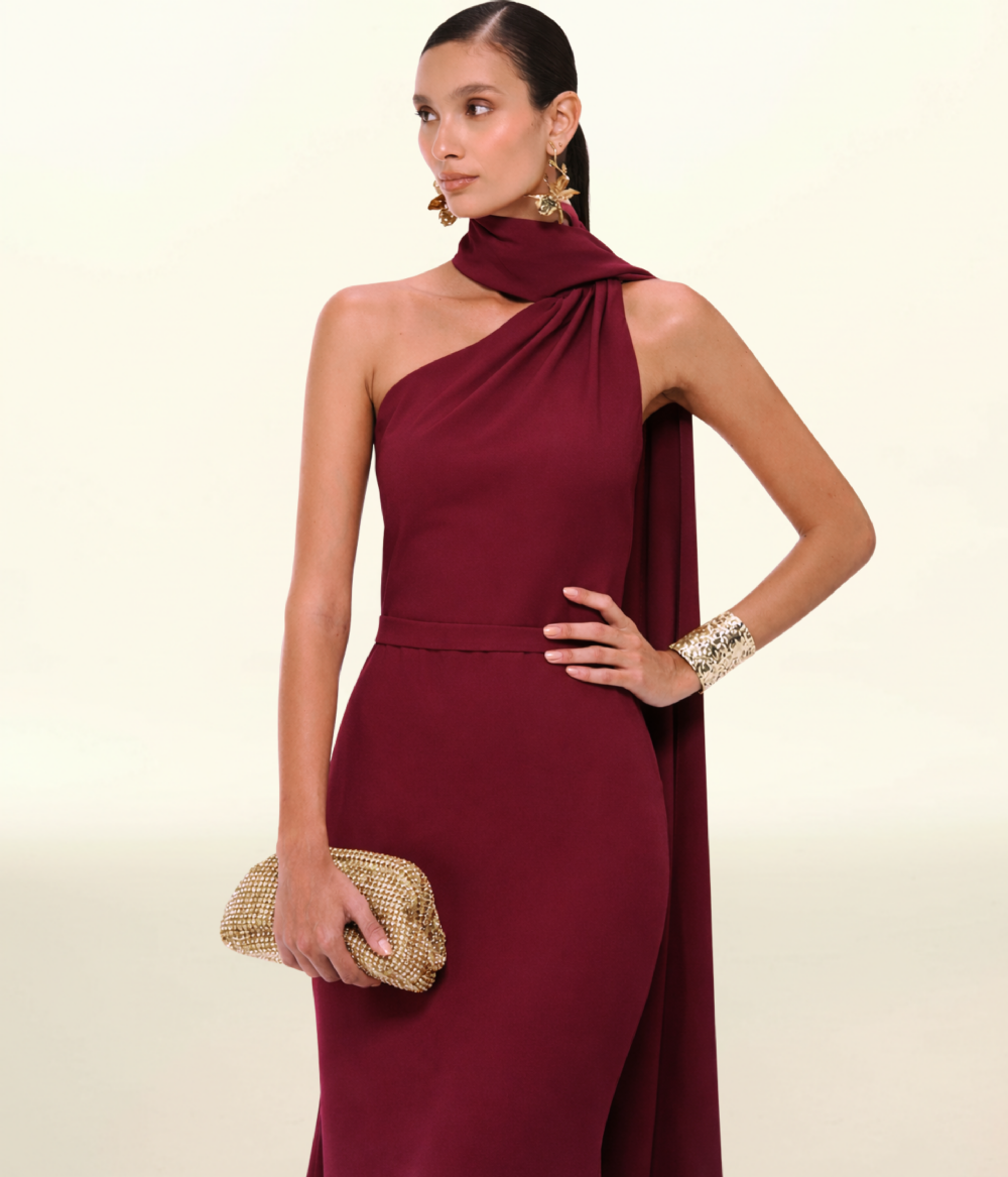Ideal para madrinhas de casamentos noturnos, convidadas de galas e eventos black-tie, onde tons quentes comandam presença. Estilize com rabo alto liso para acentuar assimetria, brincos statement dourados florais, pulseira larga texturizada e clutch rígida metálica — evite colares para exaltar decote e drape como protagonistas.