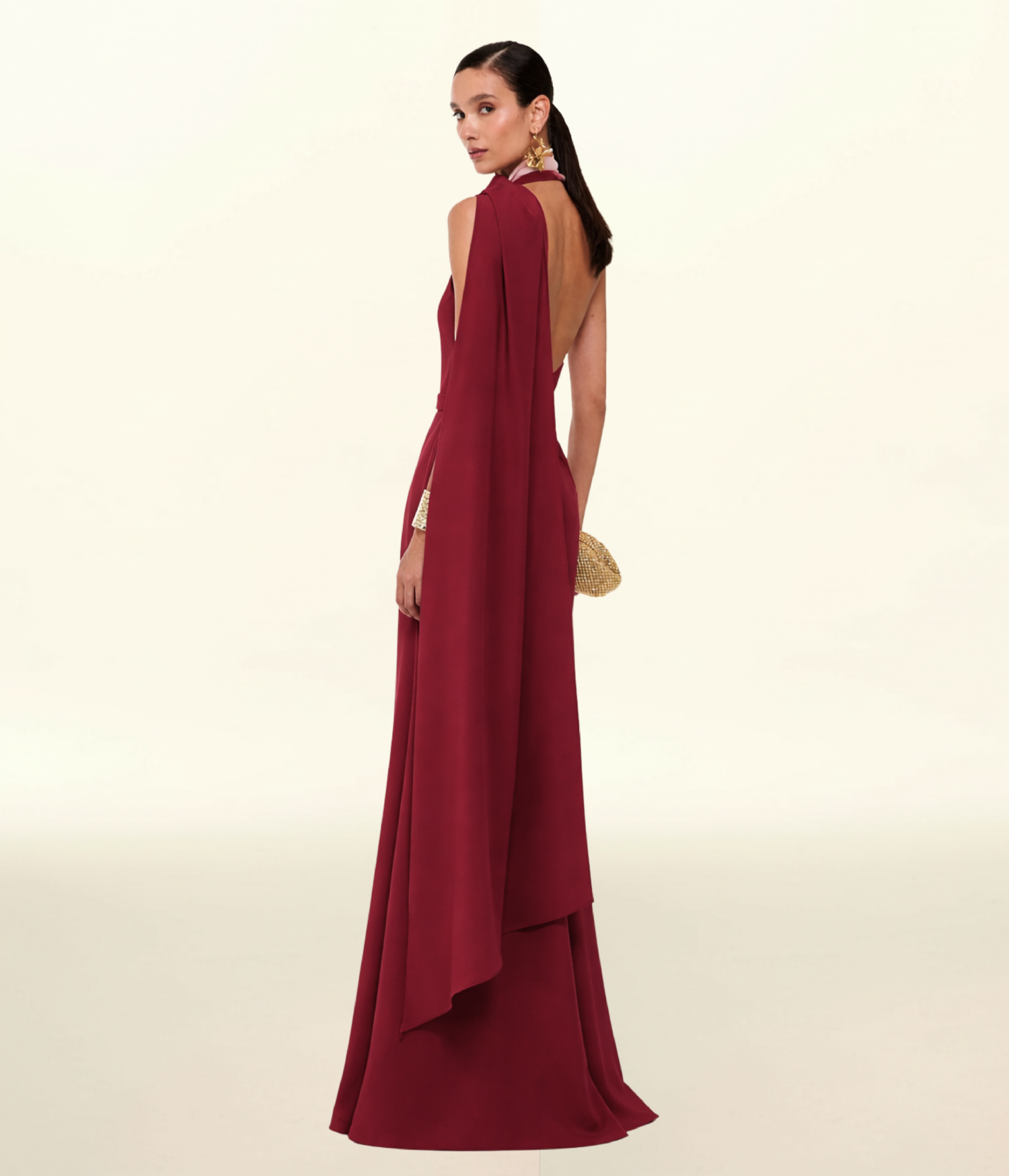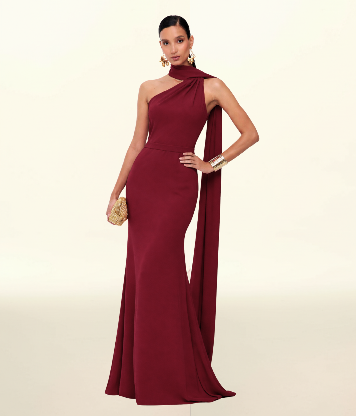 - Detalhes: One-shoulder drape cowl assimétrico com painel volumoso nas costas, fenda alta lateral, saia trumpet/mermaid ao chão