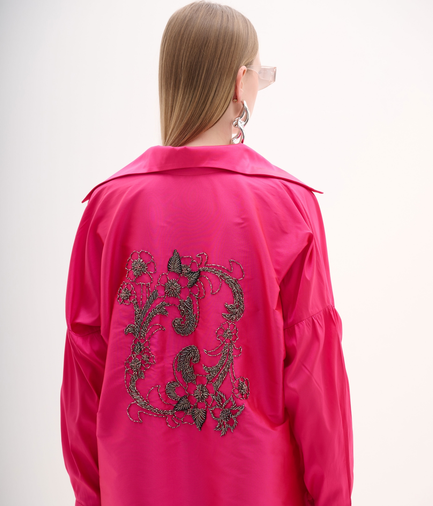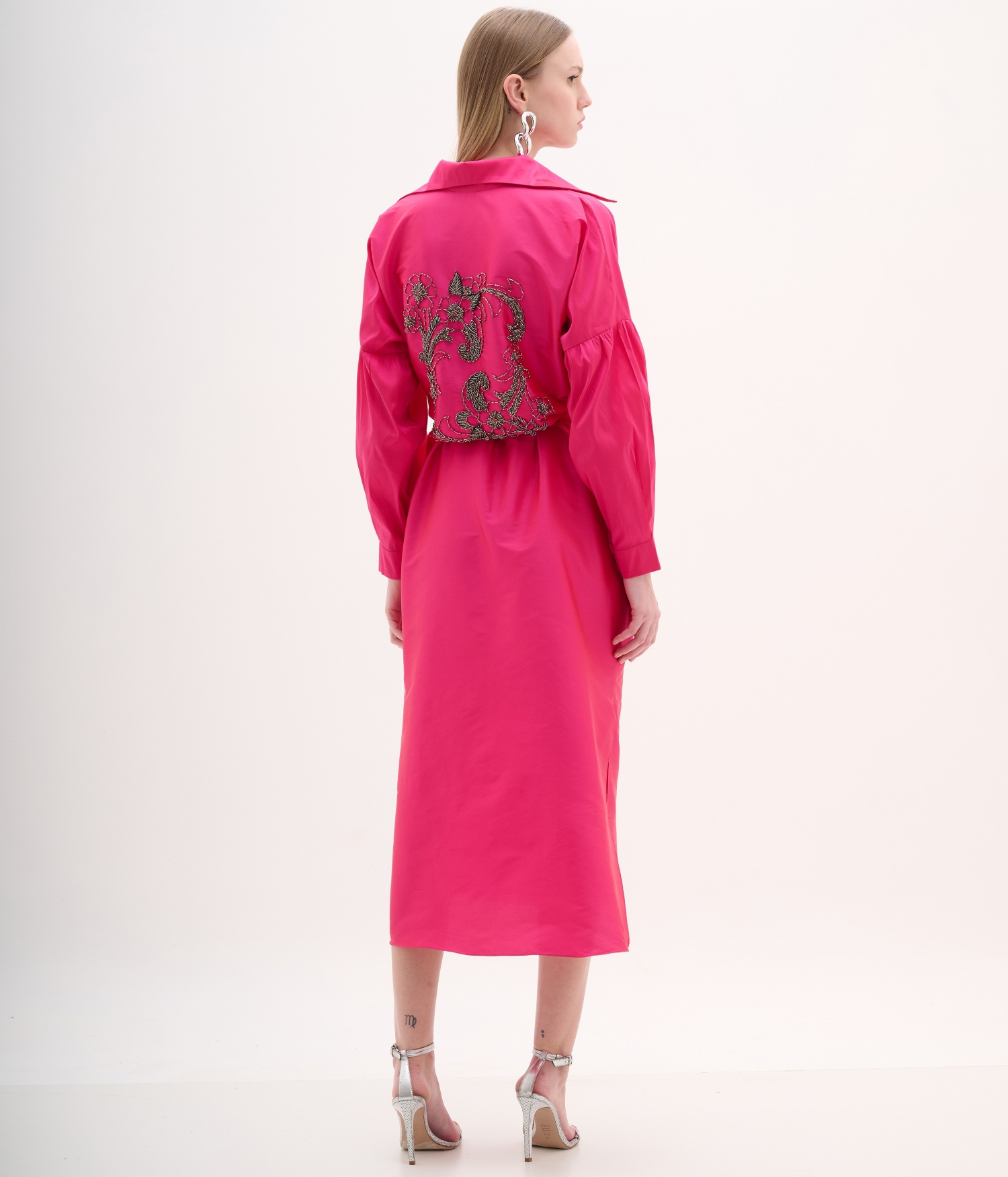 Chemise midi pink com design elegante e contemporâneo. A modelagem reta e alongada proporciona um visual minimalista com sofisticação, enquanto a gola clássica e os botões frontais mantêm a proposta atemporal da peça.