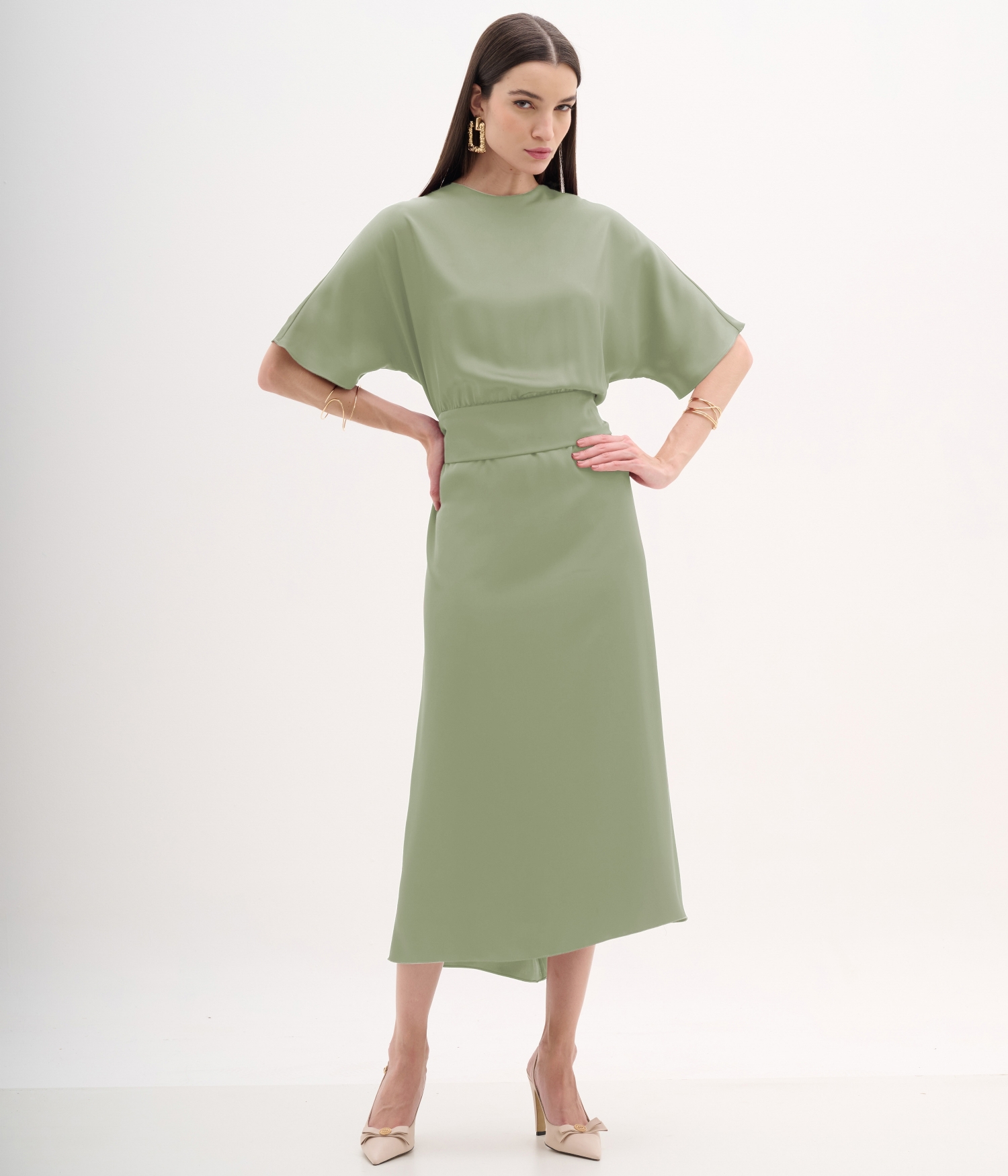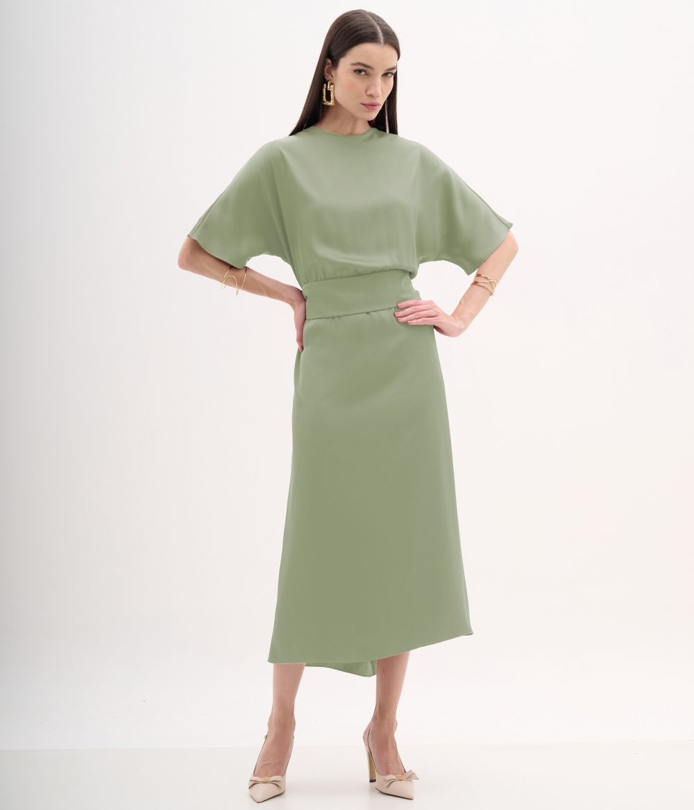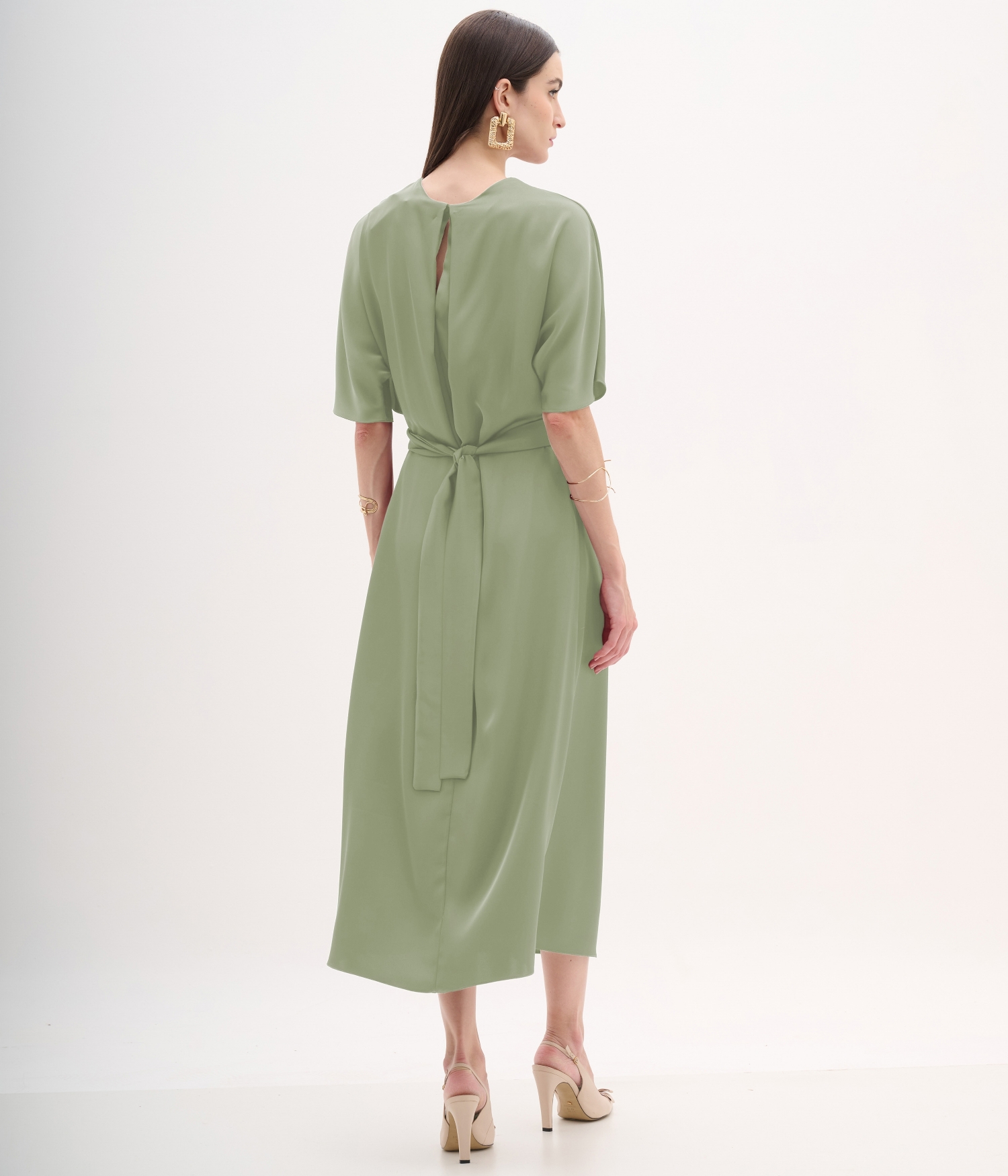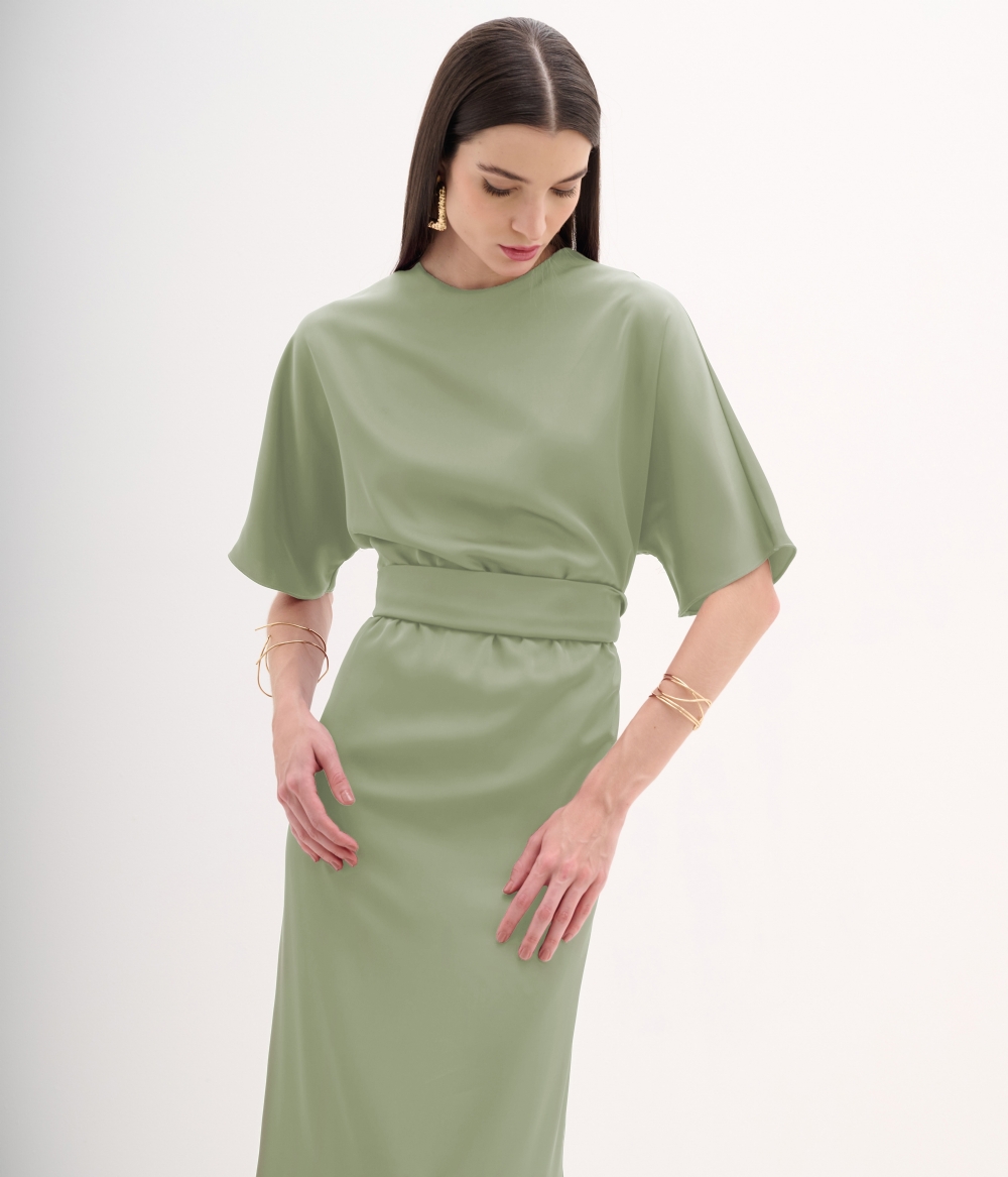 Vestido confeccionado em cetim com amarração sobreposta na cintura.